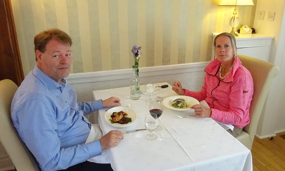 Ik rijd achter Douglas aan en al snel zitten we op de snelweg. Op een enorm bord staat een waarschuwing met ‘high risk for deer on road’. De weg is nog helemaal stil en leeg. Het is natuurlijk ook nog vroeg. We rijden langs de afslag Gullane. Daar gaan we vanmiddag lunchen bij La Potienere. Daar boekten we een tafel toen ik al zeker wist dat ik niet ging lopen. Qua tijd moet het allemaal wel passen om daar op tijd te zijn aangezien de run om 8 uur al start. Lekker vroeg dus.