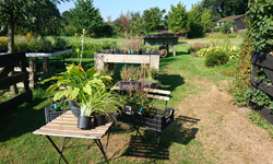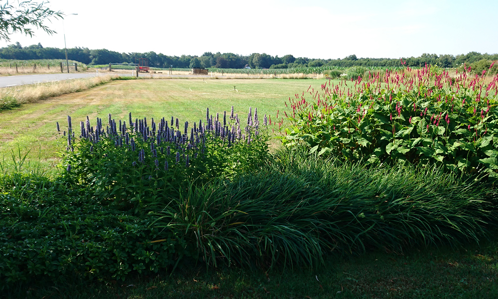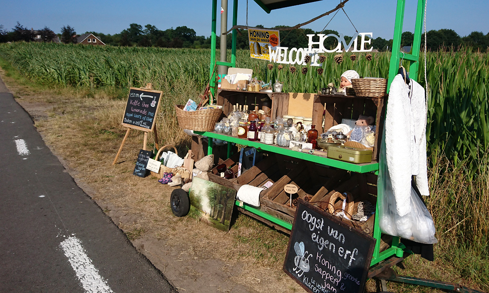 Ik hobbel rustig voort en besef dat ik er nog steeds niet ben…. Eerst nog even parallel aan de klarenweg lopen in de hoop op wat schaduw (nee) en daarna langs het stalletje met de zelfgemaakte spulletjes. Dat ziet er toch wel heel leuk uit. De vorige keer dat ik hier langs liep, raakte ik aan de praat met wandelaars en maakte ik geen foto meer. Verderop kijk ik even bij de plantjes die verkocht worden bij een kwekerijtje. Dat ziet er toch erg mooi uit zo met die bloeiende borders.