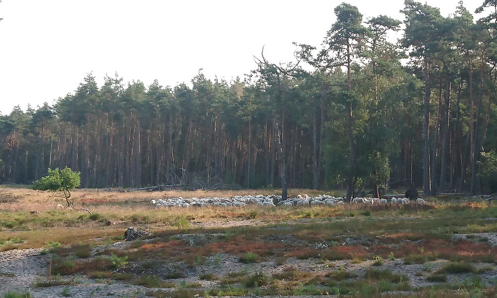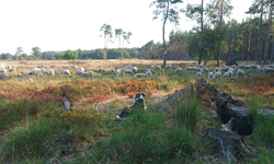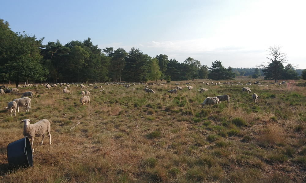 Het is al knetter warm maar ik loop rustig voort. Het gaat op zich wel goed maar het is toch best ver geloof ik. Want als ik weer rechtsaf sla, zie ik hoe ver het nog naar Hulshorst is. Niks aan te doen, ik zal toch verder moeten. Halverwege de heide zie ik ineens een grote kudde staan. Dat zal niet meevallen met deze warmte en ik ben benieuwd of er nog iets te eten is. Ik vraag of ik dichterbij mag komen en dat mag. Het blijkt een kudde van de Sallandse heuvelrug te zijn. Wat die hier nu doet weet ik niet, maar het is leuk om even met de herderin te praten en naar de honden te kijken. Eentje lijkt wel een Sealight hondje qua kleuren.