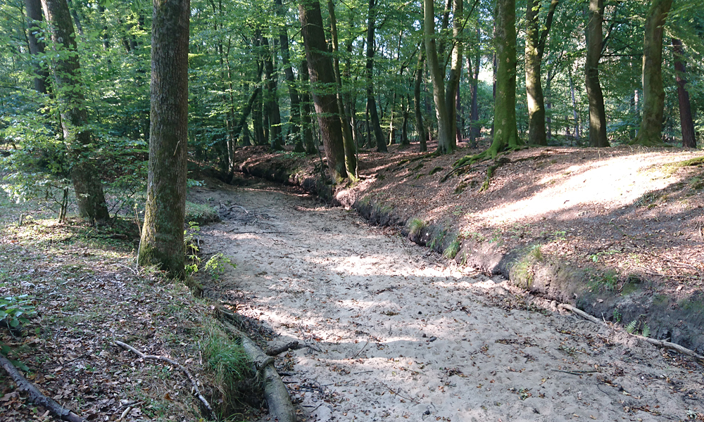 Ik blijf nog even kijken en loop daarna terug naar het fietspad en ga weer verder op pad. Het is nog wel een stukje en inmiddels is het ook weer warmer geworden natuurlijk. Aan het einde van het pad loop ik langs de leuvenumse Beek. Leeg! er is geen druppel water meer te bekennen. Zielig ijsvogeltje en arme visjes. Deze droogte is toch wel heel erg extreem zo te zien. Ik loop snel verder, steek de snelweg over e loop weer langs het oude stationnetje en de locomotief. Verderop sla ik weer linksaf richting landgoed Hulshorst en loop daar ook langs leegstaande beken.