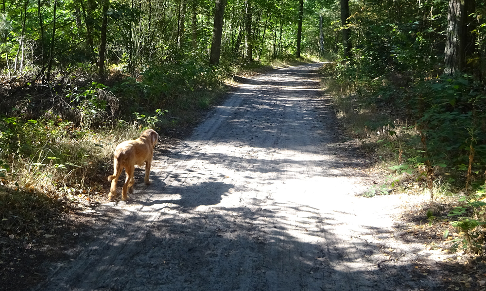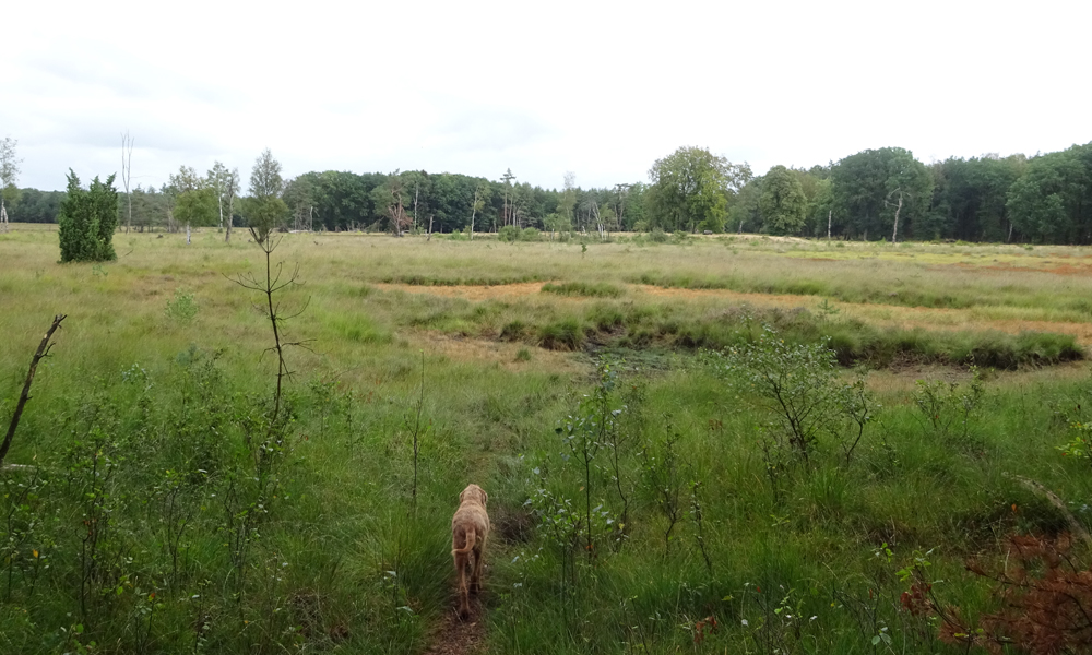 Gauw weg en verder het bos in richting de vennetje van het Ronde huis. daar staat zowaar nog water in maar woefje mag er niet in en ook niet uit drinken.
