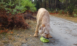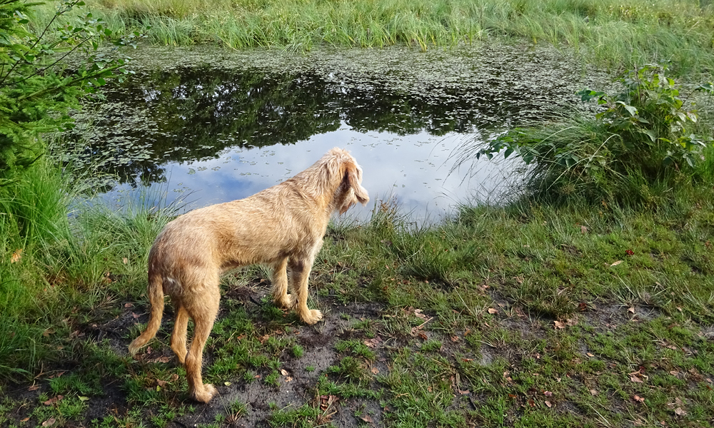 Ik hobbel door en besluit even naar het grootste vennetje te gaan. Woefje vindt het meteen leuk en loopt het water in. Dat is op zich best ware het niet dat ze ergens denkt eruit te kunnen komen en zo de modder in loopt waar ze met moeite weer uit komt. Ze schrikt ervan en komt met moeite het water uit op een rare steile plek. Ze ziet er niet uit en stinkt een uur in de wind. Dat was niet de bedoeling en ze wil ook het water niet meer in. Straks even de Waschkolk dan maar in.