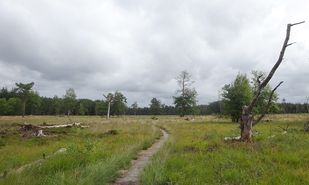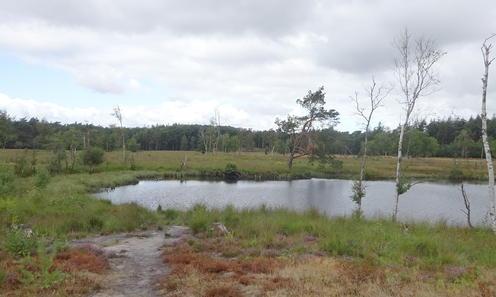 Ik weet deels de weg gelukkig en weet zelfs waar ik linksaf moet slaan richting het Mosterdveen. Dat valt niet tegen eigenlijk. Vorige keer moest ik echt nog op de kaart kijken. Maar nu loop ik er zo heen en herken ik het ook. Niet rechtsaf want dan kom ik bij Samoza maar linksaf. dar zijn ook al de eerste vennetjes te zien. Het blijft mooi hier. Her en der doet de heide zijn best om paars te bloeien ondanks de droogte.