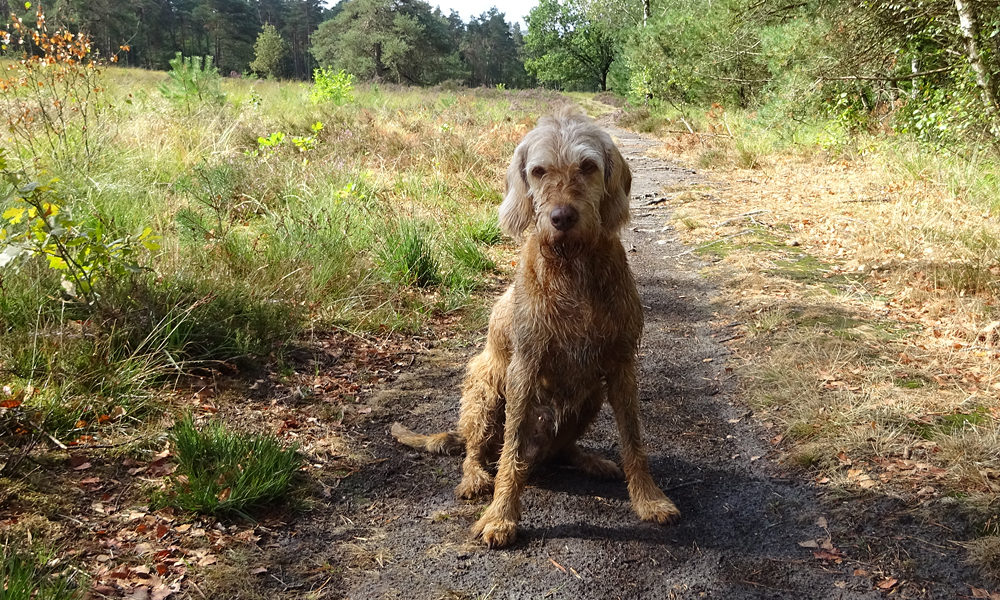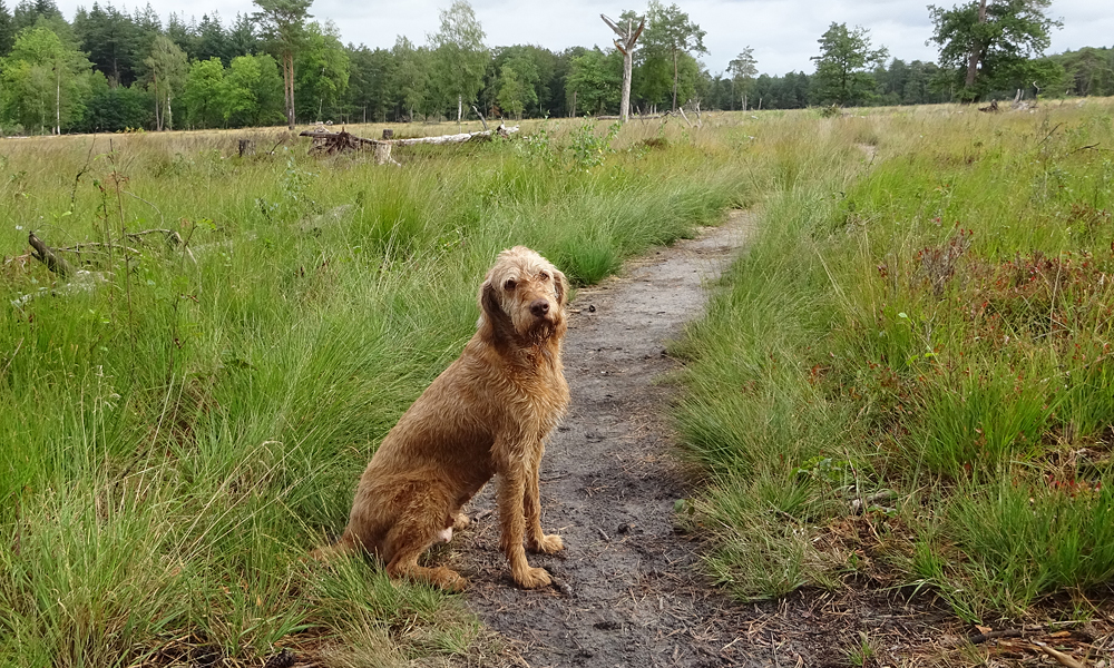 Na het poedelen en wassen lopen we weer verder. Ik weet gelukkig de weg en woefje ook. Het is niet meer zo ver maar de route zal toch wel ruim 13 km worden en dat is best weer een eind voor woef. Gelukkig doet ze het goed en zo na de badderpartij lijkt ze er weer even tegen te kunnen. Ze krijgt weer wat vers water op het laatste stukje en dat doet haar ook goed. Het is inmiddels best warm. Bij de vennetjes neem ik even een andere route en verdwaal ik alsnog bijna zo zonder kaart maar gelukkig loop ik al snel weer langs het vennetje van het ronde huis. Nu op naar de auto! na ruim 13 km staan we weer bij de auto moe maar voldaan. Dit zijn toch weer de leuke dingen zo samen!