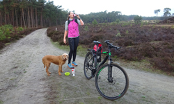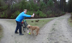 We lopen ons bekende rondje langs het hek en daarna langs de heide. Daar krijgt woefje wat water. Ik ook gelukkig. Ik neem het zelf niet zo vaak mee voor mezelf maar wel altijd voor woef natuurlijk. Ze is gewend om elke 4 a 5 kilometer wat aangeboden te krijgen. Soms wil ze dat wel, een beetje afhankelijk van het weer.