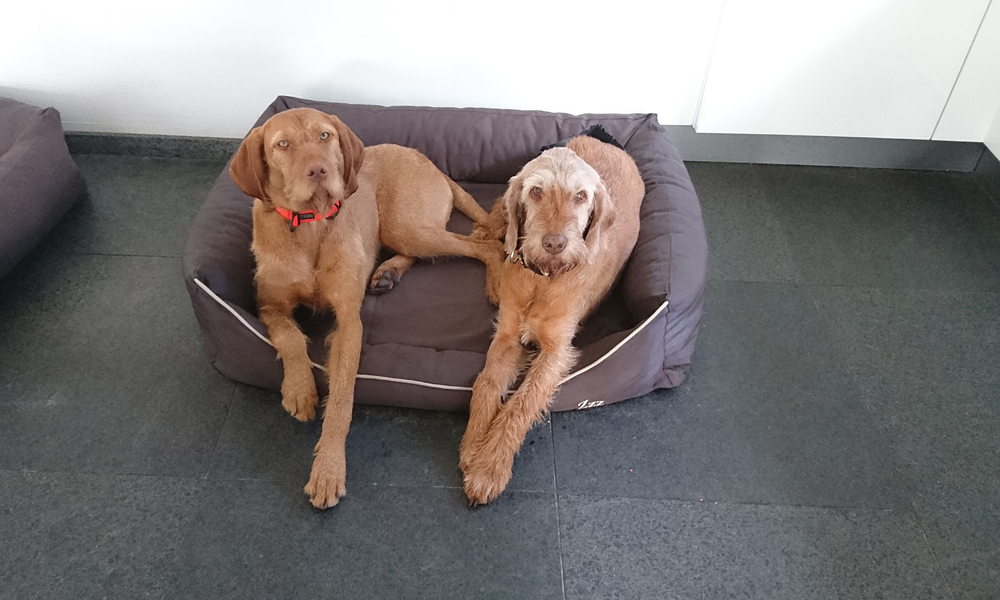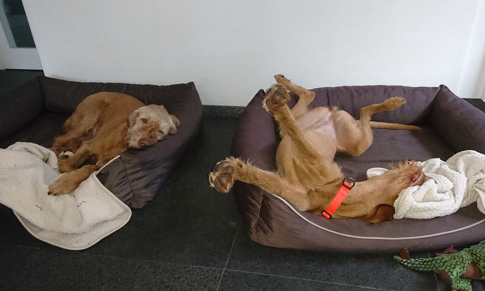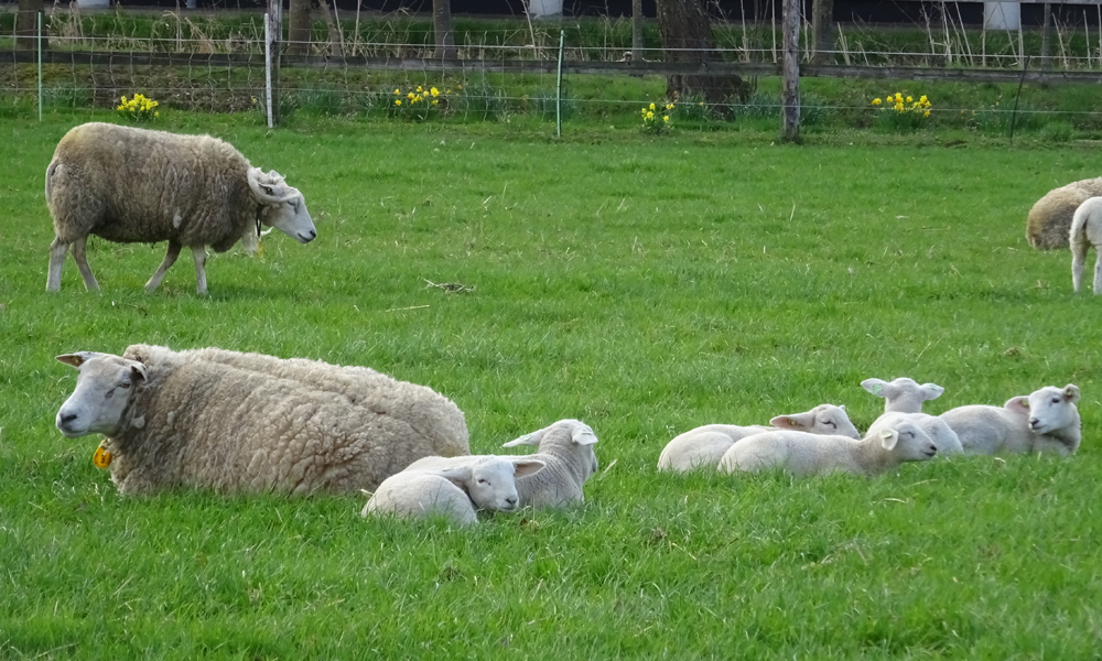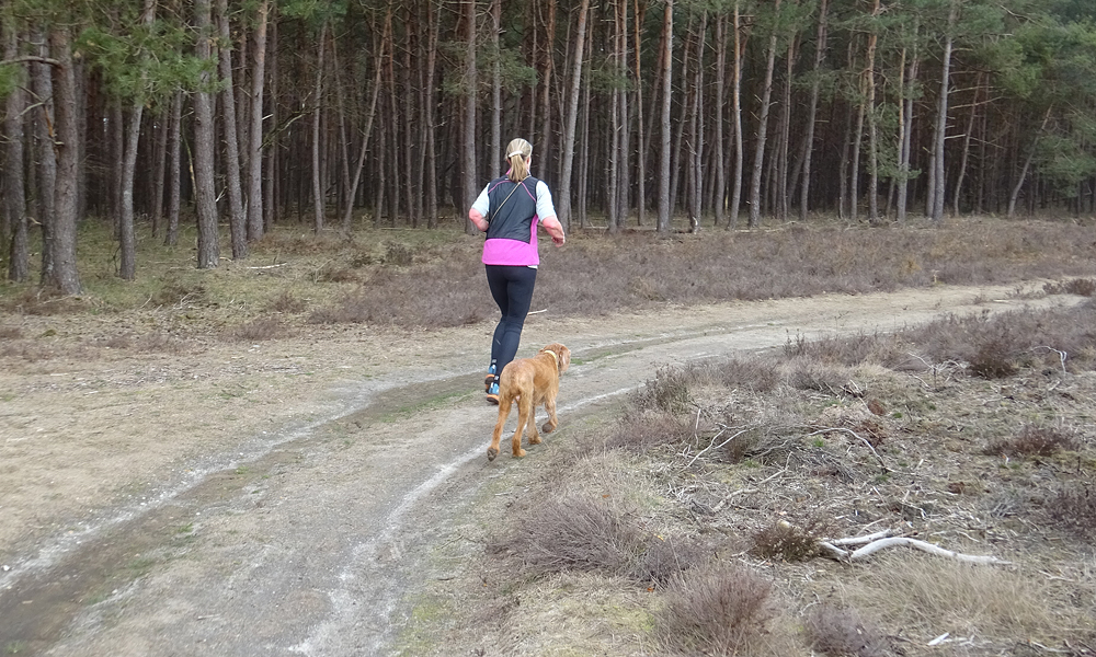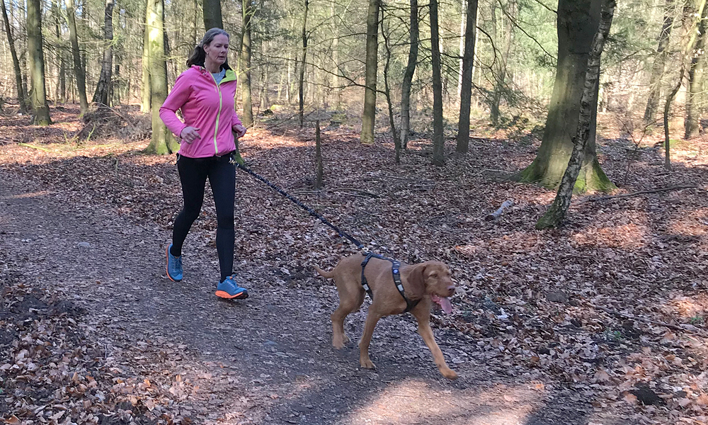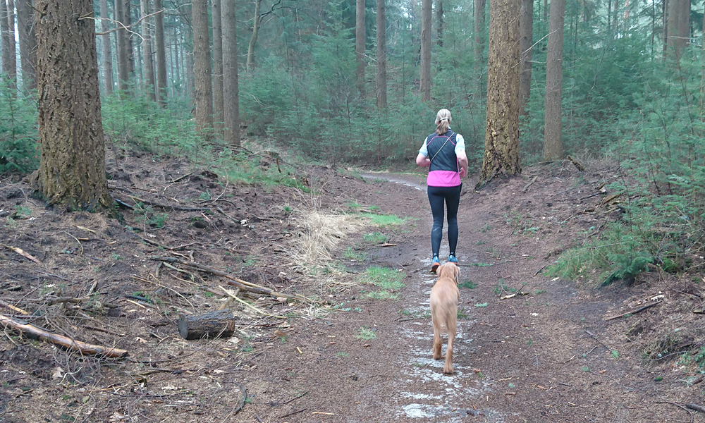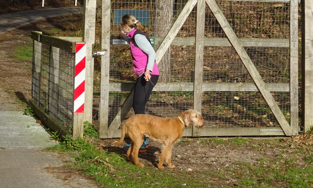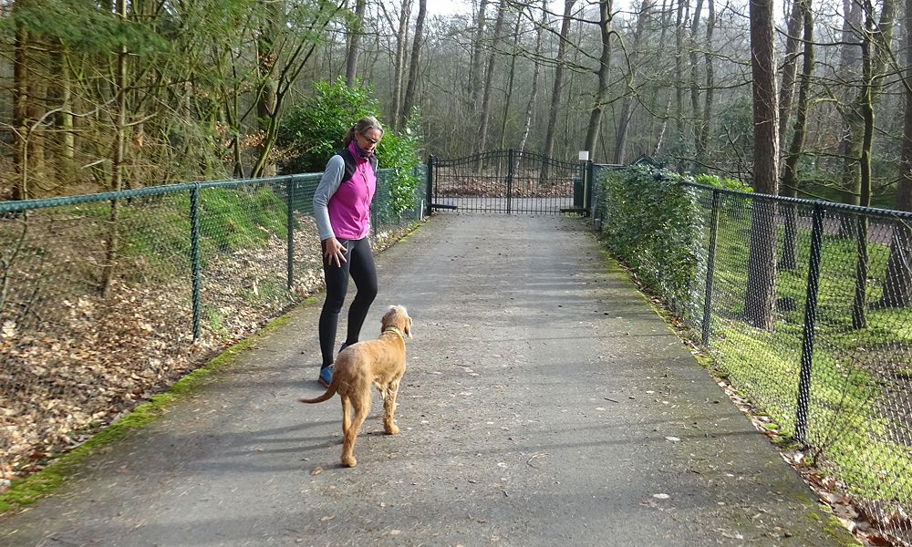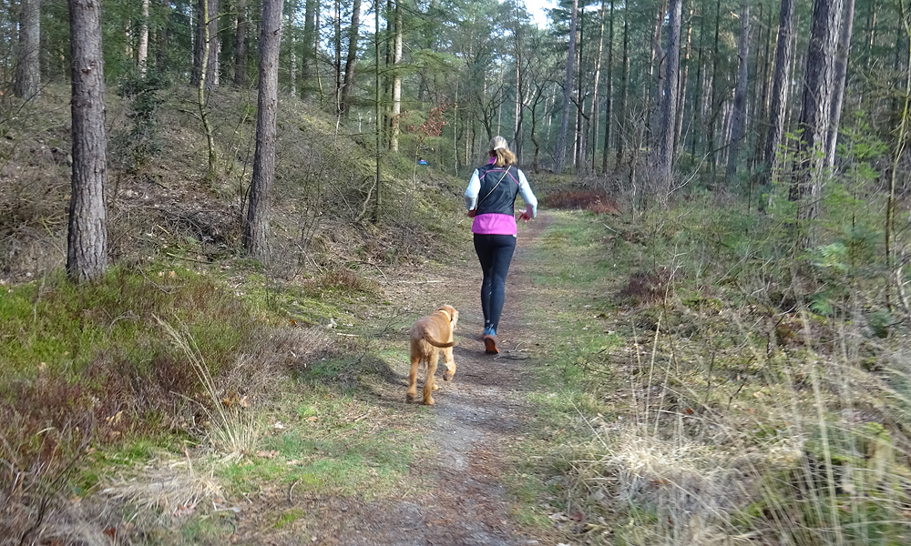 Na ruim 15 km staan we weer voor de deur. Ik ben tevreden over het lopen, het was lekker weer. Nu gauw de tuin in en even snel wat eten. Op naar de volgende ronde. Als Fleur nou eens iets ging eten dan kan ze ook weer mee!