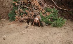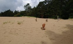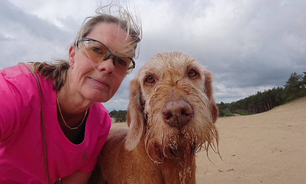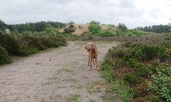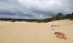 Aan het einde van de route nemen we nog even een stukje over het zand. Niet via het uitkijk punt maar eentje eerder waar we makkelijk op het zand kunnen komen. De lucht is inmiddels prachtig met een beetje dreigende wolken. Het is echt een feestje met mijn blije hondje. Ik maak wat foto’s maar ze heeft veel meer zin om alles te gaan verkennen en loopt zelfs naar een soort hol en gaat daar naar binnen. Gekke hond.