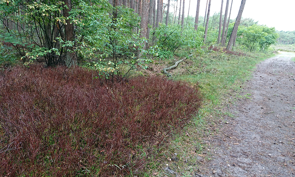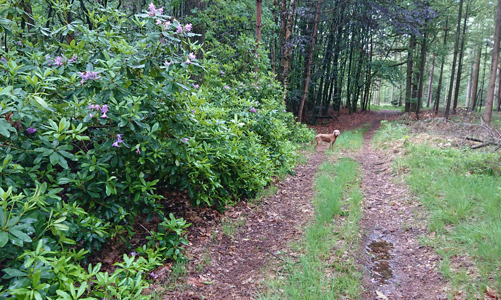 Omdat woefje wat heeft kunnen drinken, neem ik de langere route en loop ik weer langs de mooie rododendrons. Hier liep ik een tijd geleden ook met woefje. het lopen gaat prima en woef loopt eigenlijk het hele stuk alleen maar voor me uit. Gekke hond.