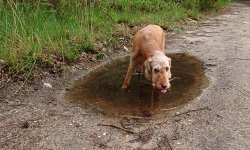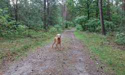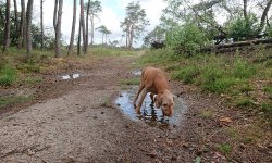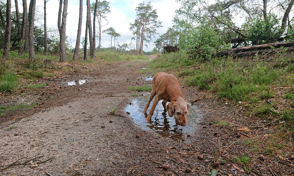 Vandaag is het weer de beurt aan Ziva om lekker mee te gaan voor een rondje. Ze is vrolijk en fit dus dat komt goed uit. Ik hoef niet per se een lange ronde vandaag dus ik neem niets mee en vertrek na onze wandeling. Ik hobbel over de paden met woefje die lekker los loopt. Heel anders dan met Fleur die aan mij vast zit met haar tuigje. Dit loopt ook erg fijn natuurlijk en woefje heeft het maar makkelijk met haar eigen tempo en snuffel momenten! Ik denk toch dat dit zo gegroeid is doordat we samen steeds op pad waren en vooral doordat we meteen al op vreemd terrein hebben gelopen samen. Ik was veel op pad met haar en logeerde ook wel eens in een hotel. Die gebieden kende ze natuurlijk niet en zo leerde ze al snel om bij me te blijven. Ik moet dat misschien ook met Fleur gaan oefenen. Er is hier in de buurt nog een losloop gebied en ook in de polder kan ik terecht volgens mij. Toch even in verdiepen want alleen maar aan die trekriem is ook niet alles denk ik. Genoeg te doen dus nog! het heeft flink geregend in de nacht en inmiddels liggen er eindelijk her en der plassen. Goed voor de planten want we sproeien ons rot. Gelukkig kan Ziva dus even drinken onderweg want de plassen zijn vers van vannacht en dat is prima drinkwater.