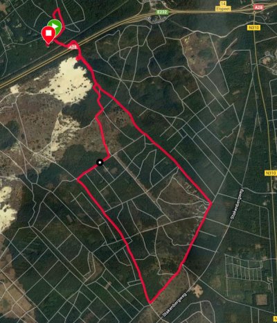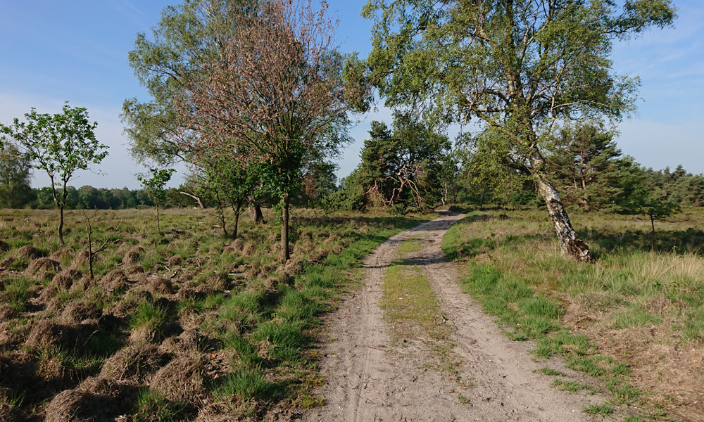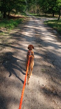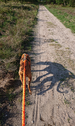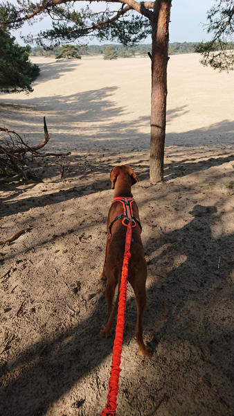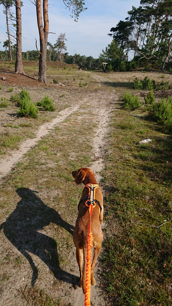 We hobbelen op aardig tempo voort door het bos en even later over de heide. Ik kom geen kip tegen eigenlijk en dat is op zich ook prima trouwens. Inmiddels gaat het passeren van fietsers ook goed gelukkig maar mensen komen we niet veel tegen om te oefenen. Helemaal aan het einde van de heide kom ik een groepje vrijwilligers tegen van natuurmonumenten waarvan er eentje roept dat het zo wel makkelijk is met die hond voor me aan de riem. Dacht het niet maar goed. Ik moet niet alleen lopen maar ook nog eens goed opletten.