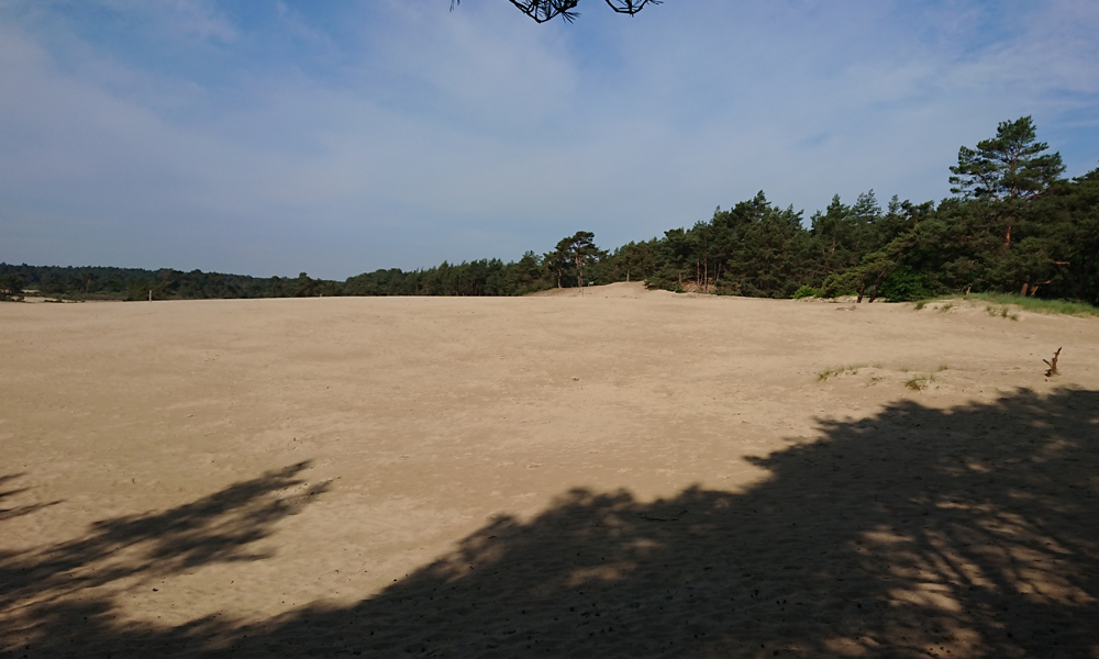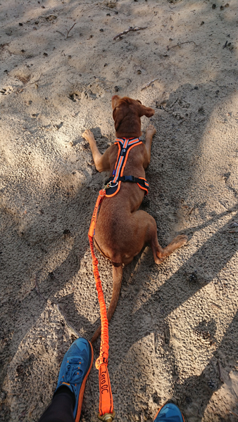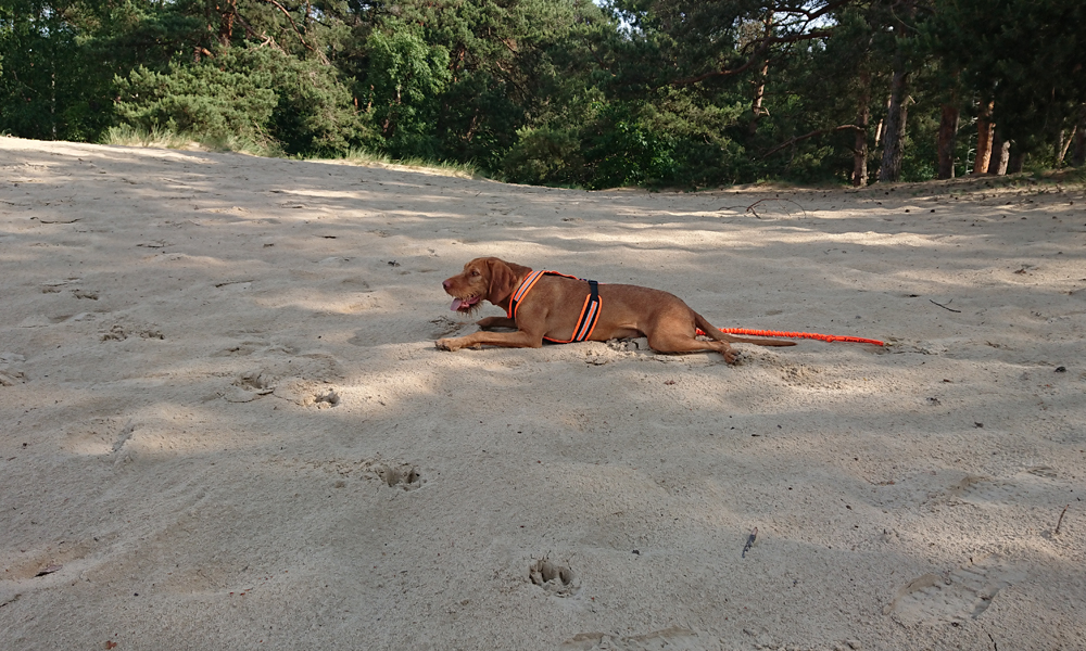 Als we aan het einde van de route zijn, lopen we nog even naar de zandverstuiving voor een foto. Daar is ze volgens mij nog niet eerder geweest. Deze keer is ze duidelijk moe want ze gaat meteen in het warme zand liggen. Ze geeft onderweg dus nog niet echt aan of ze moe is want ik merk niks. Goed op letten dus!