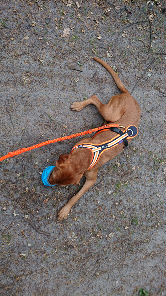 De route is rustig en het loopt verder allemaal prima. Na 4 kilometer stop ik even en wil Fleur ook graag wat water dus dat leert ze ook inmiddels wel kennelijk. Het is meteen even een korte rustpauze. Het harnasje van mij loopt nog steeds prima eigenlijk. Dat de trekriem van Fleur nu gewoon van links naar rechts kan bewegen voor me uit is heerlijk en ze loopt ook net iets verder weg van me.