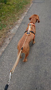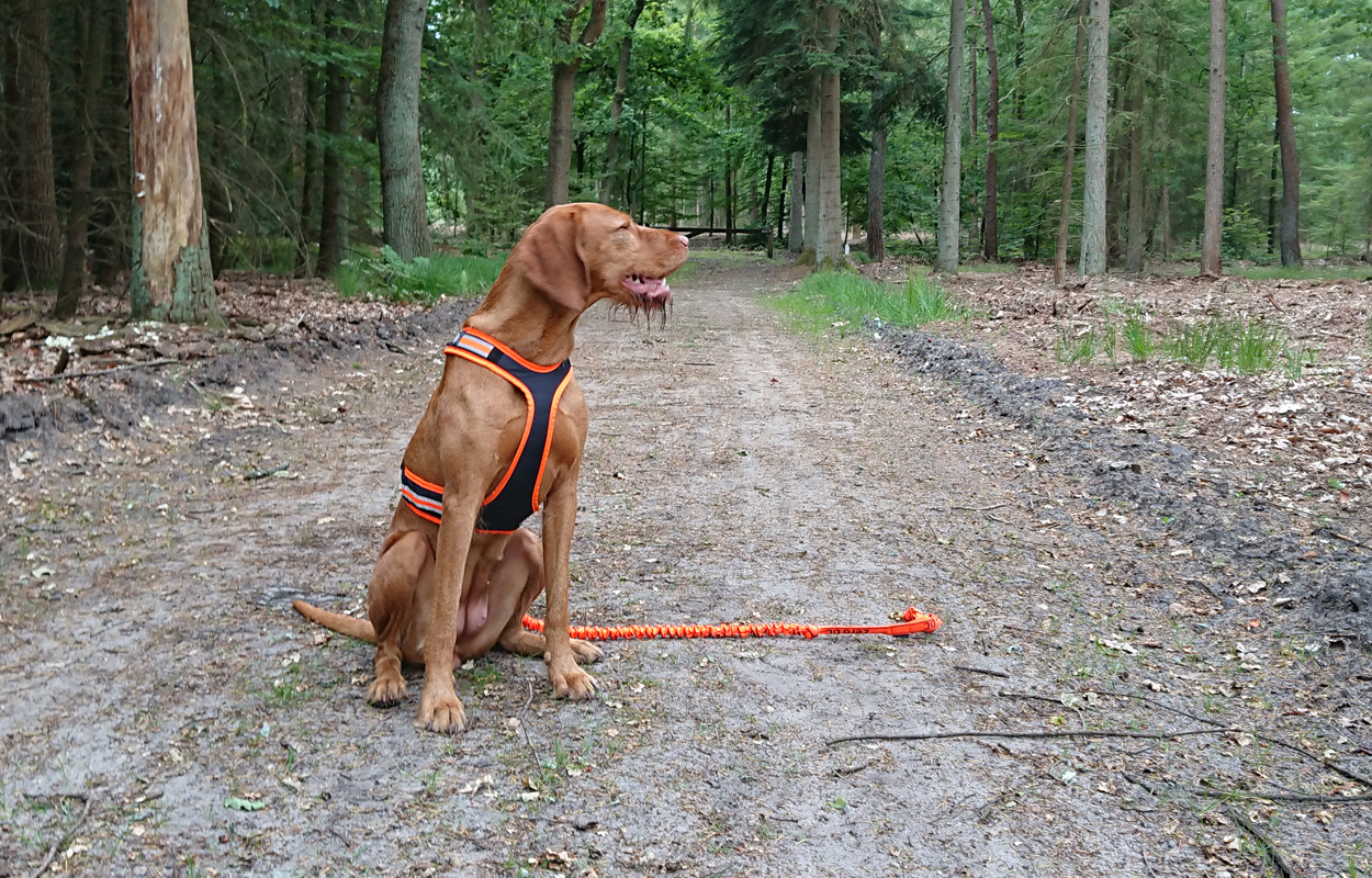 Vandaag ga ik weer met Fleur op pad. Ik heb niet meer met haar gelopen sinds de valpartij van vrijdag. Dat is alweer 10 dagen geleden notabene maar inmiddels gaat het toch weer wat beter gelukkig. Ik heb in de tussentijd dus wel zelf gelopen maar relatief korte stukjes. Afgelopen zaterdag waren we in Zeewolde even bij de stand van Rundog om naar een nieuw harnasje voor mij te kijken en ook voor Fleur eventueel maar dat was allemaal eigenlijk niets. Ze vond het overigens allemaal best wat we haar aantrokken en was rustig. Vandaag ga ik dus op pad met mijn nieuwe harnasje. Een soort broekje dat nog lager de druk verdeelt dan de Beeztees. Ik heb even getwijfeld over een andere gordel die toch wat hoger zit en wat meer ruimte heeft om iets mee te nemen maar na veel wikken en ween hield ik het toch bij het broekje. Vandaag dus proberen tijdens dit rondje. Het trekt heel gemakkelijk aan en kan daarna makkelijk goed worden gesteld qua riempjes in de liezen. Ik heb ze niet strak omdat Fleur niet als een idioot trekt. Zal mij benieuwen. We lopen door het hek waar we meteen op de buurvrouw stuiten die wat verrast opkijkt als ze mijn hondje in haar oranje tuigje ziet. Daarna kunnen we op pad en ik begin eigenlijk meteen. Even voor het spoor wordt net met een kraantje gewerkt en worden rollen gras naast de weg gelegd. dat vindt Fleur enorm eng en daarom besteed ik even veel tijd hieraan zodat ze gewoon zonder angst erheen durft uiteindelijk. Ondertussen loopt de tijd door en ik vind het wel een grap want ik ben benieuwd waar we uiteindelijk samen gaan uitkomen ondanks dit gedoe. Daarna steken we het spoor over en lopen naar de parkeerplaats. Het begin is even wat rommelig omdat ze een paar keer stopt en niet echt lekker soepel meeloopt. Er springen twee hertendames ineens over de weg. Hier zou ik het niet snel verwacht hebben want we zijn nog maar net op pad maar het is een schitterend gezicht. Fleur is ook meteen wakker. Zodra ik rechtsaf het bos daarna inloop is ze weer helemaal happy en loopt prima voor me uit. Ik loop nu eigenlijk tegengesteld aan wat ik normaal loop en dat is prima voor nu. Ik durf niet meer langs het hek momenteel want ik val geheid weer over de wortels daar. Via dit pad komen we daar ook dus dat is best. Fleur gaat nog even poepen. Gelukkig doet ze dat dus gewoon ondanks het tuig. Daarna loopt ze ook nog rustiger en beter mee dus misschien was dat het. Ze had toch echt al gepoept maar ja…. Fleur is Fleur natuurlijk.