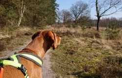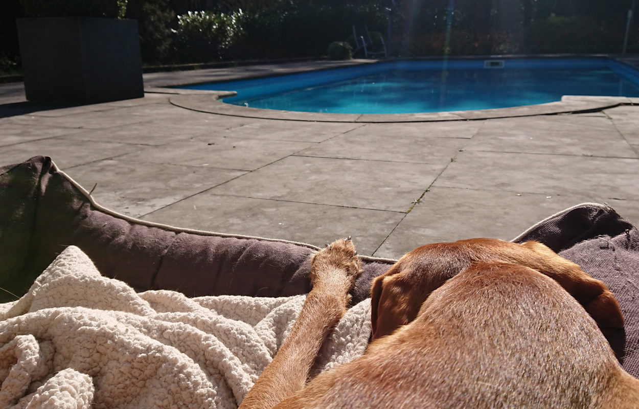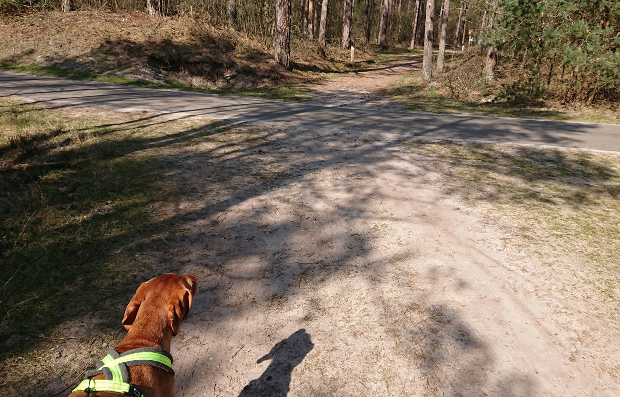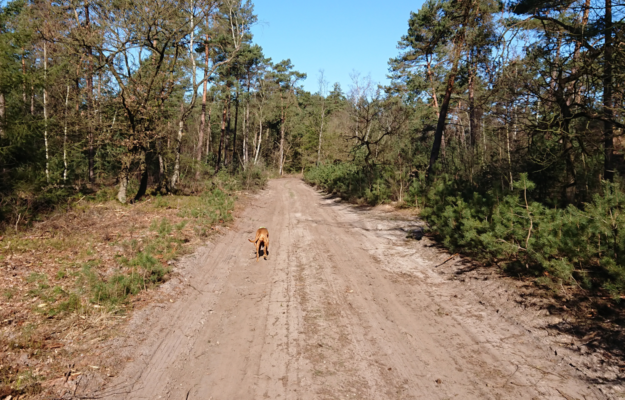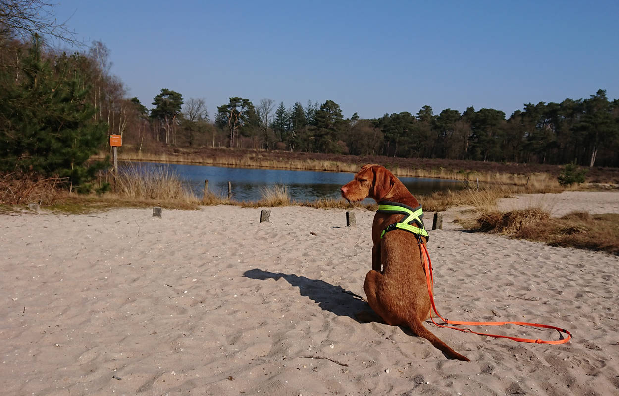 Vandaag weer een stralende dag. Wat boffen we zeg! S. deed het eerste plas rondje al met Fleur en ik ga dus later op pad voor een leuke ronde. Vandaag ga ik weer eens een andere route proberen. Ze is hartstikke braaf dus het is ook echt leuk om een beetje te omgeving verder te verkennen. Ziva was natuurlijk toch alweer wat ouder toen we hier kwamen wonen en het laatste jaar durfde ik niet meer zo goed zomaar te gaan lopen met het risico dat we te ver af zouden dwalen. Grappig genoeg zie ik bij het zoeken naar de foto’s van vandaag dat ik vorig jaaar ook lekker gelopen heb met Ziva, dat het mooi weer was en dat we net begonnen waren met het zwembad zomerklaar te maken nadat de oude bewoners het groen hadden laten worden. Op de foto’s onderaan dit postje zie je het verschil. Andere hond, andere kleur water! Het begin van de route ken ik natuurlijk gewoon. Ik wandel eerst even aan de overkant met haar en loop daarna richting het spoor en de snelweg. Daar steek ik over en neem het smalle pad direct langs de zandverstuiving en het hek. Deze keer dus niet eerst naar het uitzichtspunt en dat is even wennen voor Fleur want ze wil aanvankelijk daarheen. Opletten dus en lekker meelopen! Daarna hobbelen we over het smalle pad en lopen over het zand naar de parkeerplaats bij de Klarenweg.