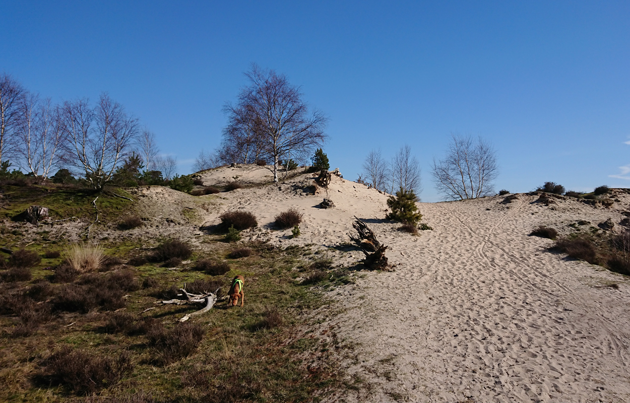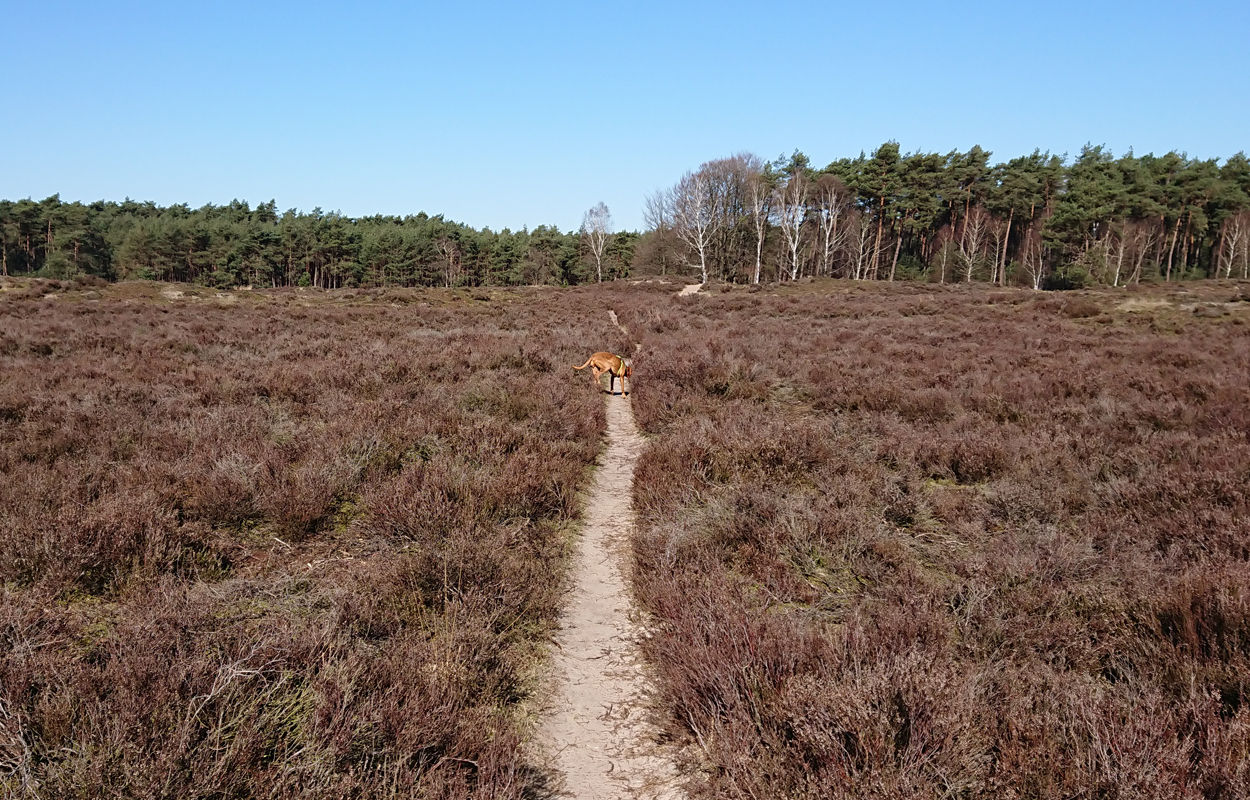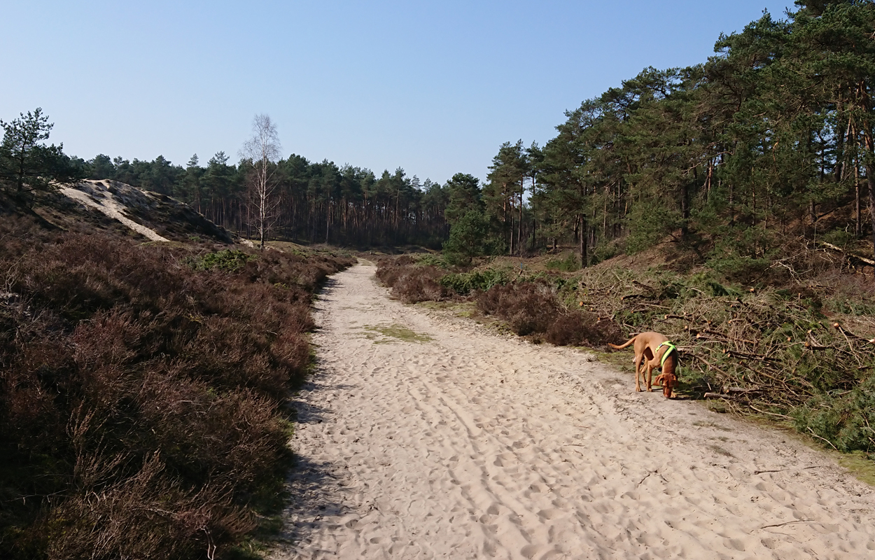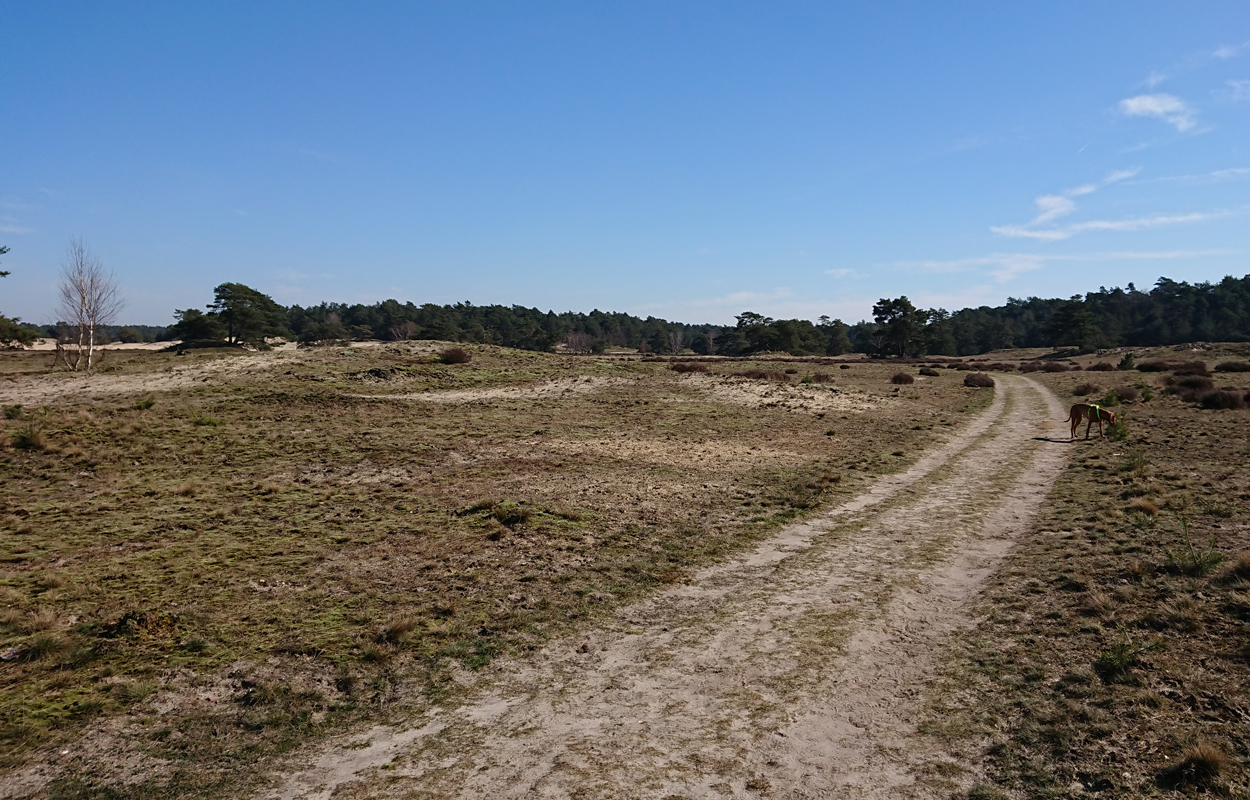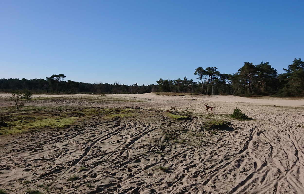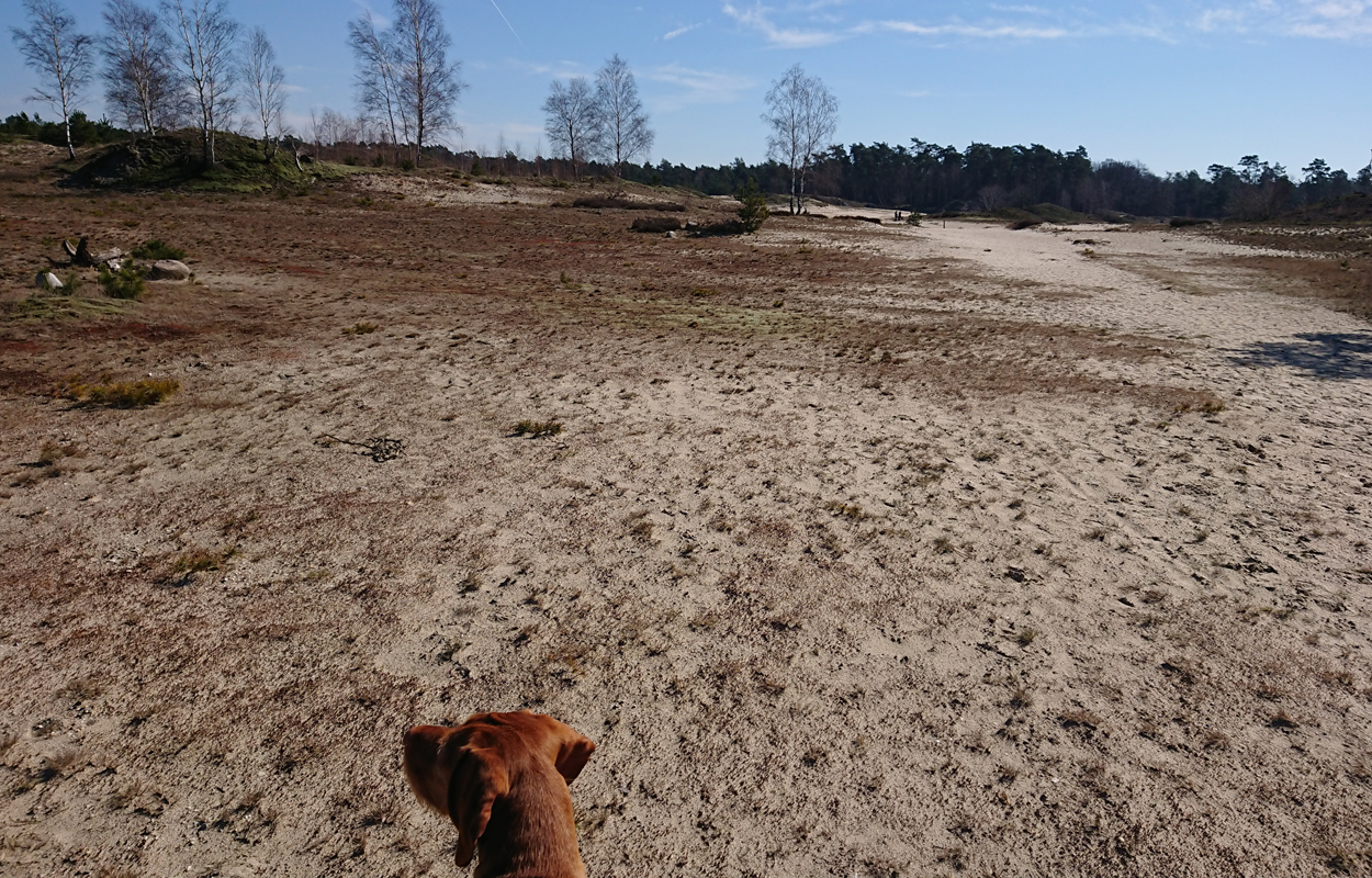 Ik besluit niet helemaal door te lopen richting de Leuvenumsebeek maar linksaf te slaan. Ik zie ergens fietsers rijden dus er is een goed pad denk ik. Ik hobbel door en kijk ook vaak even op de kaart waar ik eigenlijk heen ga en moet. Ik wil niet verzanden op het zand hahaha. Het is enorm uitgestrekt en leeg hier. Heel on Nederlands eigenlijk als je om je heen kijkt. Meestal kan je niet ver kijken of zie je wel weer een weg of auto’s. Als ik rechtsaf wil slaan, zie ik de lopers weer aankomen en daardoor zie ik niet de dame die verderop op het zand zit te mediteren in de zon. Fleur ziet haar wel helaas. Ik roep haar terug en ze komt keurig weer aangerend (braaf) maar de dame is boos en was al opgestaan en is enorm aan het schelden. Ik hoor dat niet door de wind die de andere kant op staat maar iik roep wel mijn excuses. De dame gaat maar door met tieren waarop ik uiteindelijk maar zeg dat ze misschien nog even door moet mediteren. Dat hoort zij blijkbaar wel want vervolgens krijg ik keihard ‘are you fakking kidding me’ naar mijn hoofd geslingerd. Dat hoor ik dus wel. Ik hoor nog iets over Staatsbosbeheer en praten en omdat ik geen zin hem om pontificaal gedeeld te worden op social media als zo’n asociaal met loslopende hond (want ik was immers fout) loop ik de andere kant maar op. Zucht. Stom gedoe. Natuurlijk was ik fout met loslopende hond, maar ze kwam keurig terug en ik bood al mijn excuses aan dus meer kan ik niet echt doen behalve doorlopen.