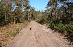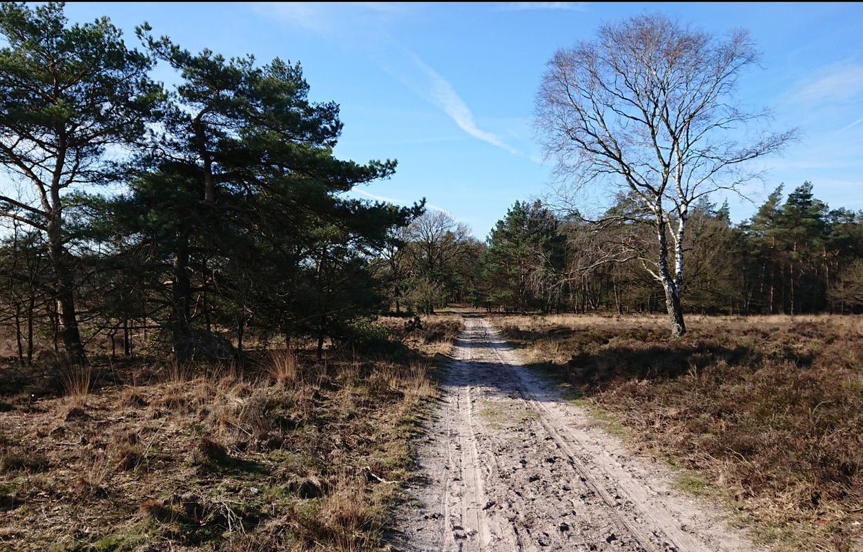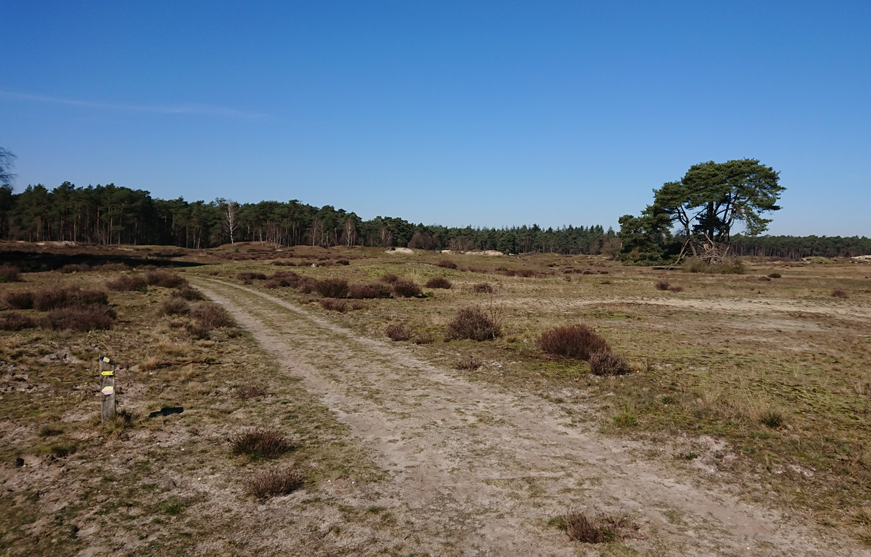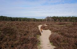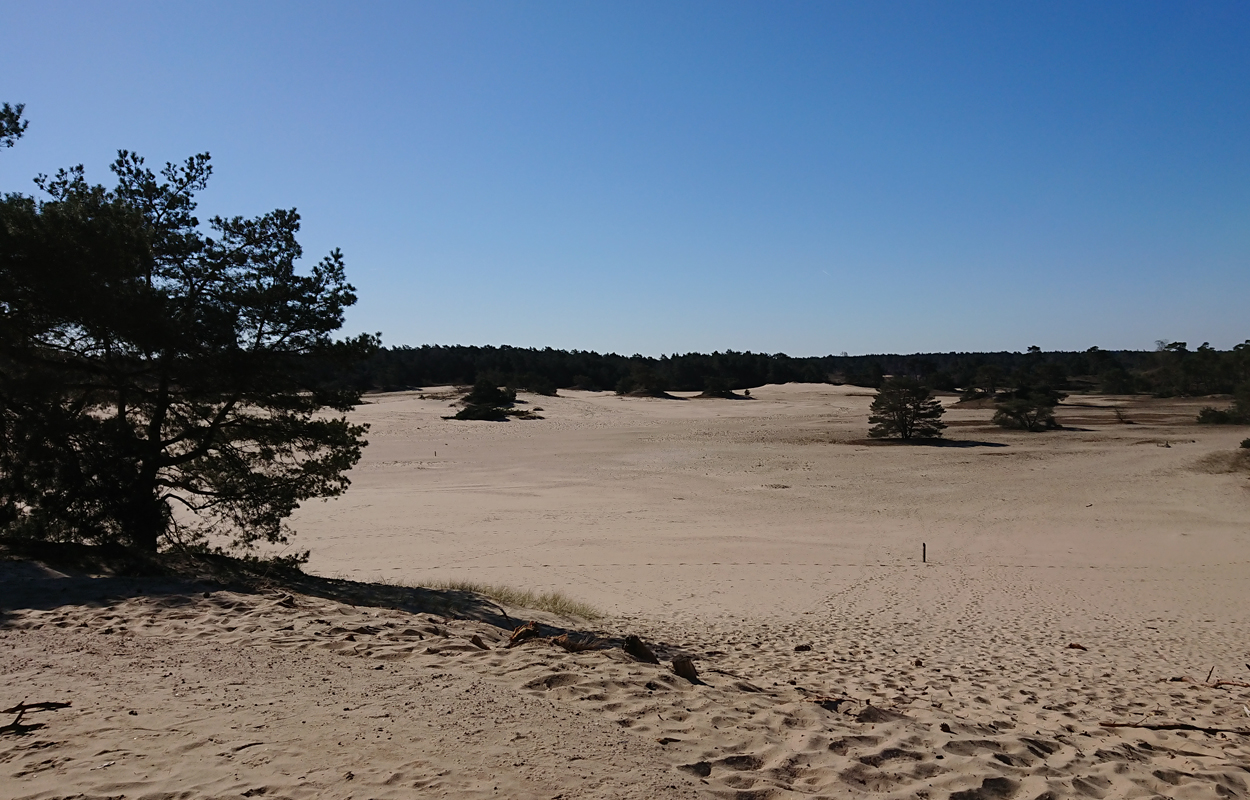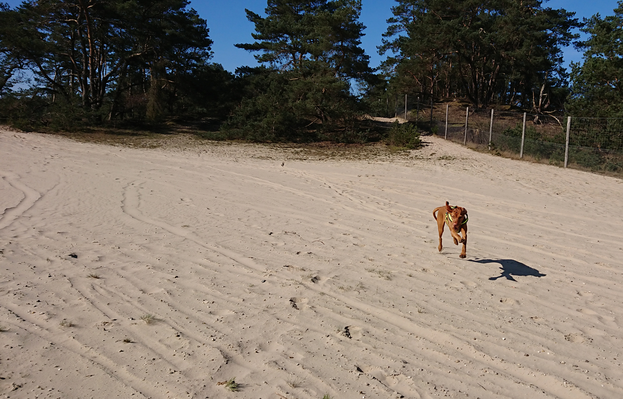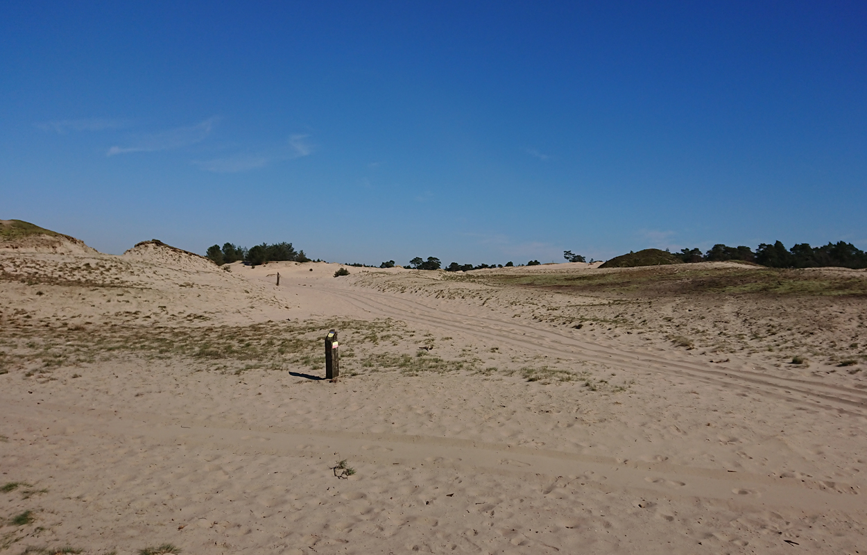 Ik besluit niet helemaal door te lopen richting de Leuvenumsebeek maar linksaf te slaan. Ik zie ergens fietsers rijden dus er is een goed pad denk ik. Ik hobbel door en kijk ook vaak even op de kaart waar ik eigenlijk heen ga en moet. Ik wil niet verzanden op het zand hahaha. Het is enorm uitgestrekt en leeg hier. Heel on Nederlands eigenlijk als je om je heen kijkt. Meestal kan je niet ver kijken of zie je wel weer een weg of auto’s. Als ik rechtsaf wil slaan, zie ik de lopers weer aankomen en daardoor zie ik niet de dame die verderop op het zand zit te mediteren in de zon. Fleur ziet haar wel helaas. Ik roep haar terug en ze komt keurig weer aangerend (braaf) maar de dame is boos en was al opgestaan en is enorm aan het schelden. Ik hoor dat niet door de wind die de andere kant op staat maar iik roep wel mijn excuses. De dame gaat maar door met tieren waarop ik uiteindelijk maar zeg dat ze misschien nog even door moet mediteren. Dat hoort zij blijkbaar wel want vervolgens krijg ik keihard ‘are you fakking kidding me’ naar mijn hoofd geslingerd. Dat hoor ik dus wel. Ik hoor nog iets over Staatsbosbeheer en praten en omdat ik geen zin hem om pontificaal gedeeld te worden op social media als zo’n asociaal met loslopende hond (want ik was immers fout) loop ik de andere kant maar op. Zucht. Stom gedoe. Natuurlijk was ik fout met loslopende hond, maar ze kwam keurig terug en ik bood al mijn excuses aan dus meer kan ik niet echt doen behalve doorlopen.