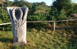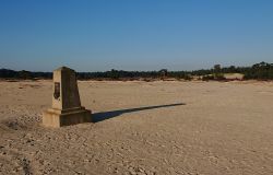 Als ik een stuk gelopen heb, zie ik ineens het monumentje staan. Dat is dus echt de eerste keer dat ik dat zie! Ik wist wel dat het er was, maar ik dacht dat het alweer weggehaald was vanwege de schade door het zand. Je kunt na inwerpen van een geldstuk een muntje laten slaan. Dat schijnt dus niet te werken vandaar dat het weg moet. Wat leuk dat ik het nu toch nog zie na al die tijd. Meestal liep ik via een andere weg naar het uitkijk punt en kwam ik hier dus niet uit. Nooit eerder geweest!