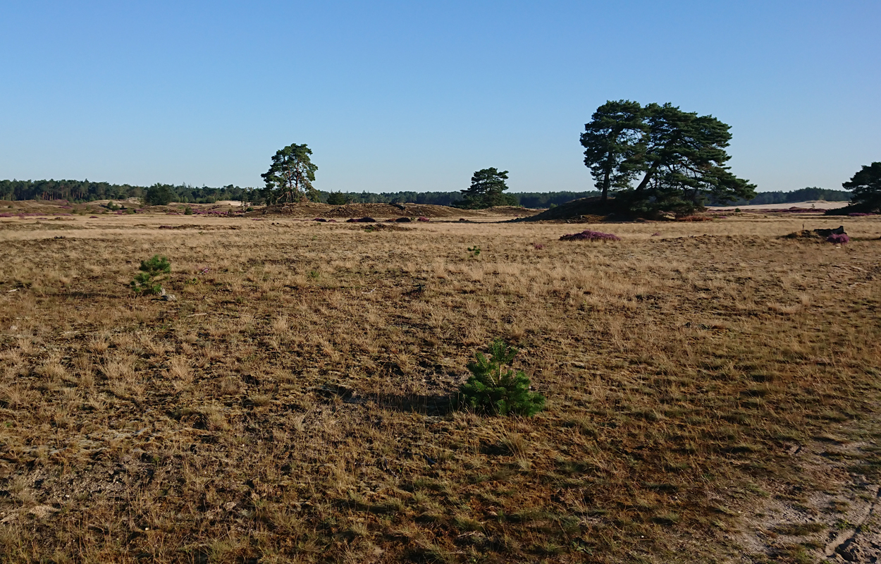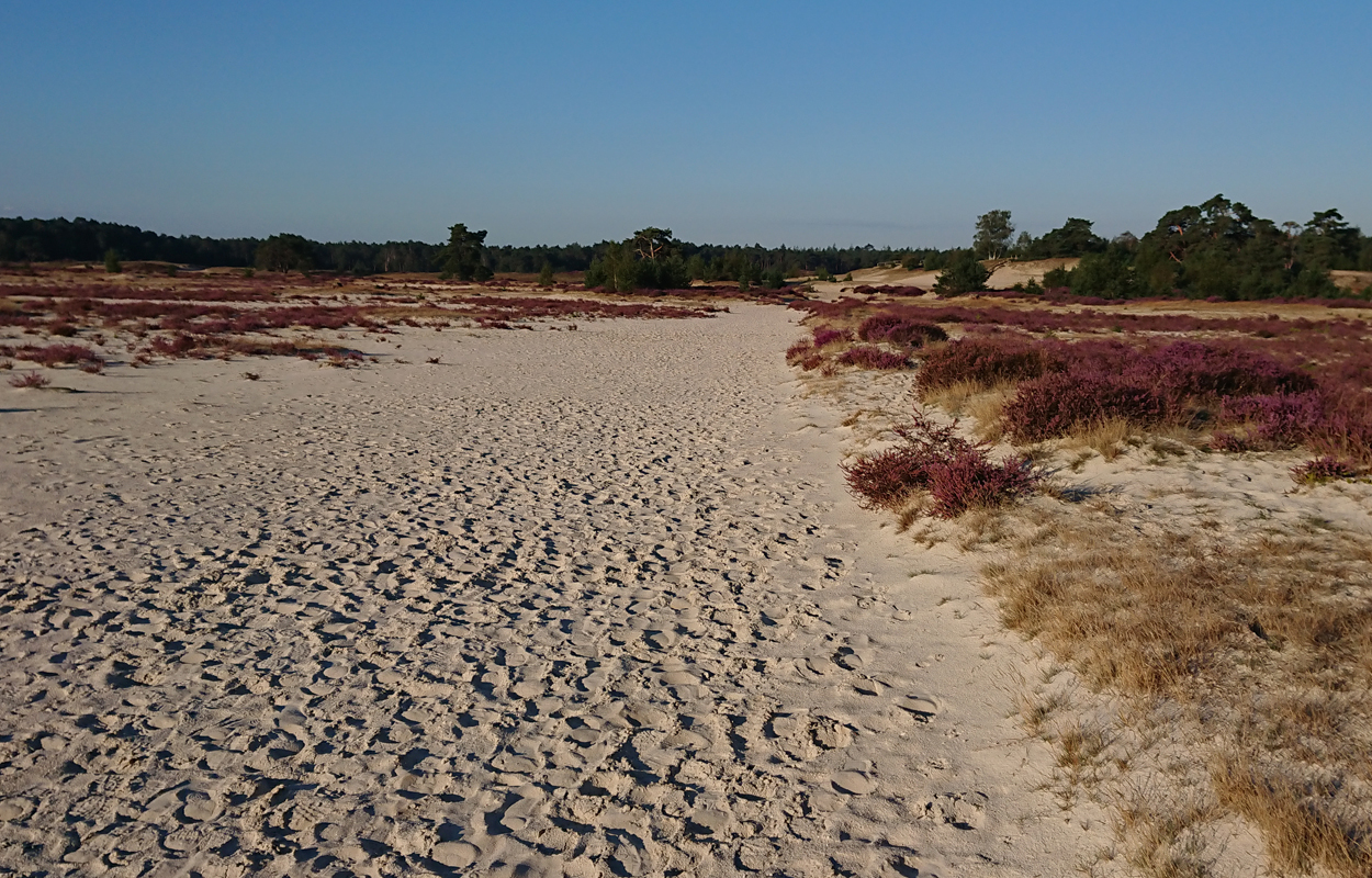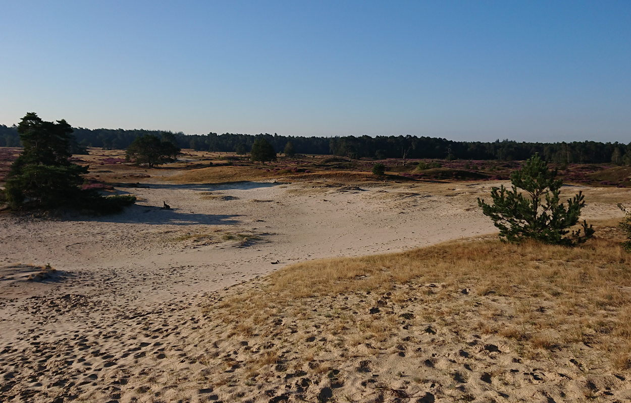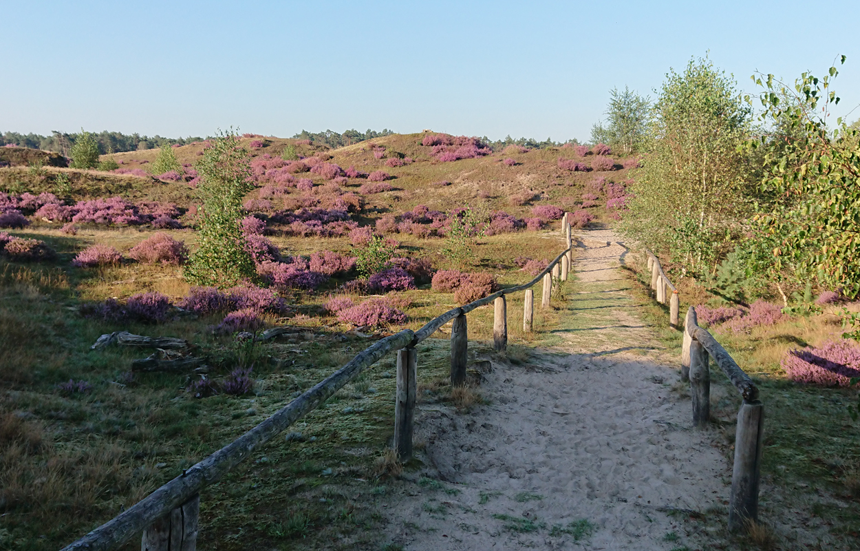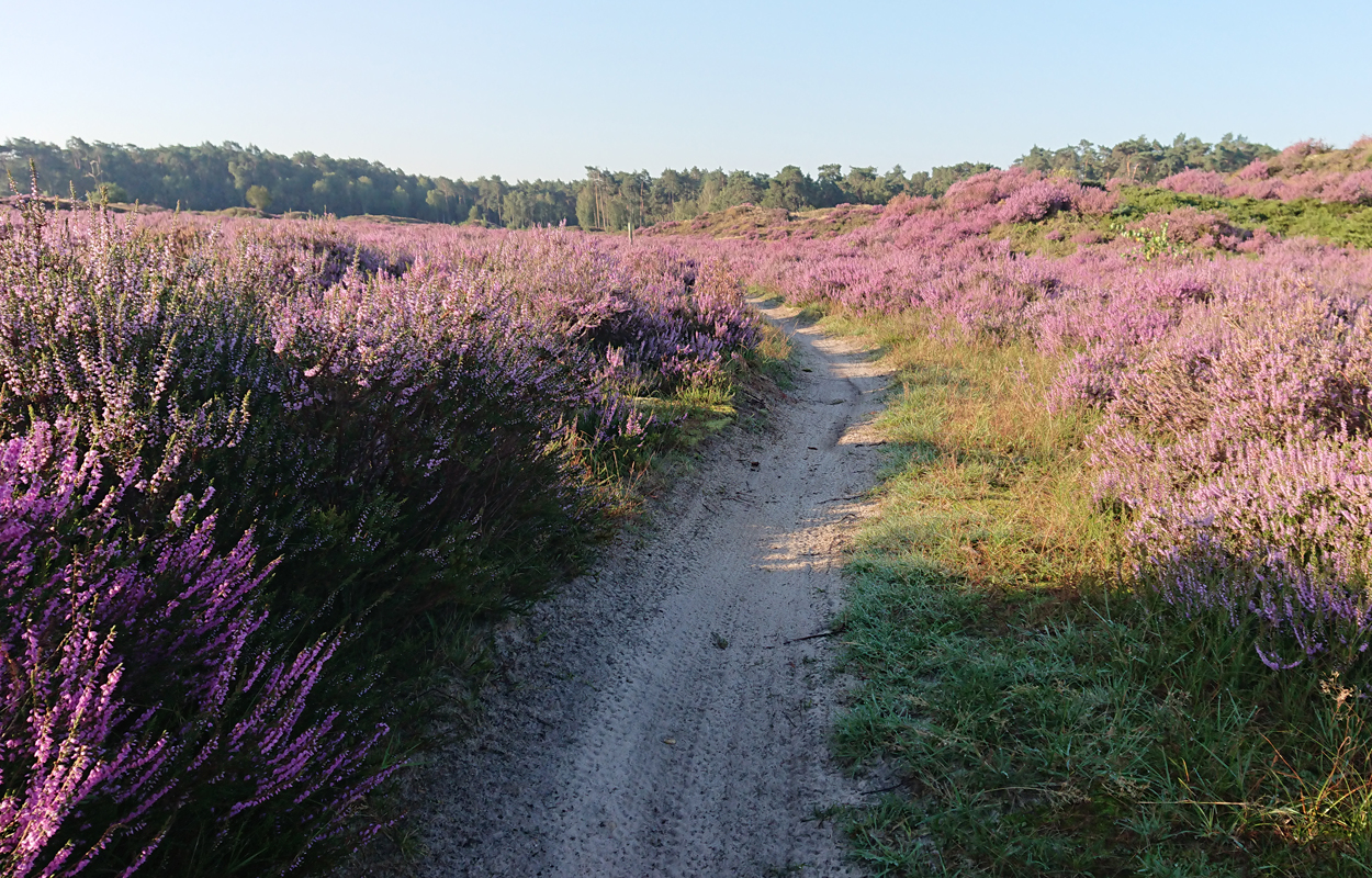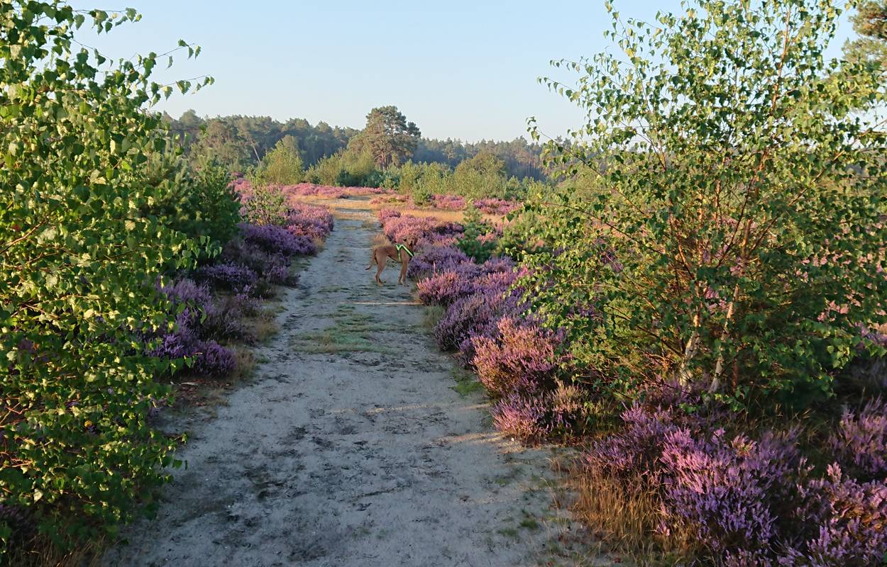 Vandaag gaan we om 6.45 op pad. Gisteren hebben S. en L. hard gewerkt aan de andere kant om alles klaar te krijgen. Dat moet ook wel want we hebben nog maar 2 dagen en dan komen er alweer nieuwe mensen. Maar vandaag ga ik eerst weer lekker op pad met Fleur. De mannen gaan rustig verder zonder mij. Mijn taak komt pas later als het gras gelegd moet worden en de plantjes erin moeten. Ik heb dus alle tijd van de wereld en zo voelt het ook vandaag. Ik ga lekker heide kijken aan de andere kant dus we lopen eerst langs het zand naar de Klarenweg en zelfs verder.