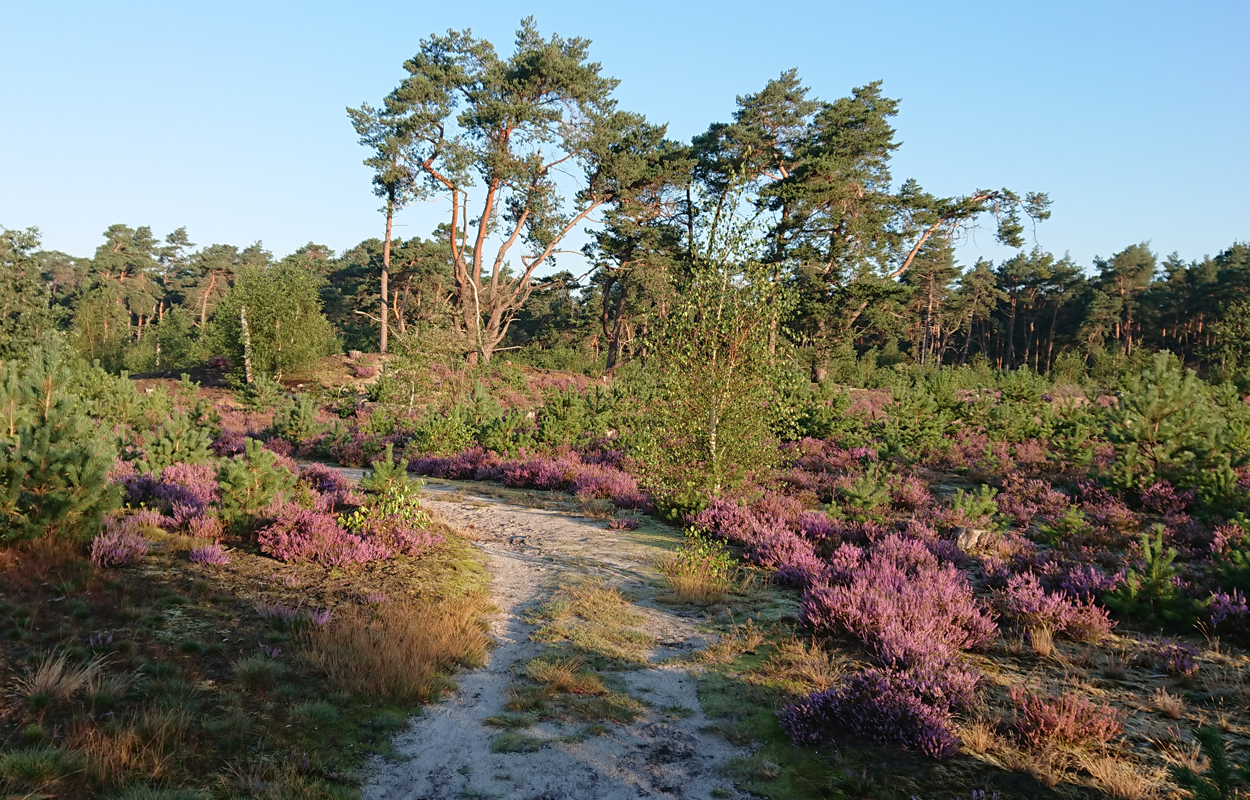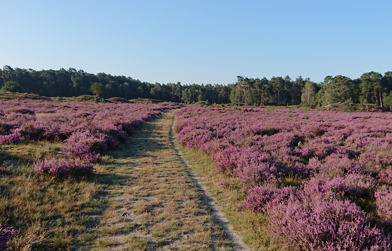 Ik loop om het uitzichtspunt heen en geniet nog even van kuifmeesjes die bij het bankje rond hupsen. Zo leuk! daarna sla ik linksaf als ik weer beneden ben. Nog meer heide!