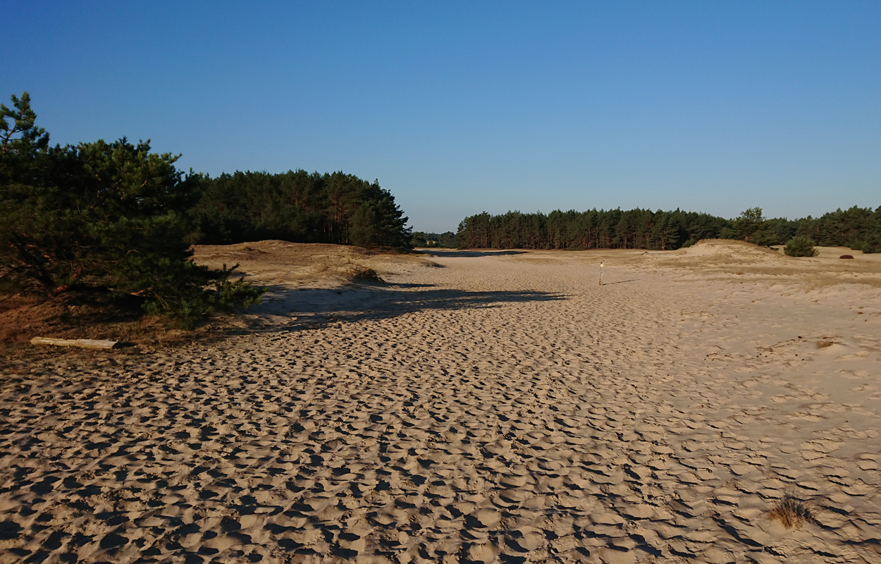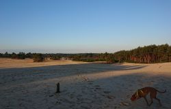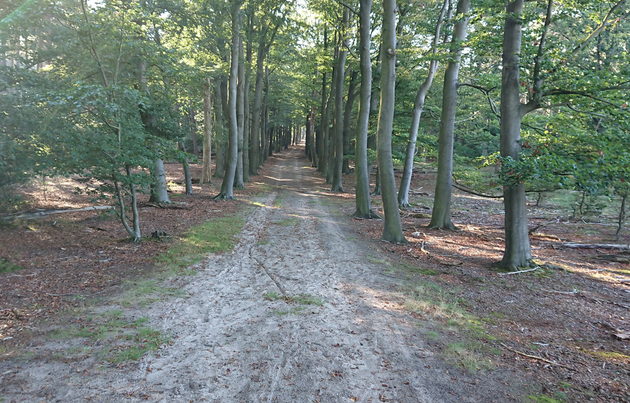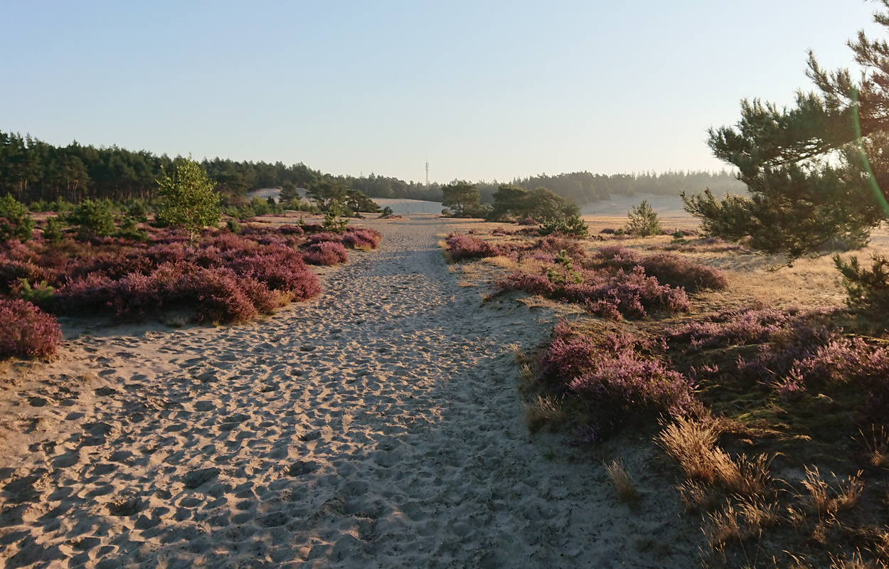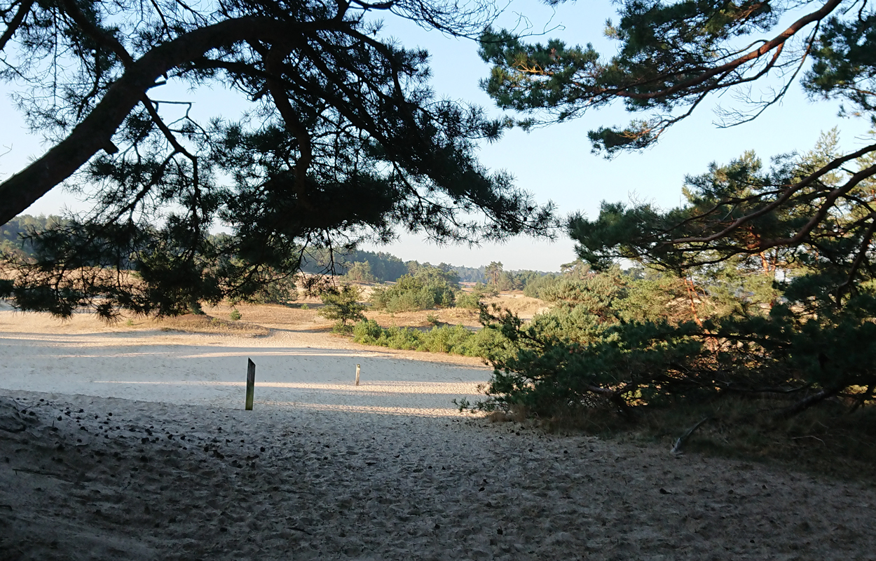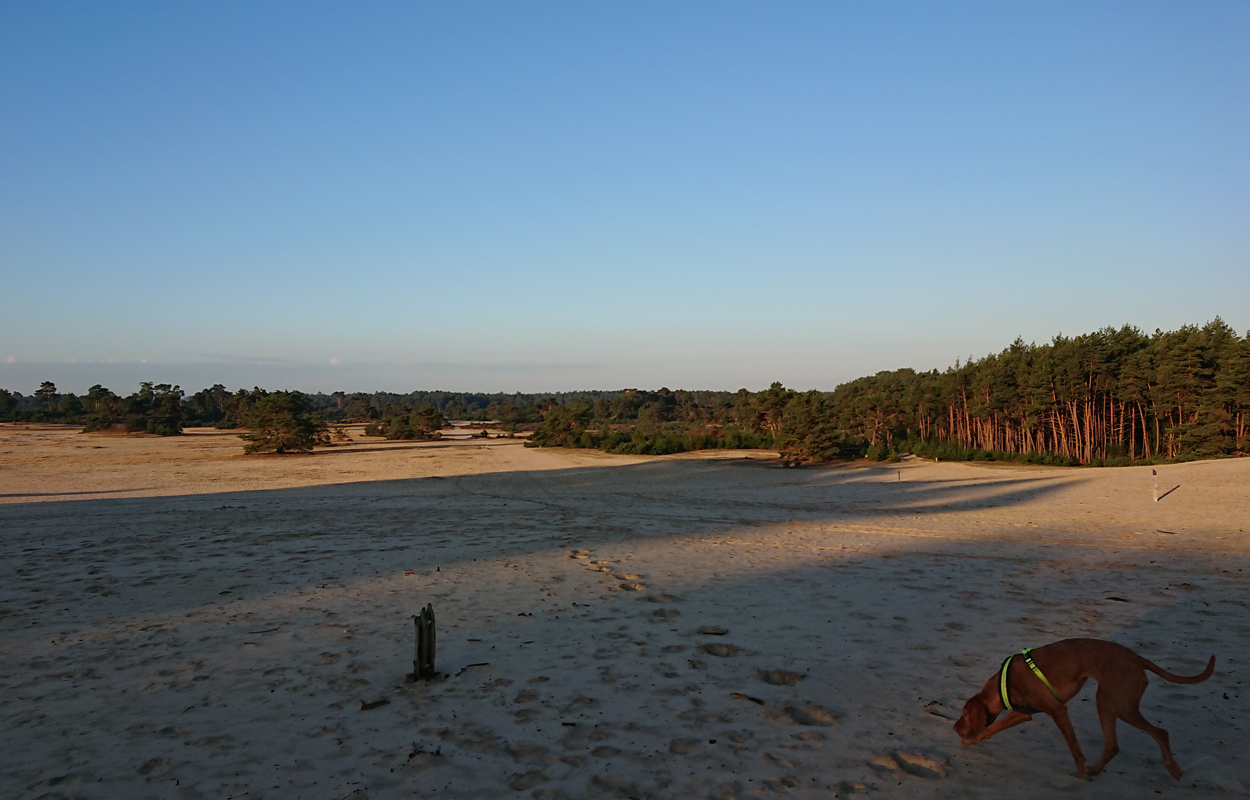Het is al prachtig op het eerste stukje. Al snel kom ik bij de Klarenweg en vanaf daar neem ik het pad richting het Aortjes Huus maar dan anders. Ik heb geen zin om vlak langs het hek te lopen met alle verkeersdrukte, dus kies ik een ander pad door het bos. Dat brengt me uiteindelijk langs de heuvel van de zandverstuiving verderop en daar lopen we het zand weer op. Van hardlopen is echt geen sprake op dit rulle zand. Dan maar even wandelen. Inmiddels komt het zonnetje erbij en is het echt prachtig weer.