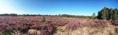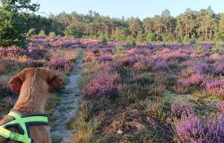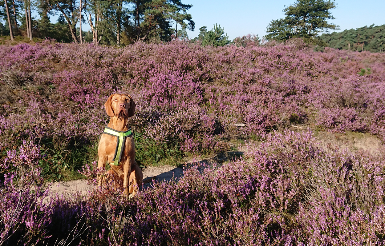 We hobbelen verder en alles voelt goed. Hoe kan het ook anders met deze prachtige omgeving en het heerlijke weer. Fleur vindt ook alles leuk gelukkig. We lopen een stukje door het bos en daarna weer over de heide.