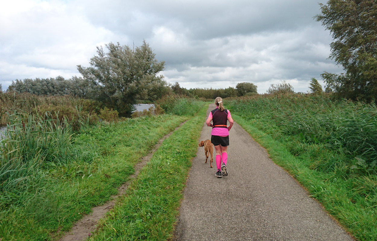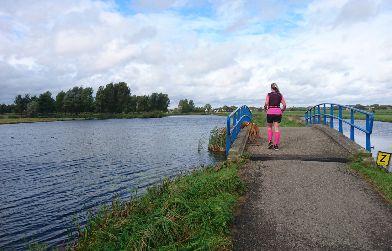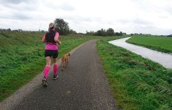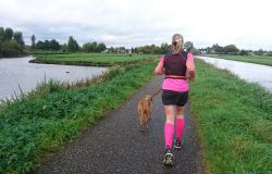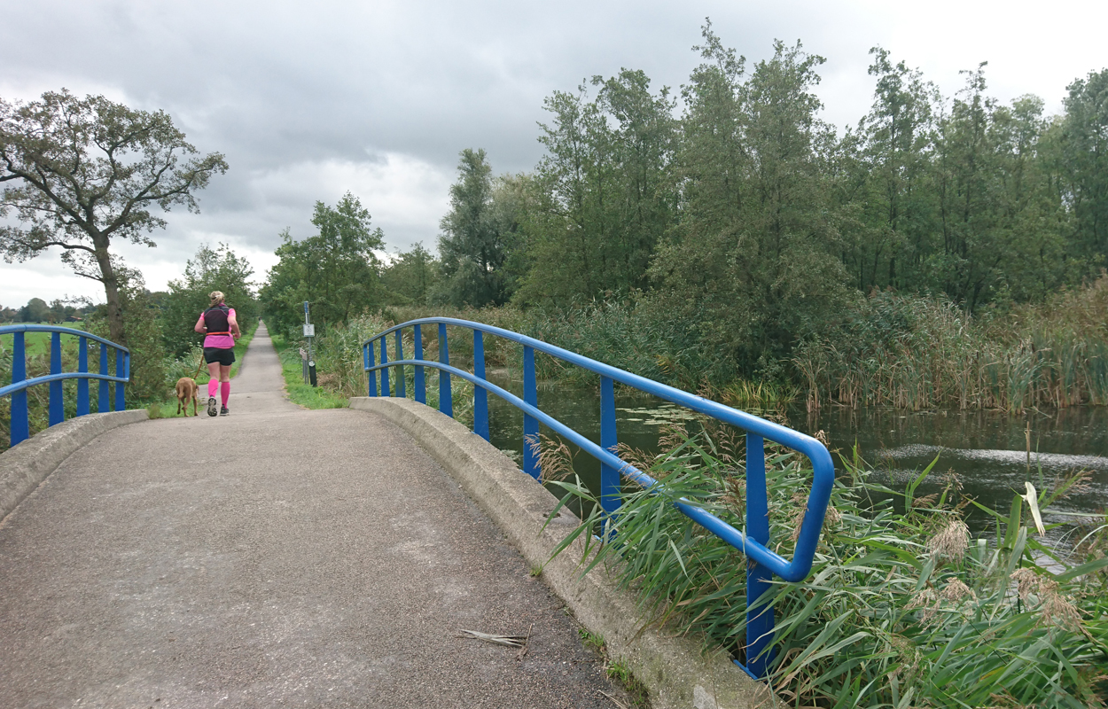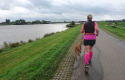 Dat is ook met de fiets wel goed te doen. Helaas vindt Fleur de watertjes met de eendjes ook hier erg leuk en ze duikt opeens het water in en zwemt even in de rondte. Oh ja. Vervelend genoeg is het tuigje nu ook zeiknat. Stom ding dat zo nat blijft! Aan het einde van het pad lijn ik haar toch maar weer aan en daarna lopen we richting de dijk. Dat blijkt geen gelukkige keuze want we hebben daar de wind keihard tegen. Ik heb daar thuis helemaal geen last van omdat in het bos eigenlijk nooit wind staat. Maar ik sla me er dapper doorheen. Wat was ik dan een bikkel vroeger met mijn hondje zeg! Wel weer bijzonder en leuk om hier te lopen. Alleen dat stukje dijk vind ik niet fijn. Fleur wil niet op de bobbelrand lopen en we lopen dus eigenlijk te ver op de weg en ik hoor geen auto’s aankomen met die wind.