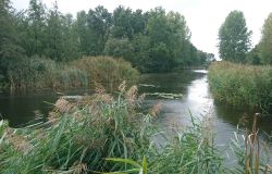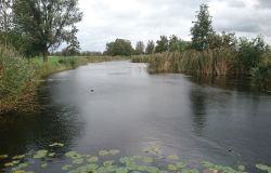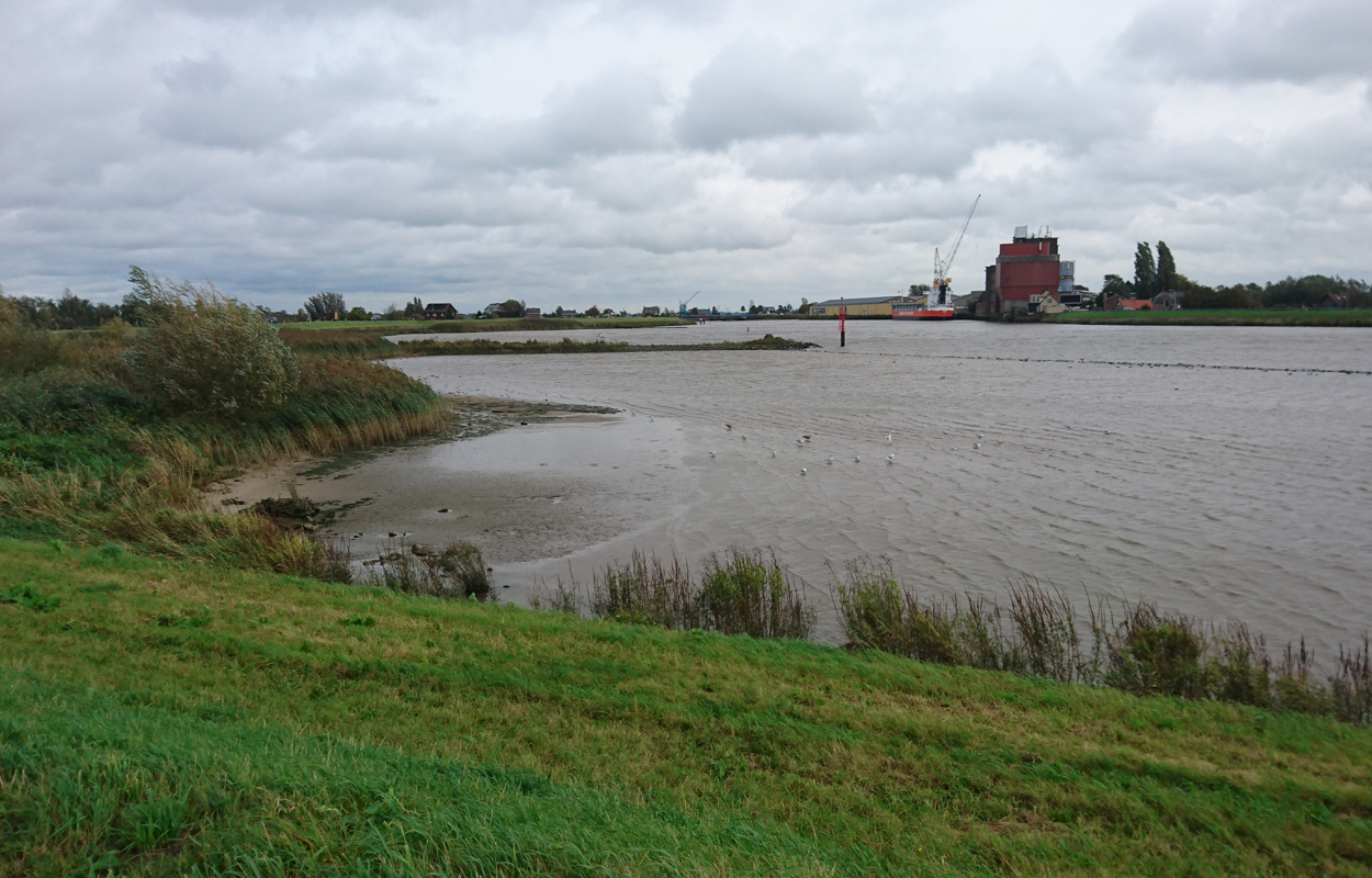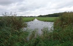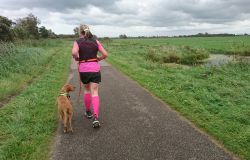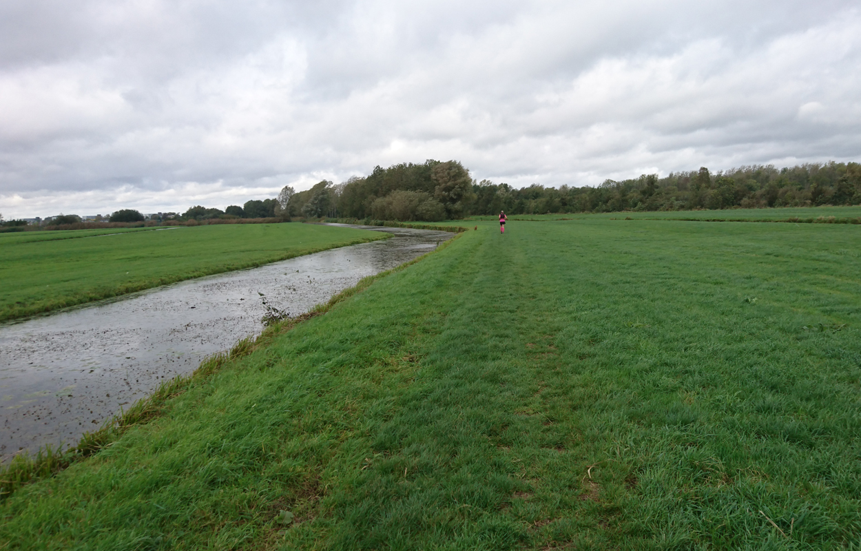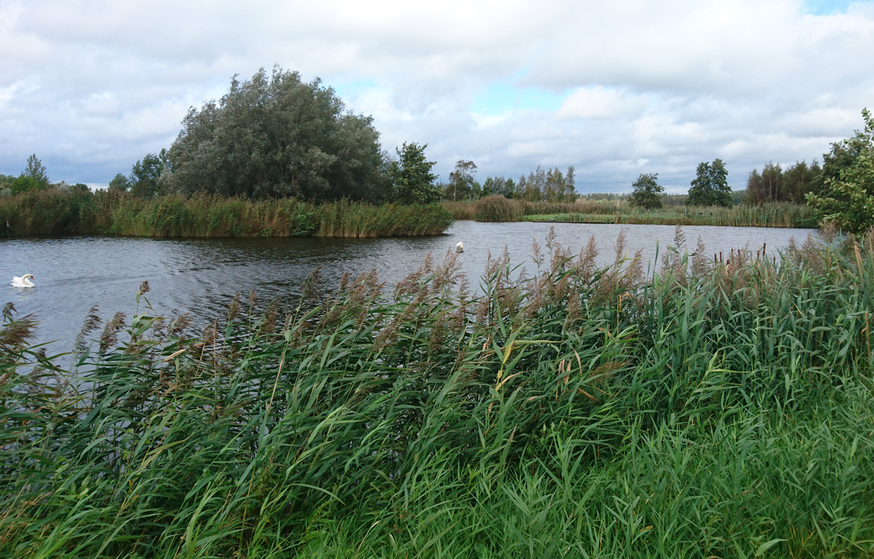 Dat is ook met de fiets wel goed te doen. Helaas vindt Fleur de watertjes met de eendjes ook hier erg leuk en ze duikt opeens het water in en zwemt even in de rondte. Oh ja. Vervelend genoeg is het tuigje nu ook zeiknat. Stom ding dat zo nat blijft! Aan het einde van het pad lijn ik haar toch maar weer aan en daarna lopen we richting de dijk. Dat blijkt geen gelukkige keuze want we hebben daar de wind keihard tegen. Ik heb daar thuis helemaal geen last van omdat in het bos eigenlijk nooit wind staat. Maar ik sla me er dapper doorheen. Wat was ik dan een bikkel vroeger met mijn hondje zeg! Wel weer bijzonder en leuk om hier te lopen. Alleen dat stukje dijk vind ik niet fijn. Fleur wil niet op de bobbelrand lopen en we lopen dus eigenlijk te ver op de weg en ik hoor geen auto’s aankomen met die wind.