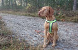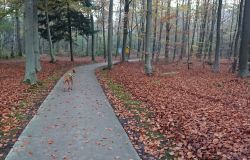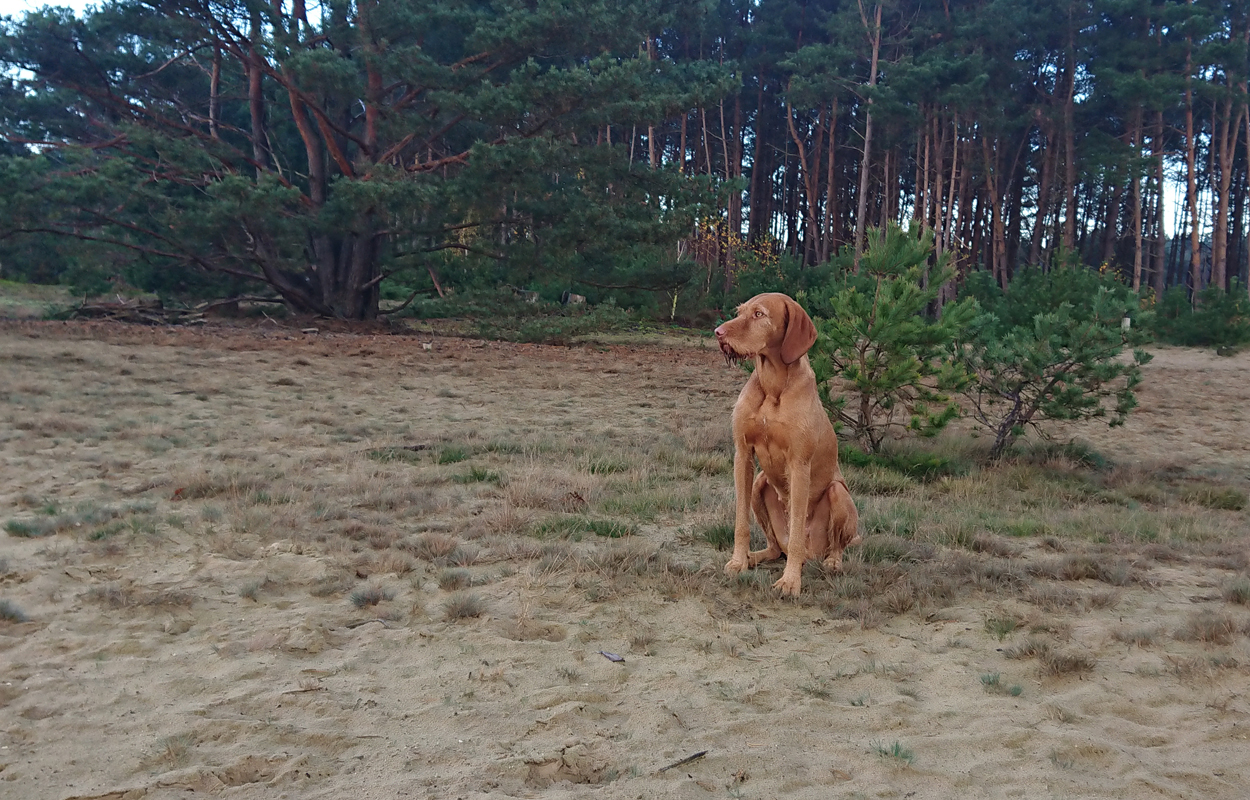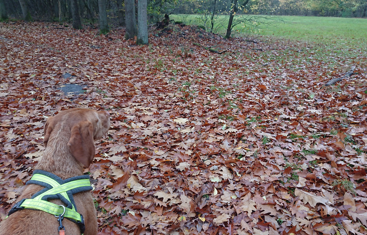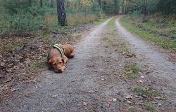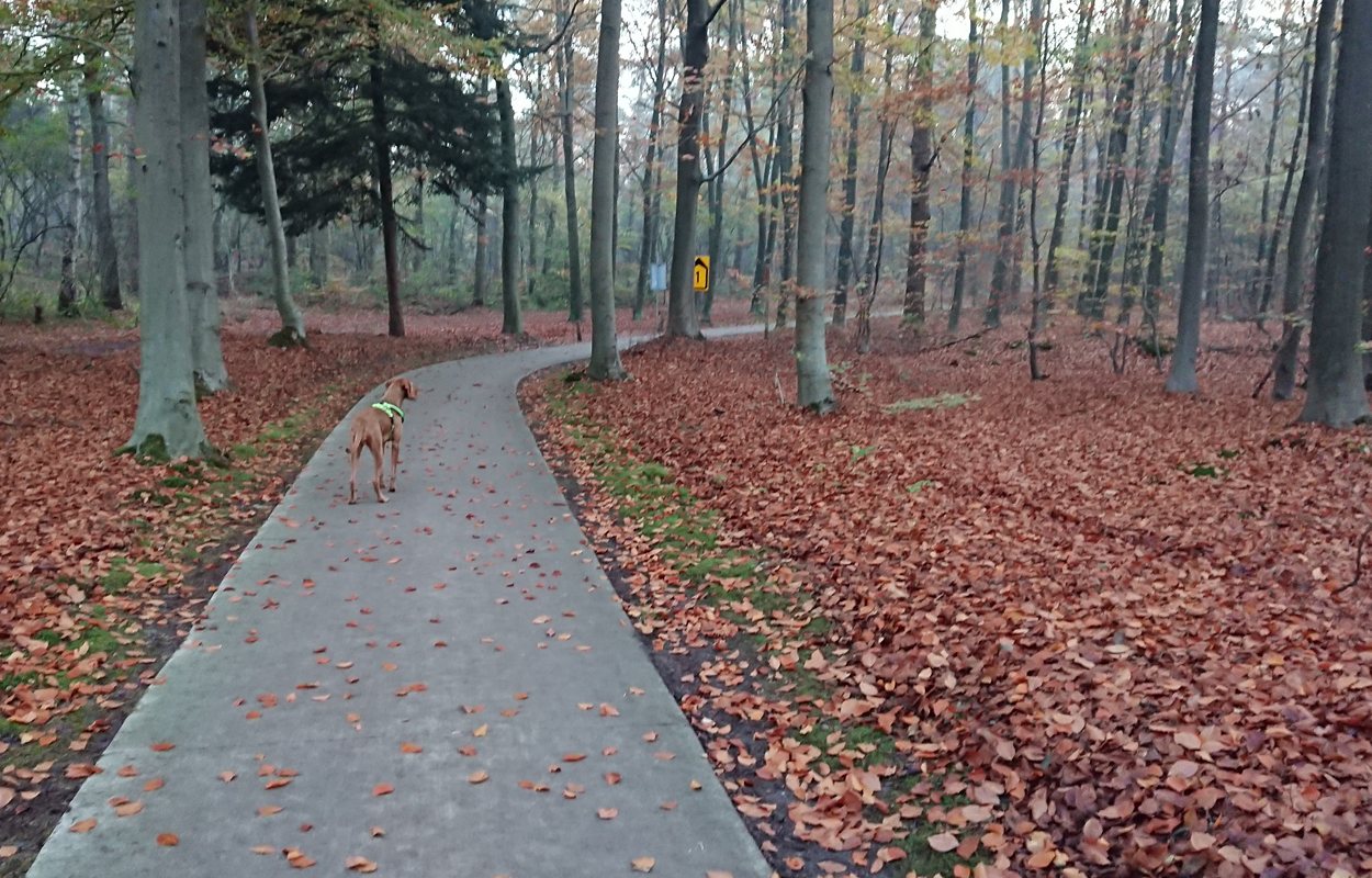 Een enorm stuk om! Ik ben blij dat ik de weg weet en sla rechtsaf na het spoor. Ik wandel dit stukje met Fleur aan de riem. Het is een smal pad dat ook nog eens op en neer loopt. Eigenlijk doet Fleur het prima zelfs op de korte lijn. Voorheen verlengde ik de riem maar dat hoeft niet eens. Ze trekt nergens en let ook aardig op waar ik blijf en wat ik doe. Het gaat dus echt vooruit! Het is nog best een stuk zo langs het hek en pas na 4 km beginnen we dan onze ronde langs het fietspad van de Brandsweg. Grappig genoeg heeft S. niet door hoe ik gelopen ben en vraagt net aan de andere kant van het spoor of hij mee zal fietsen. Ik geloof niet dat hij snapt wat ik bedoel als ik zeg dat dat niet makkelijk gaat en dat ik zelf even het rondje ga afmaken. Pas thuis leg ik uit dat ik helemaal ben omgelopen naar de andere overgang. Hij dacht dat ik gewoon bij ons het spoor over was gestoken en vroeg zich dus af waarom hij dan niet kon komen met de fiets. Maar zo is het ook goed. Ik hobbel verder met Fleur en sla linksaf aan het einde. Ik maak er een mooi vierkantje van en geniet van alle natuur en het licht van de zon en loop terug via de onder doorgang bij Hajé en ga daarna terug via ons eigen bekende bos. Toch ruim 11 km onderweg geweest. Prima zo en op naar de volgende ronde. Ik was al helemaal happy hoe Fleur op het smalle pad liep. Ongelooflijk dat ik met Zivaatje daar gewoon los liep.