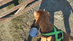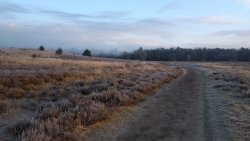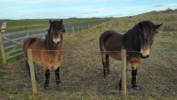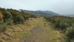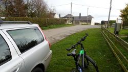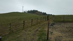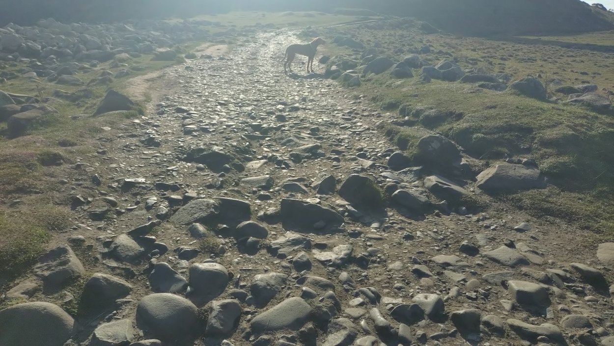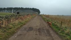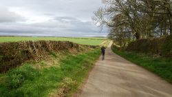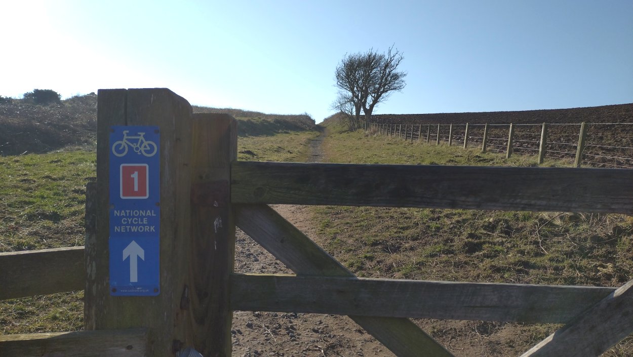 Ik geef Fleur wat water in mijn bakje. Dat wil ze wel gelukkig. Ik drink ook een slokje. Daarna gauw weer op pad. En dan komen die 2 dames er ineens ook weer aan. En frustrerend genoeg zijn ze ook nog eens zo uit zicht verdwenen. Ik ben hier dus echt super super traag kennelijk. Ik vind het ook echt lastig. Ik hobbel maar gewoon door want ik moet nog eventjes. Gelukkig komt er een klein stukje heuvelafwaarts waar ik over het gras kan lopen in plaats van over het gravel. Dat schiet tenminste een beetje op. Ik moet aan het einde even snel op de kaart kijken. Rechtdoor toch? Ja, op dat stukje werd ooit een vrouw gedood door een koe. Gelukkig nu helemaal geen dieren hier te zien. Ik hobbel verder en kom uiteindelijk weer bij het riding centre. Daar rechtsaf naar de manege en door het weiland naar de andere kant. Geen paarden nu. Gelukkig weet ik waar ik heen moet, want er staat weliswaar een pijl aan het begin van het weiland maar dat je daarvoor achter de struiken moet uitkomen, moet je maar gokken. Ik weet het gelukkig.