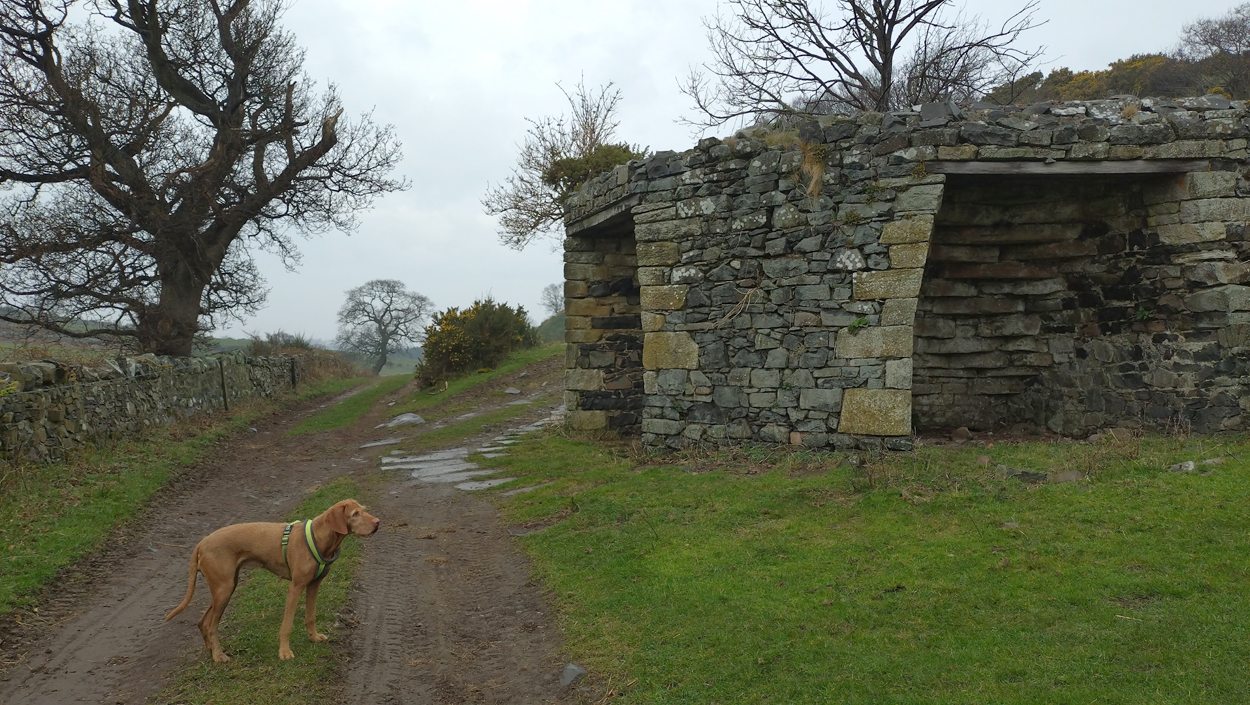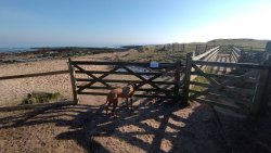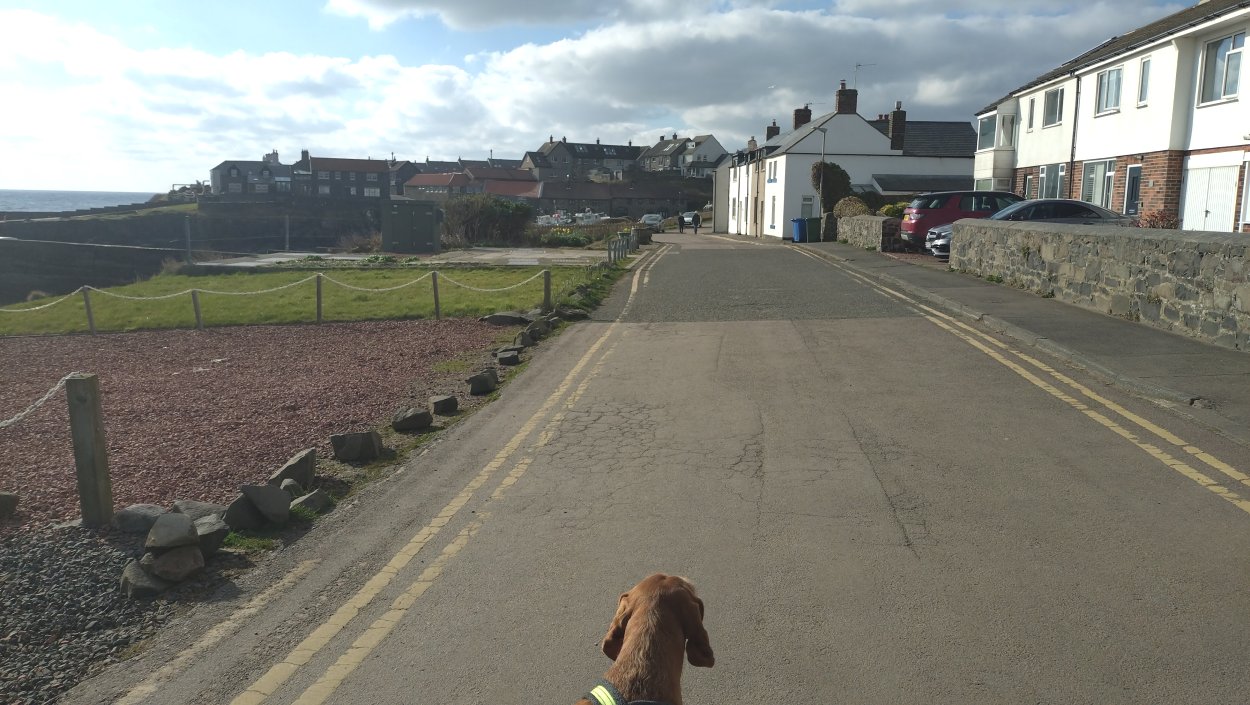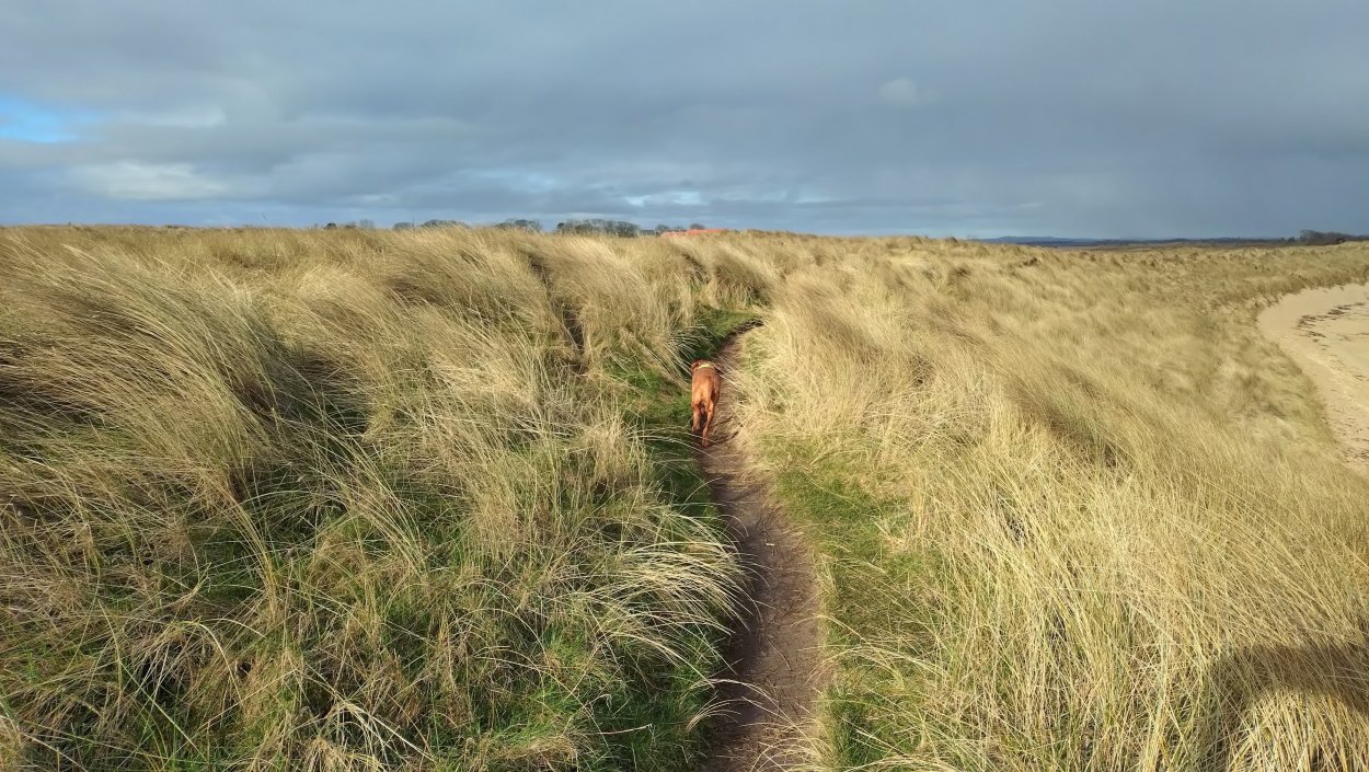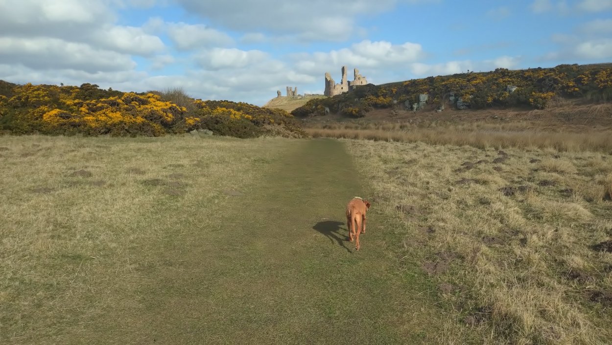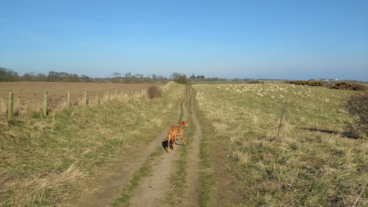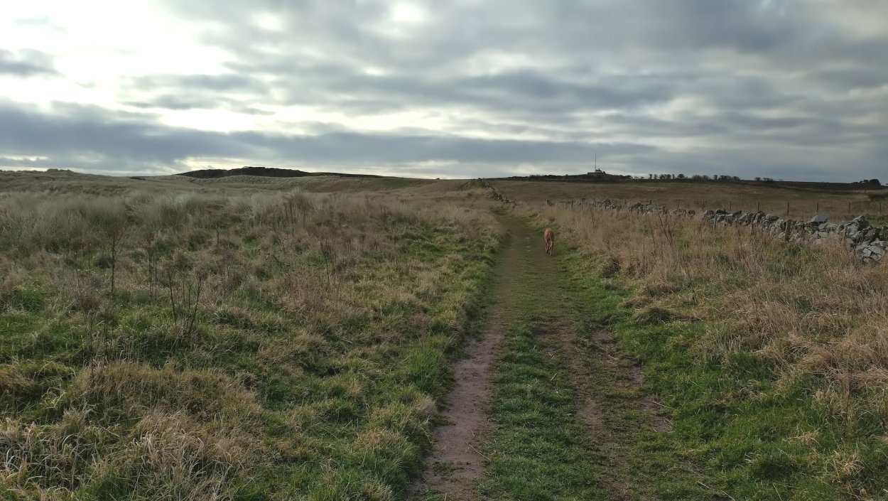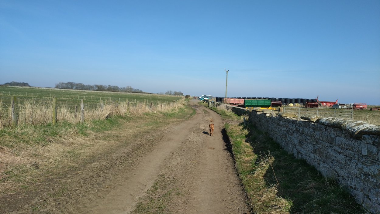 Vandaag weer tijd voor een rondje hier. Ik heb niet erg lekker geslapen maar ik wil wel op pad. Omdat ik dacht dat het enorm zou waaien vandaag, had ik in bed bedacht dat ik bij Belford zou gaan lopen. Toen ik beneden kwam, bleek het te regenen. Dat was dus een ander weer type dan ik dacht. Maar zowel met regen als wind is het strand eigenlijk niks. Dus na even nadenken, ben ik dan toch maar op pad gegaan voor mijn Belford rondje. Volgens het verslag uit 2020 zou dat 18 km zijn maar ik betwijfelde dat. Iets korter dacht ik en dat bleek achteraf ook te kloppen, want ik had 17.2 km op de teller en ook in 2016 had ik dat. Eerst maar eens op pad dan. Petje mee, kleine rugzakje en mijn dunne giletje. Qua temperatuur niks nodig denk ik. Watertje voor woef en deze keer wel een bakje (mijn eigen waterbeker voor op reis) en een bueno reepje voor het geval dat. Vooraf had ik wel een Slimfast drink genomen. Ik parkeer in het dorp en al snel zijn we op weg. Het regent nog licht en ik doe mijn petje op. Ik vergeet dus een foto te maken van het dorpje zoals ik anders wel doe. Na de pharmacy rechtsaf en over een stil weggetje starten maar. Fleur is al los. Ik loop langs een soort mislukt kasteeltje richting een boerderij. Zo gek dat je dan over het erf van die boerderij loopt. Maar er gaat echt een route overheen dus je moet gewoon zo lopen. Ik doe Fleur wel even aan de riem dat is wel zo netjes natuurlijk. Verder op weer los en door.