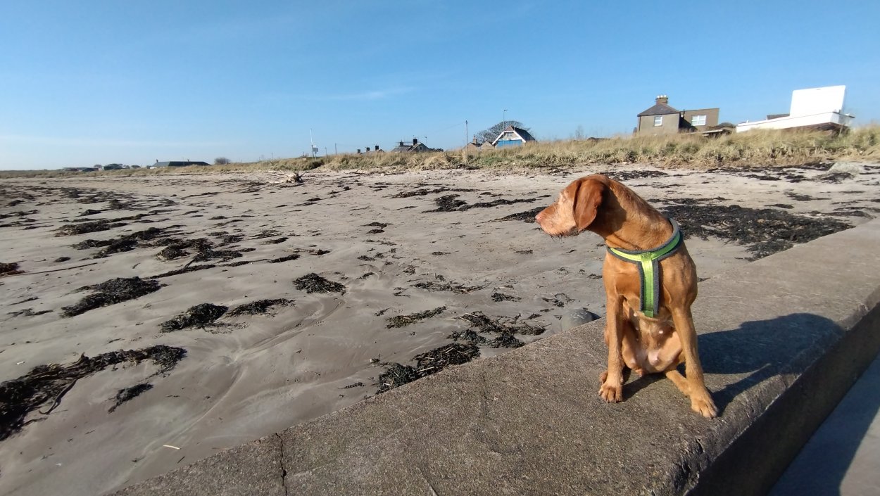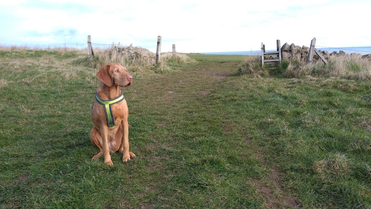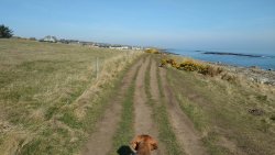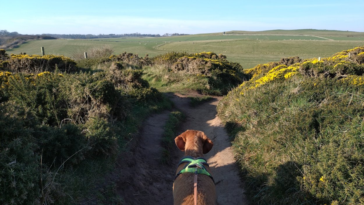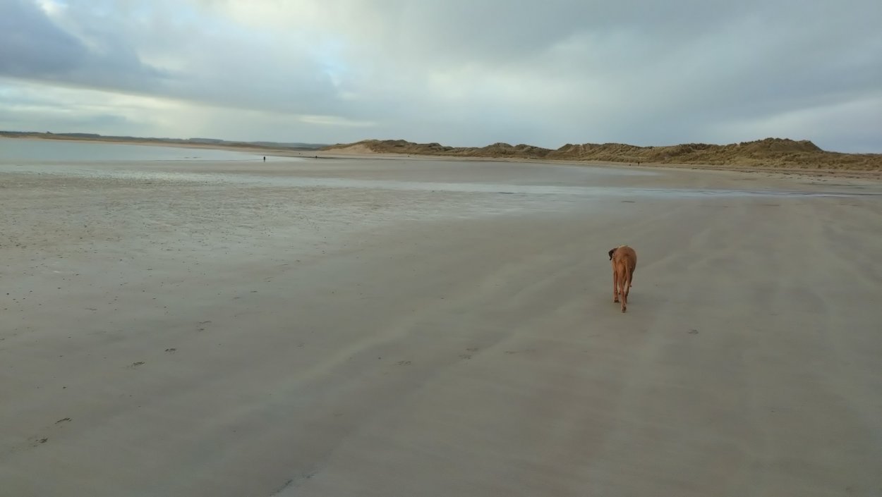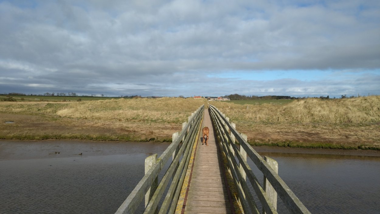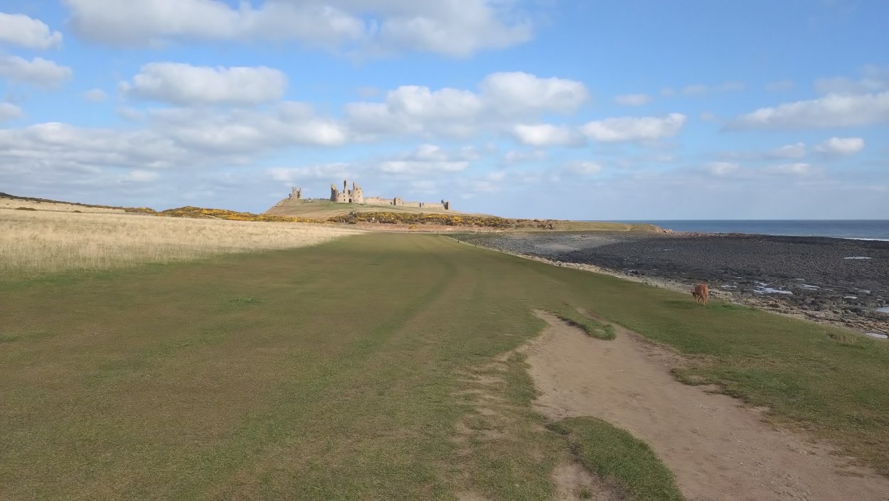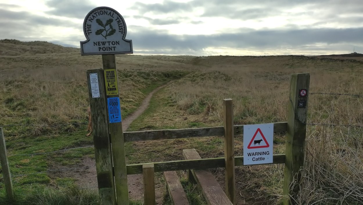Vandaag weer tijd voor een rondje hier. Ik heb niet erg lekker geslapen maar ik wil wel op pad. Omdat ik dacht dat het enorm zou waaien vandaag, had ik in bed bedacht dat ik bij Belford zou gaan lopen. Toen ik beneden kwam, bleek het te regenen. Dat was dus een ander weer type dan ik dacht. Maar zowel met regen als wind is het strand eigenlijk niks. Dus na even nadenken, ben ik dan toch maar op pad gegaan voor mijn Belford rondje. Volgens het verslag uit 2020 zou dat 18 km zijn maar ik betwijfelde dat. Iets korter dacht ik en dat bleek achteraf ook te kloppen, want ik had 17.2 km op de teller en ook in 2016 had ik dat. Eerst maar eens op pad dan. Petje mee, kleine rugzakje en mijn dunne giletje. Qua temperatuur niks nodig denk ik. Watertje voor woef en deze keer wel een bakje (mijn eigen waterbeker voor op reis) en een bueno reepje voor het geval dat. Vooraf had ik wel een Slimfast drink genomen. Ik parkeer in het dorp en al snel zijn we op weg. Het regent nog licht en ik doe mijn petje op. Ik vergeet dus een foto te maken van het dorpje zoals ik anders wel doe. Na de pharmacy rechtsaf en over een stil weggetje starten maar. Fleur is al los. Ik loop langs een soort mislukt kasteeltje richting een boerderij. Zo gek dat je dan over het erf van die boerderij loopt. Maar er gaat echt een route overheen dus je moet gewoon zo lopen. Ik doe Fleur wel even aan de riem dat is wel zo netjes natuurlijk. Verder op weer los en door.