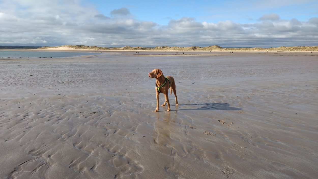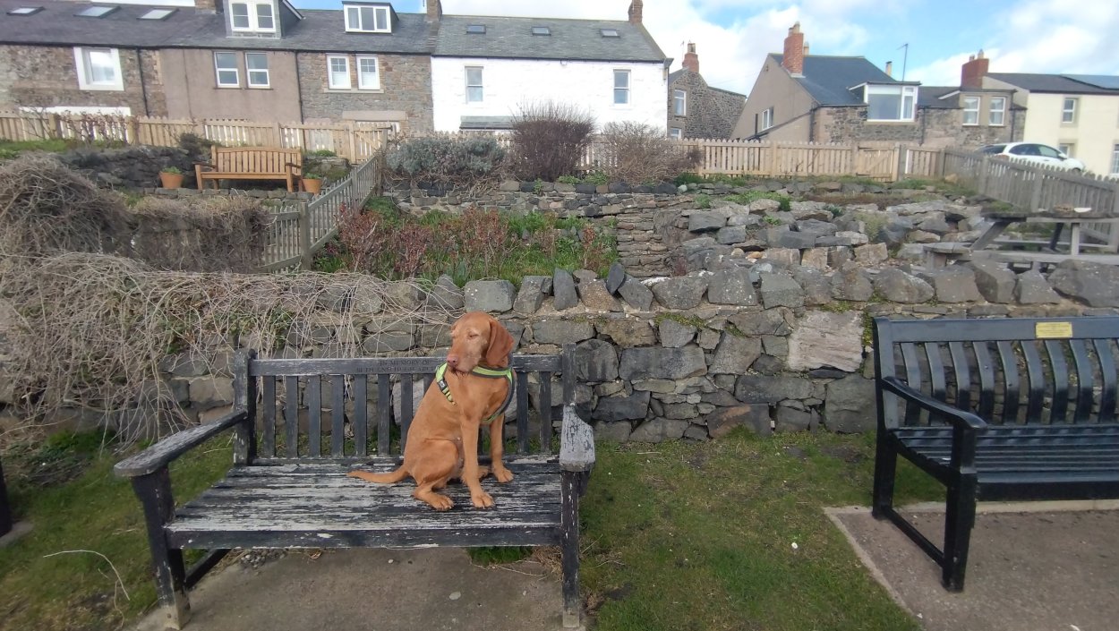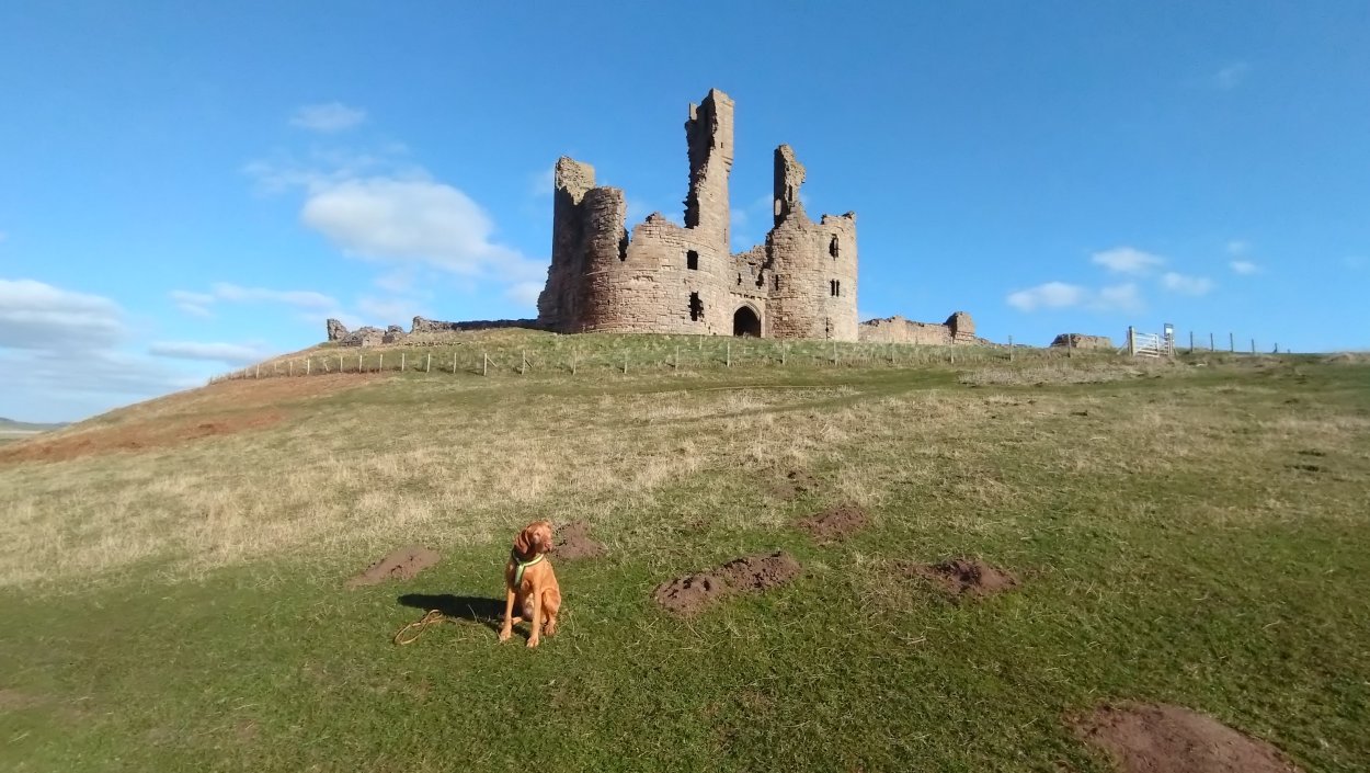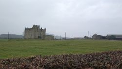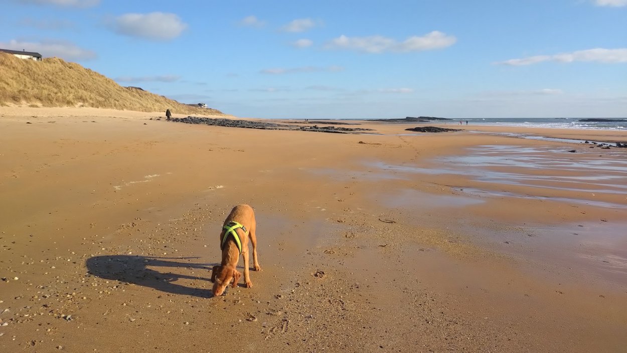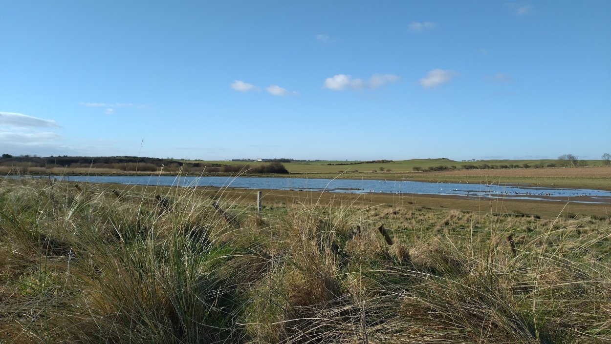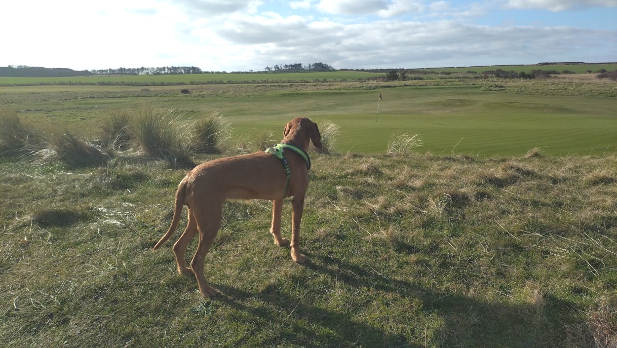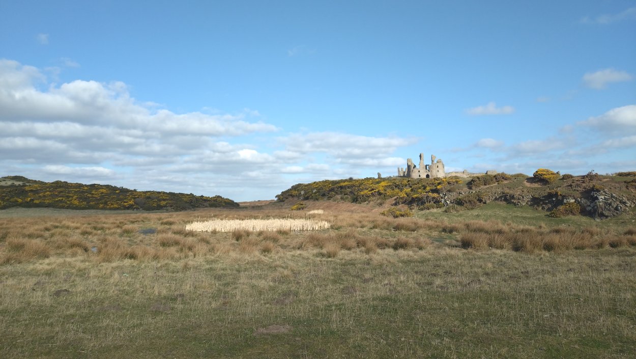 Vandaag weer tijd voor een rondje hier. Ik heb niet erg lekker geslapen maar ik wil wel op pad. Omdat ik dacht dat het enorm zou waaien vandaag, had ik in bed bedacht dat ik bij Belford zou gaan lopen. Toen ik beneden kwam, bleek het te regenen. Dat was dus een ander weer type dan ik dacht. Maar zowel met regen als wind is het strand eigenlijk niks. Dus na even nadenken, ben ik dan toch maar op pad gegaan voor mijn Belford rondje. Volgens het verslag uit 2020 zou dat 18 km zijn maar ik betwijfelde dat. Iets korter dacht ik en dat bleek achteraf ook te kloppen, want ik had 17.2 km op de teller en ook in 2016 had ik dat. Eerst maar eens op pad dan. Petje mee, kleine rugzakje en mijn dunne giletje. Qua temperatuur niks nodig denk ik. Watertje voor woef en deze keer wel een bakje (mijn eigen waterbeker voor op reis) en een bueno reepje voor het geval dat. Vooraf had ik wel een Slimfast drink genomen. Ik parkeer in het dorp en al snel zijn we op weg. Het regent nog licht en ik doe mijn petje op. Ik vergeet dus een foto te maken van het dorpje zoals ik anders wel doe. Na de pharmacy rechtsaf en over een stil weggetje starten maar. Fleur is al los. Ik loop langs een soort mislukt kasteeltje richting een boerderij. Zo gek dat je dan over het erf van die boerderij loopt. Maar er gaat echt een route overheen dus je moet gewoon zo lopen. Ik doe Fleur wel even aan de riem dat is wel zo netjes natuurlijk. Verder op weer los en door.