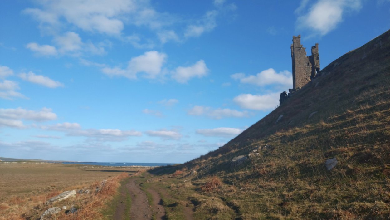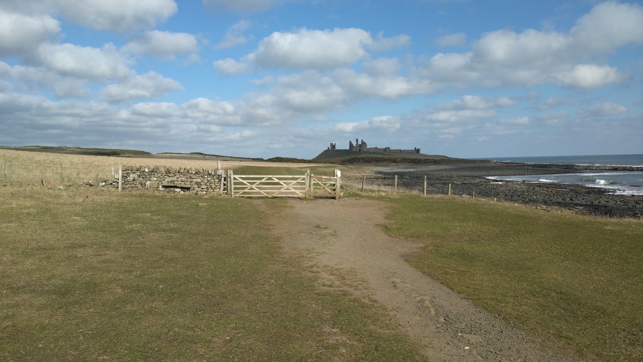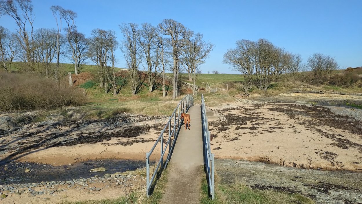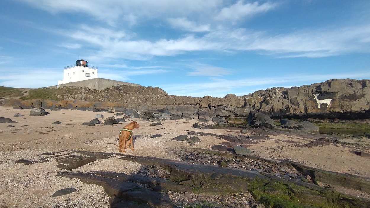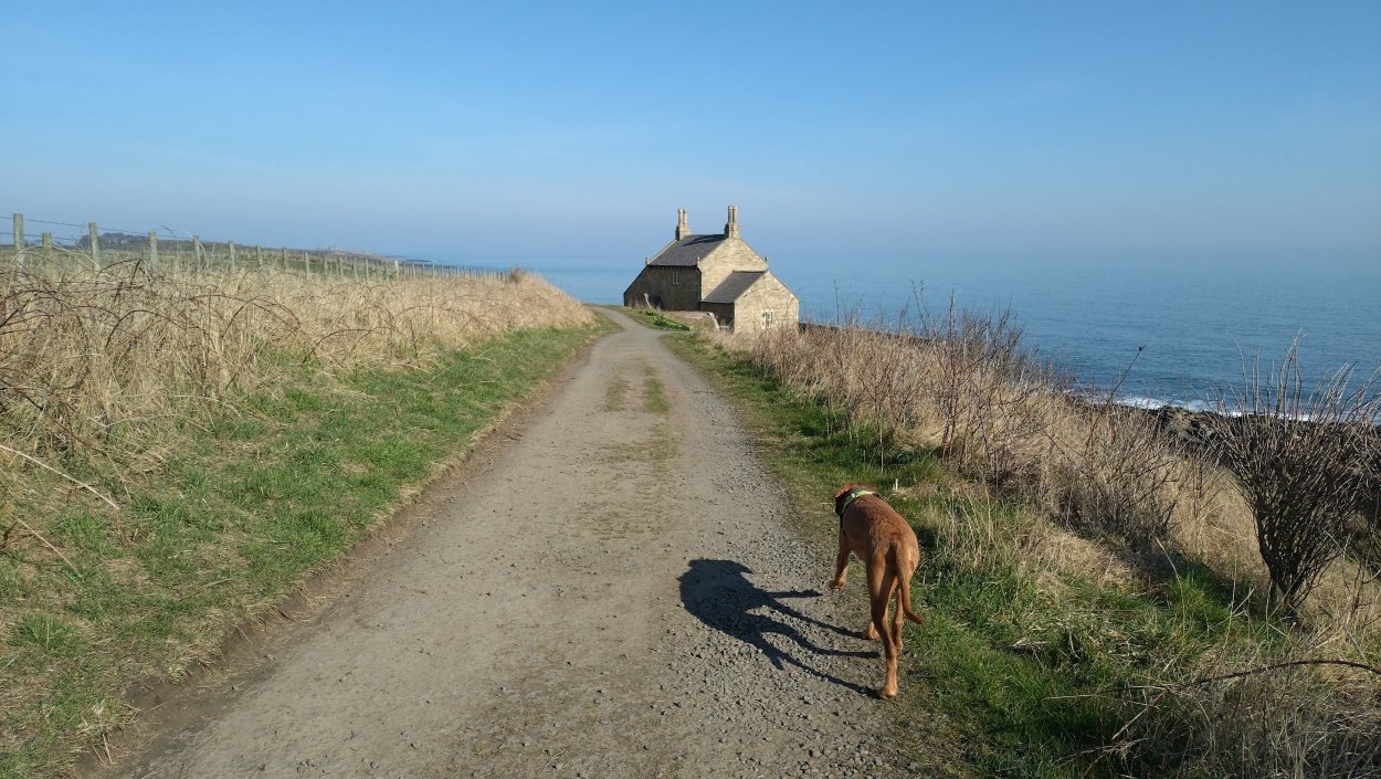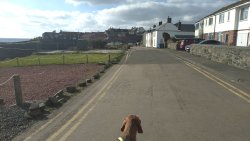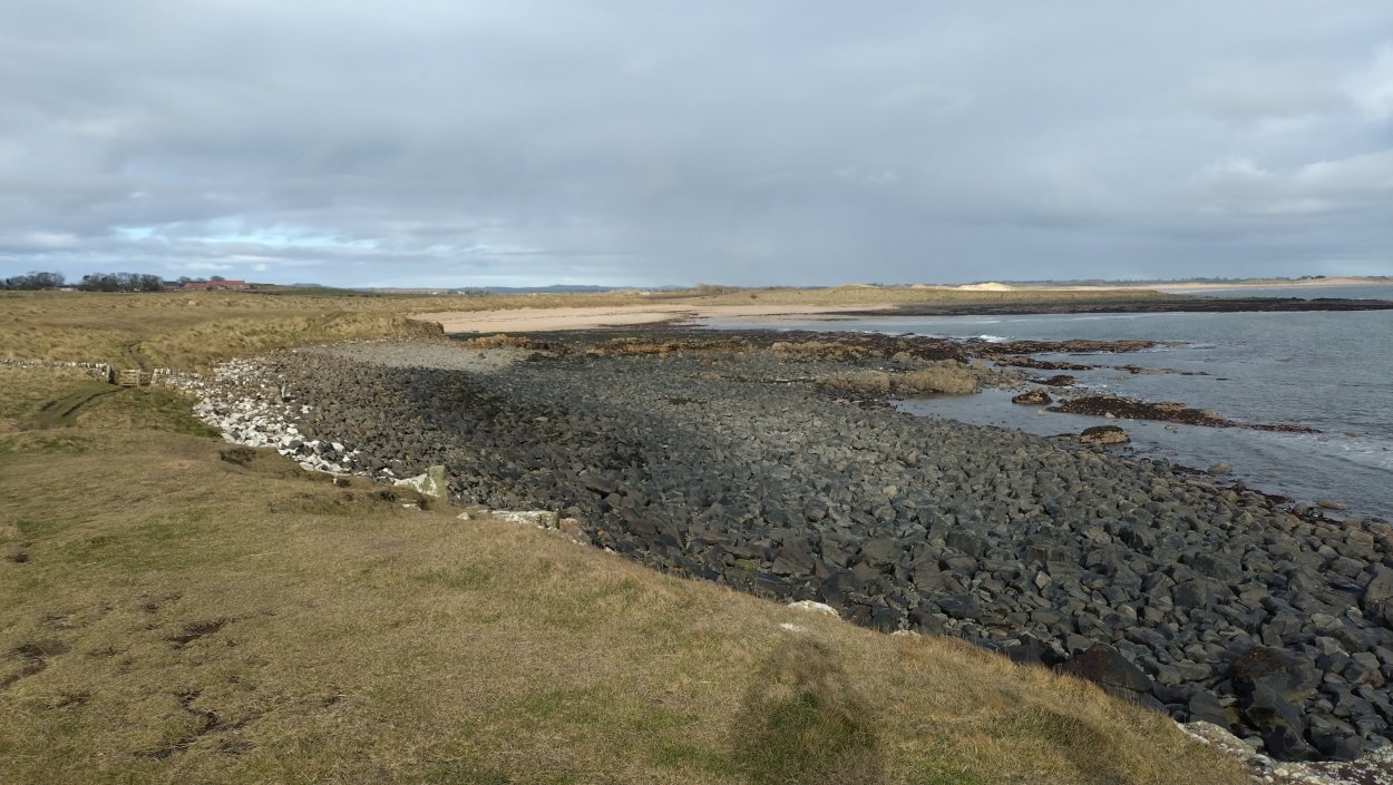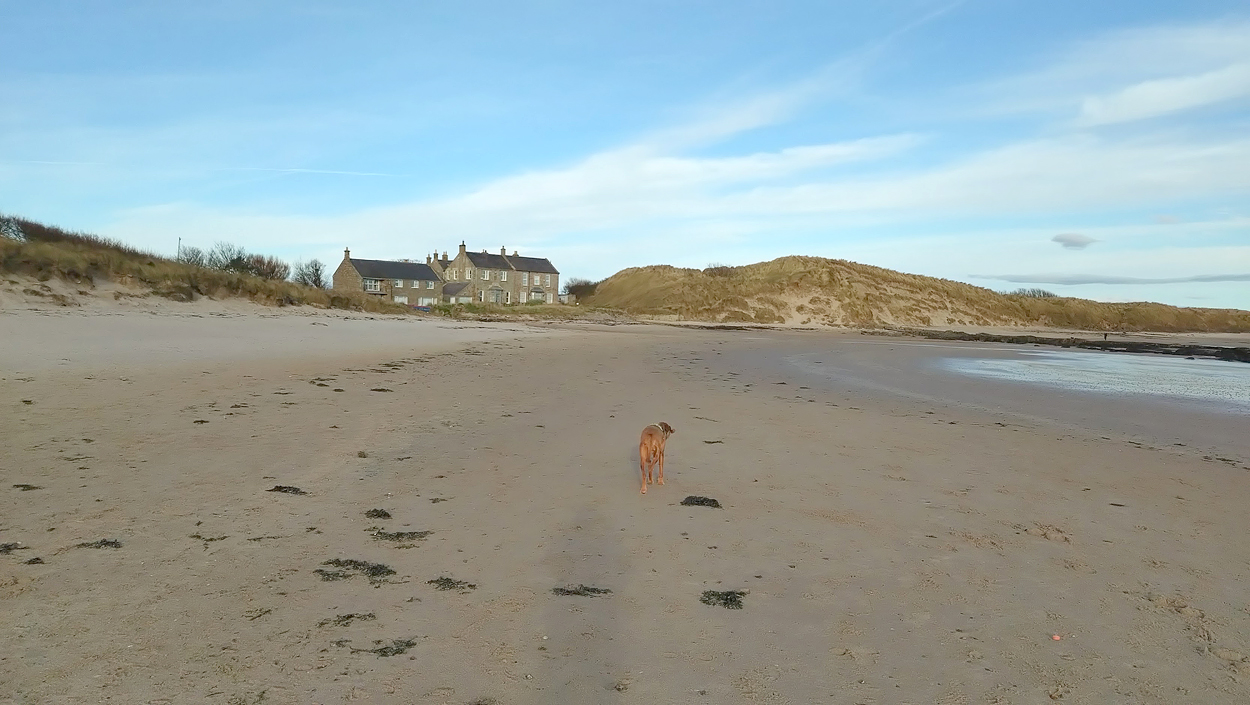 Vandaag weer tijd voor een rondje hier. Ik heb niet erg lekker geslapen maar ik wil wel op pad. Omdat ik dacht dat het enorm zou waaien vandaag, had ik in bed bedacht dat ik bij Belford zou gaan lopen. Toen ik beneden kwam, bleek het te regenen. Dat was dus een ander weer type dan ik dacht. Maar zowel met regen als wind is het strand eigenlijk niks. Dus na even nadenken, ben ik dan toch maar op pad gegaan voor mijn Belford rondje. Volgens het verslag uit 2020 zou dat 18 km zijn maar ik betwijfelde dat. Iets korter dacht ik en dat bleek achteraf ook te kloppen, want ik had 17.2 km op de teller en ook in 2016 had ik dat. Eerst maar eens op pad dan. Petje mee, kleine rugzakje en mijn dunne giletje. Qua temperatuur niks nodig denk ik. Watertje voor woef en deze keer wel een bakje (mijn eigen waterbeker voor op reis) en een bueno reepje voor het geval dat. Vooraf had ik wel een Slimfast drink genomen. Ik parkeer in het dorp en al snel zijn we op weg. Het regent nog licht en ik doe mijn petje op. Ik vergeet dus een foto te maken van het dorpje zoals ik anders wel doe. Na de pharmacy rechtsaf en over een stil weggetje starten maar. Fleur is al los. Ik loop langs een soort mislukt kasteeltje richting een boerderij. Zo gek dat je dan over het erf van die boerderij loopt. Maar er gaat echt een route overheen dus je moet gewoon zo lopen. Ik doe Fleur wel even aan de riem dat is wel zo netjes natuurlijk. Verder op weer los en door.