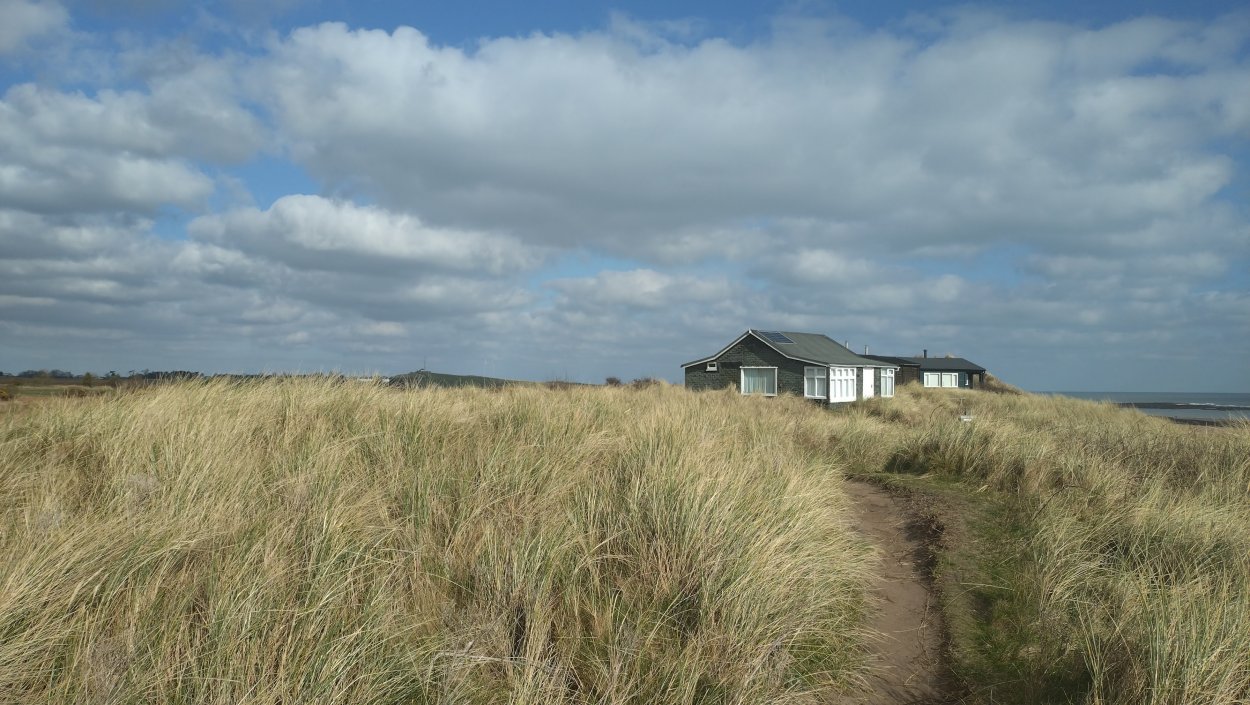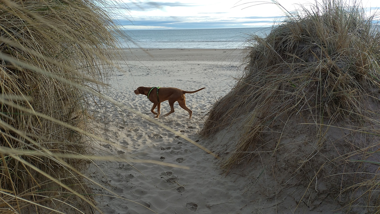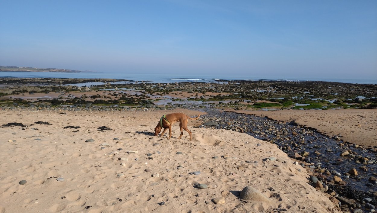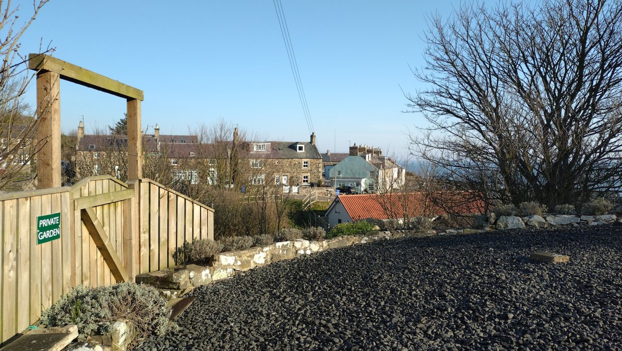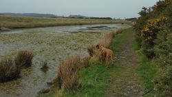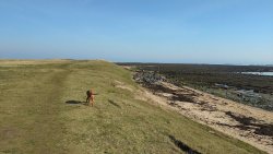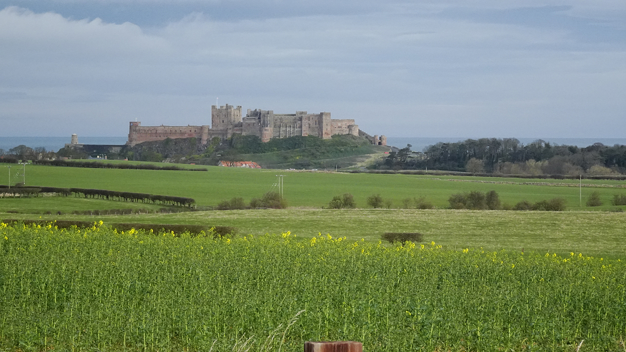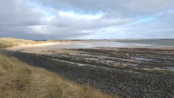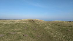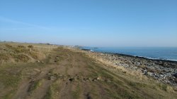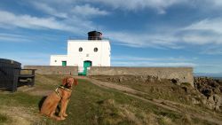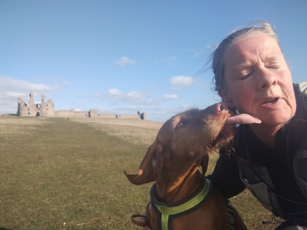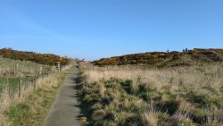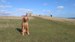 Vandaag weer tijd voor een rondje hier. Ik heb niet erg lekker geslapen maar ik wil wel op pad. Omdat ik dacht dat het enorm zou waaien vandaag, had ik in bed bedacht dat ik bij Belford zou gaan lopen. Toen ik beneden kwam, bleek het te regenen. Dat was dus een ander weer type dan ik dacht. Maar zowel met regen als wind is het strand eigenlijk niks. Dus na even nadenken, ben ik dan toch maar op pad gegaan voor mijn Belford rondje. Volgens het verslag uit 2020 zou dat 18 km zijn maar ik betwijfelde dat. Iets korter dacht ik en dat bleek achteraf ook te kloppen, want ik had 17.2 km op de teller en ook in 2016 had ik dat. Eerst maar eens op pad dan. Petje mee, kleine rugzakje en mijn dunne giletje. Qua temperatuur niks nodig denk ik. Watertje voor woef en deze keer wel een bakje (mijn eigen waterbeker voor op reis) en een bueno reepje voor het geval dat. Vooraf had ik wel een Slimfast drink genomen. Ik parkeer in het dorp en al snel zijn we op weg. Het regent nog licht en ik doe mijn petje op. Ik vergeet dus een foto te maken van het dorpje zoals ik anders wel doe. Na de pharmacy rechtsaf en over een stil weggetje starten maar. Fleur is al los. Ik loop langs een soort mislukt kasteeltje richting een boerderij. Zo gek dat je dan over het erf van die boerderij loopt. Maar er gaat echt een route overheen dus je moet gewoon zo lopen. Ik doe Fleur wel even aan de riem dat is wel zo netjes natuurlijk. Verder op weer los en door.