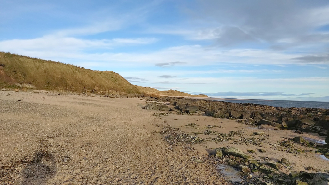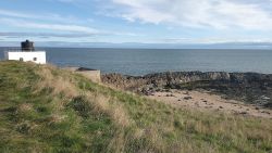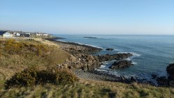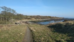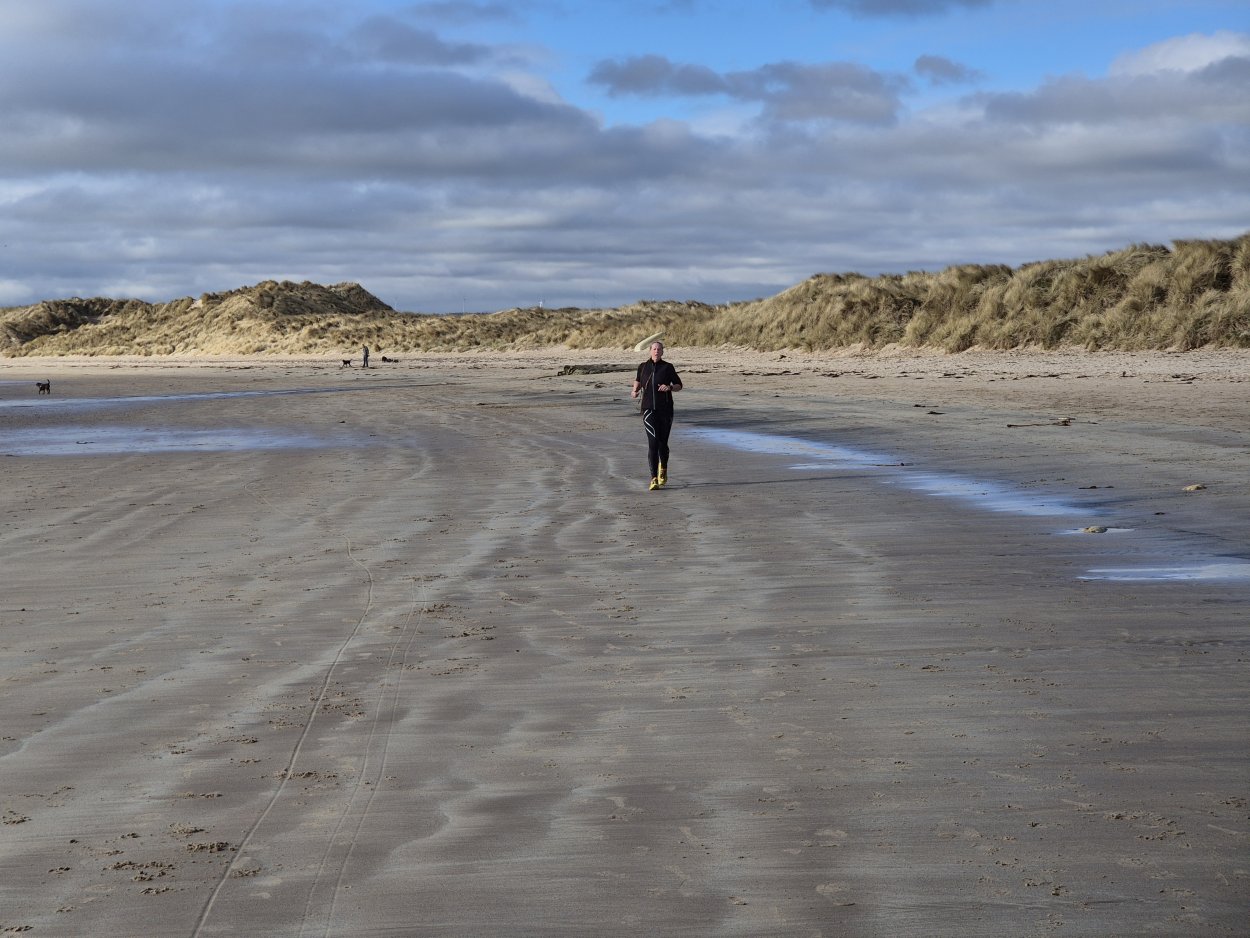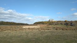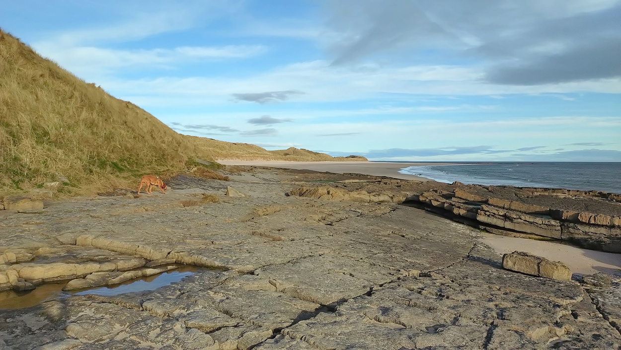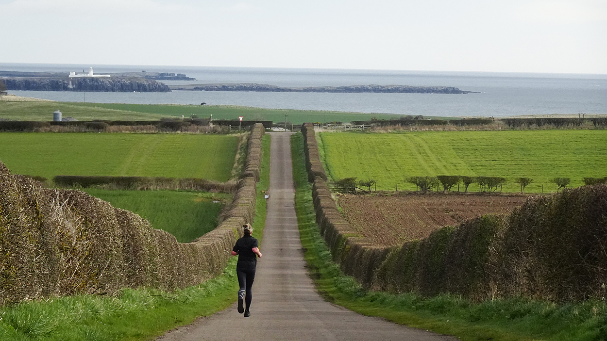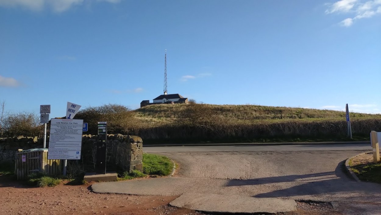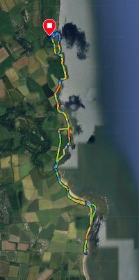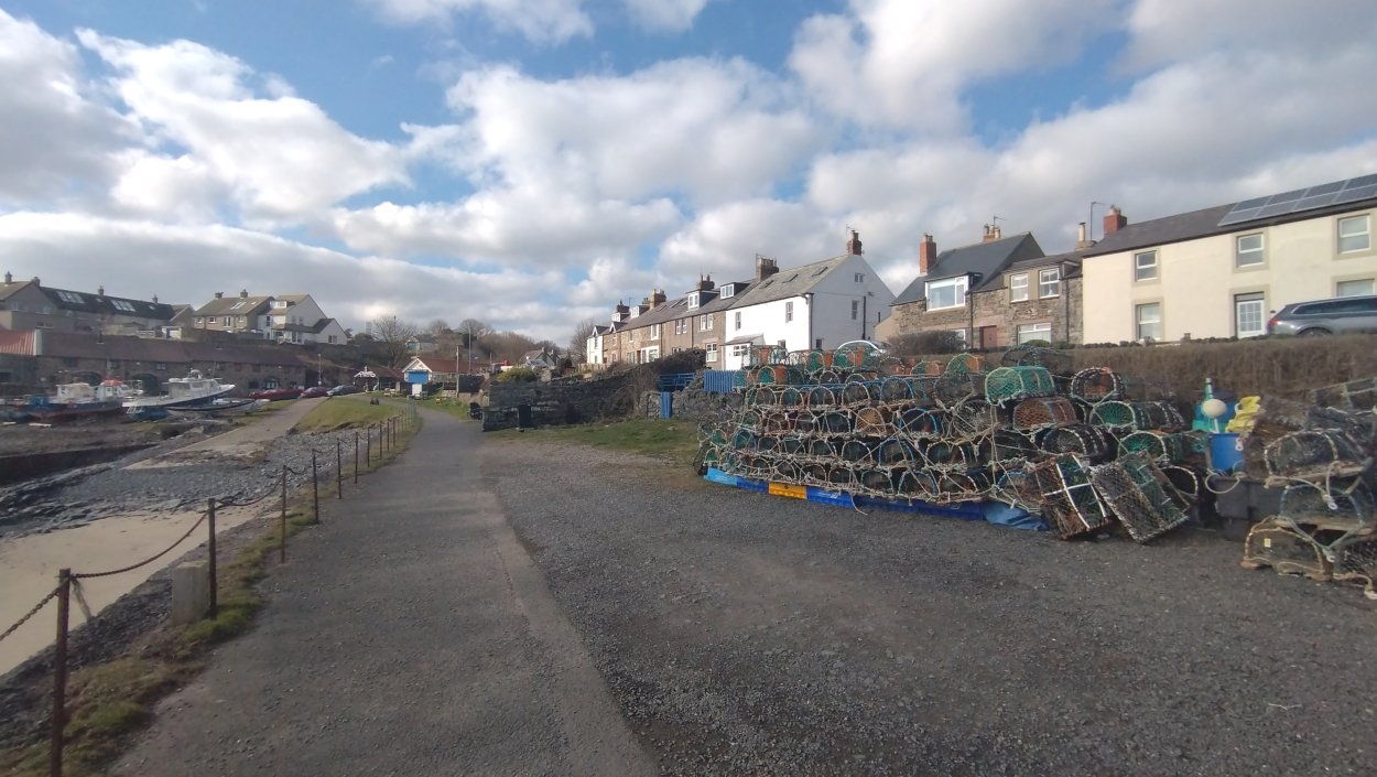 Vandaag weer tijd voor een rondje hier. Ik heb niet erg lekker geslapen maar ik wil wel op pad. Omdat ik dacht dat het enorm zou waaien vandaag, had ik in bed bedacht dat ik bij Belford zou gaan lopen. Toen ik beneden kwam, bleek het te regenen. Dat was dus een ander weer type dan ik dacht. Maar zowel met regen als wind is het strand eigenlijk niks. Dus na even nadenken, ben ik dan toch maar op pad gegaan voor mijn Belford rondje. Volgens het verslag uit 2020 zou dat 18 km zijn maar ik betwijfelde dat. Iets korter dacht ik en dat bleek achteraf ook te kloppen, want ik had 17.2 km op de teller en ook in 2016 had ik dat. Eerst maar eens op pad dan. Petje mee, kleine rugzakje en mijn dunne giletje. Qua temperatuur niks nodig denk ik. Watertje voor woef en deze keer wel een bakje (mijn eigen waterbeker voor op reis) en een bueno reepje voor het geval dat. Vooraf had ik wel een Slimfast drink genomen. Ik parkeer in het dorp en al snel zijn we op weg. Het regent nog licht en ik doe mijn petje op. Ik vergeet dus een foto te maken van het dorpje zoals ik anders wel doe. Na de pharmacy rechtsaf en over een stil weggetje starten maar. Fleur is al los. Ik loop langs een soort mislukt kasteeltje richting een boerderij. Zo gek dat je dan over het erf van die boerderij loopt. Maar er gaat echt een route overheen dus je moet gewoon zo lopen. Ik doe Fleur wel even aan de riem dat is wel zo netjes natuurlijk. Verder op weer los en door.