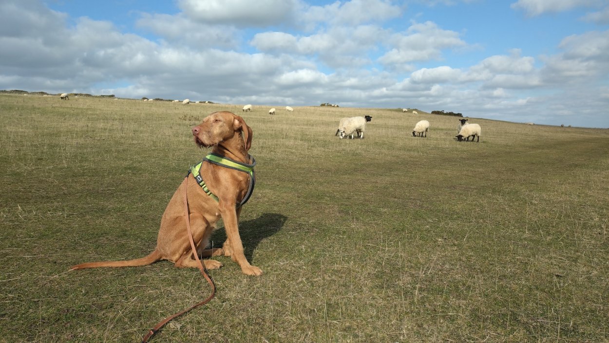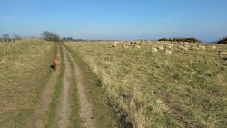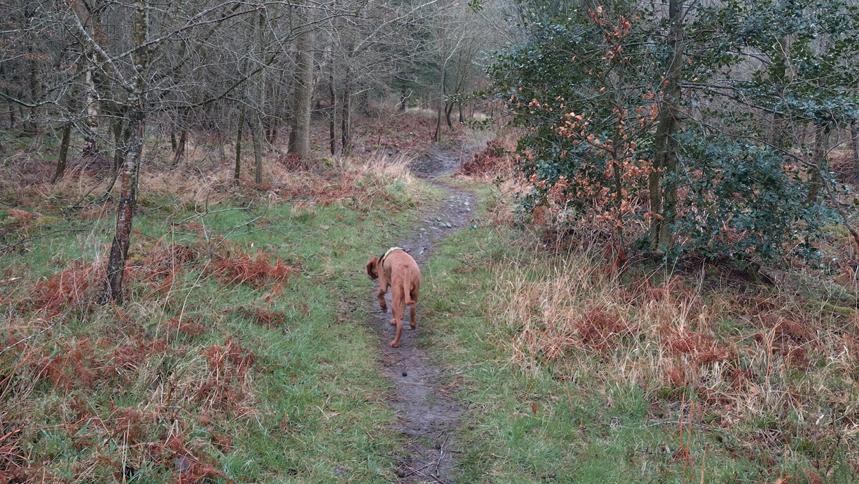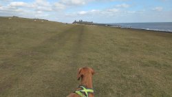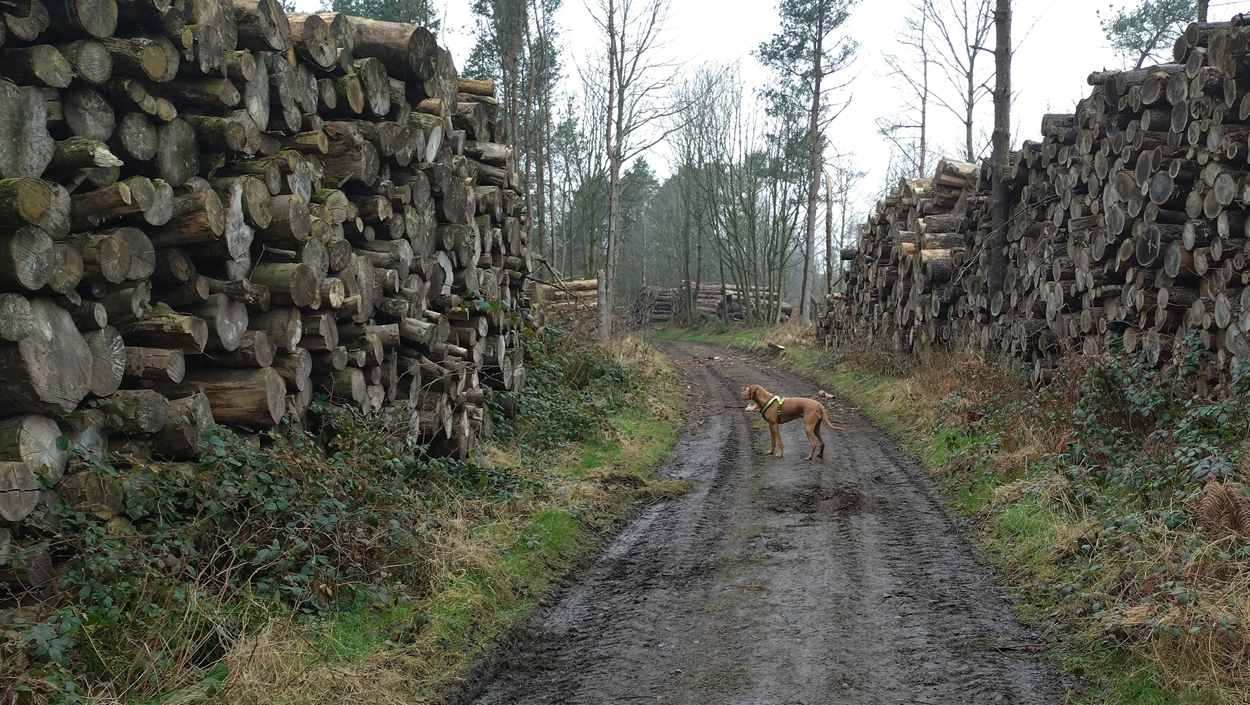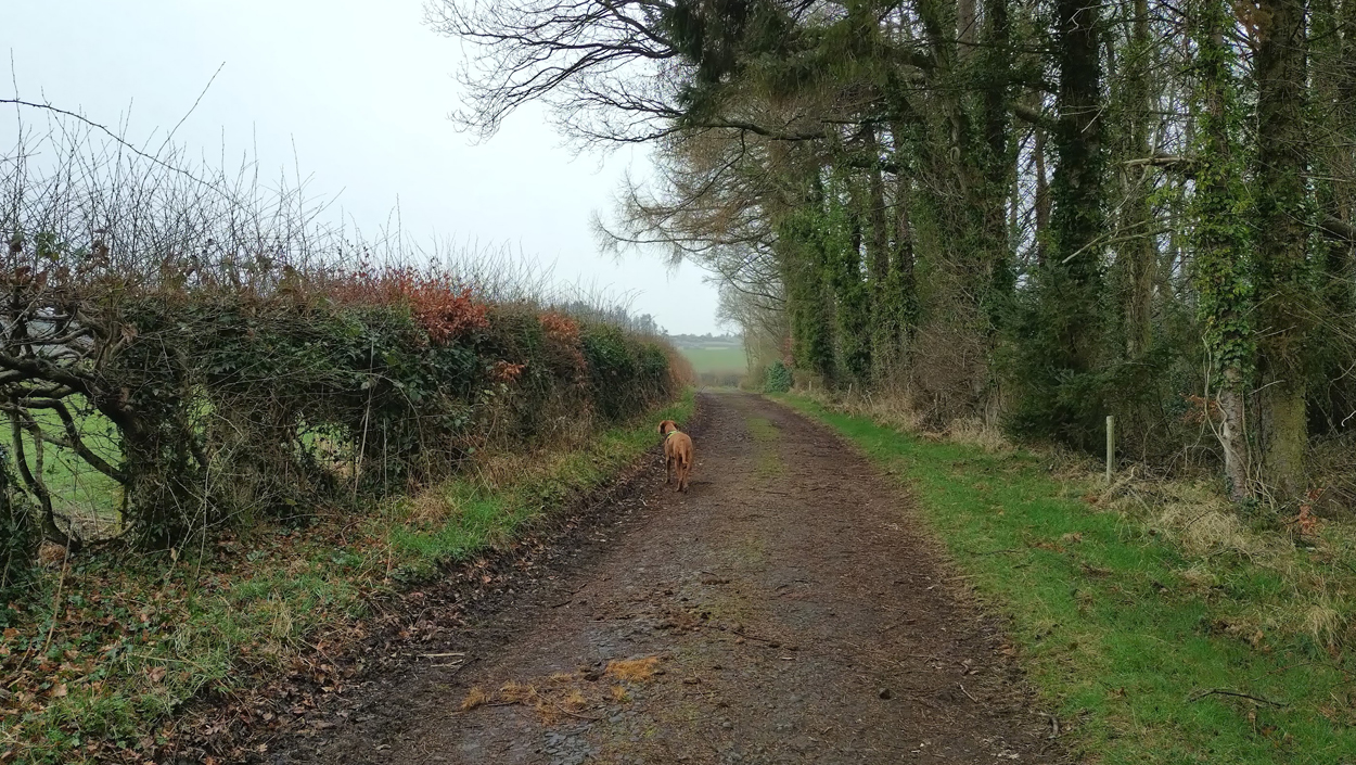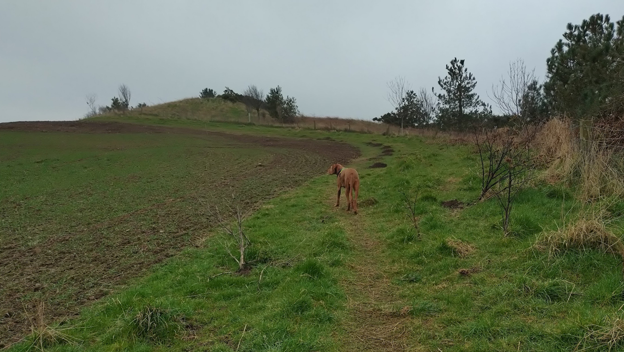 Ik hobbel verder. Tuur naar rechts het weiland in, want zie ik daar nou 2 jagers staan met een geweer? Fleur heeft wel een geel tuigje aan maar niet een geel dekje. Dat deed ik wel vaak met Ziva als we ergens liepen waar geschoten kon worden. Als ik beter kijk, blijkt het een paard te zijn. Fleur weer lekker los dus. De weg gaat aardig op en neer en dat is best zwaar voor dit oudje. Het bos ziet er anders uit dan vorige keer. Echt veel bomen weg helaas. Ik hobbel door, loop ineens langs een watertje met kuifeendjes. Dat herinner ik me eigenlijk niet goed. Verder langs een weiland en aan het einde linksaf. Ik zie later in een verslag van 2016 dat ik voor de lol op dit punt wel eens rechtsaf sloeg voor een extra lusje van 6 km richting Detchant Woods. Gelukkig herinner ik me dat niet meer, pas als ik het oude verslag lees kan ik het me weer voor de geest halen.