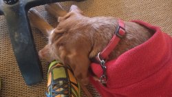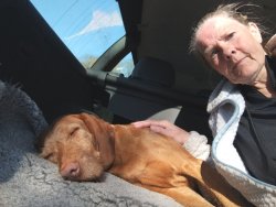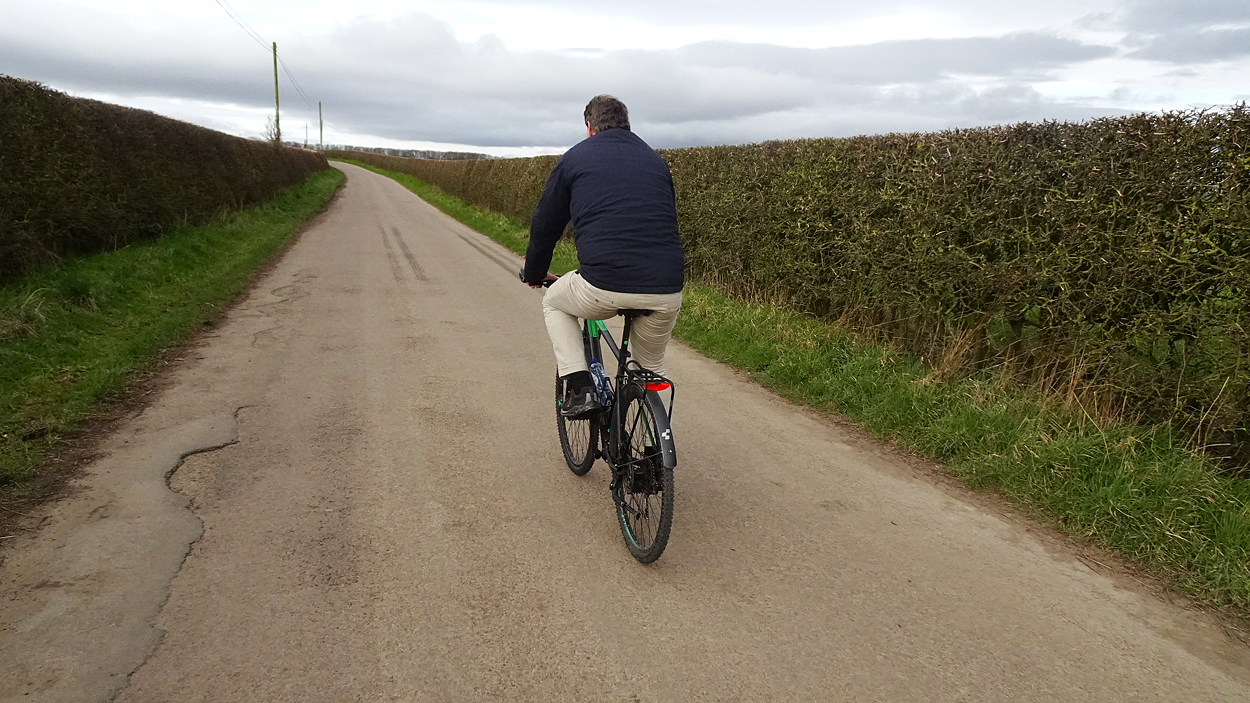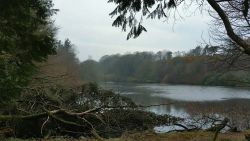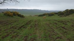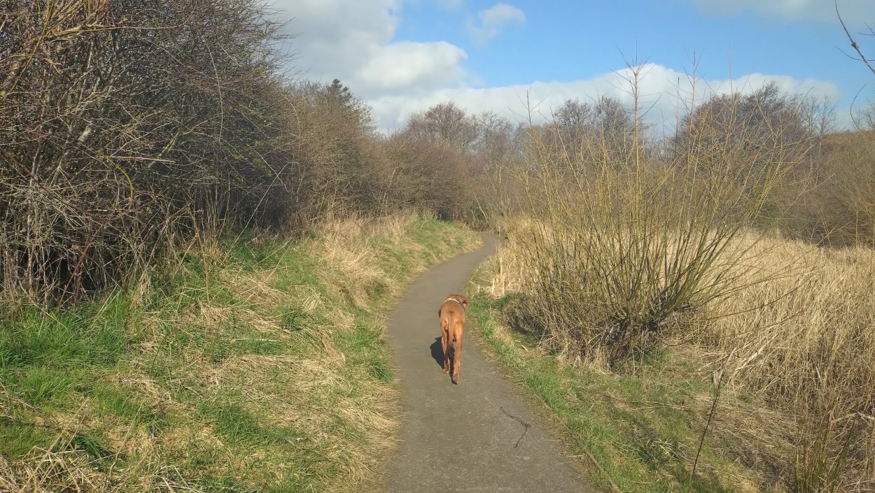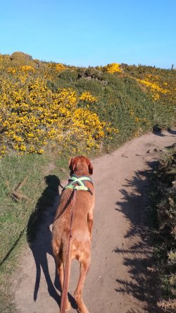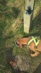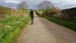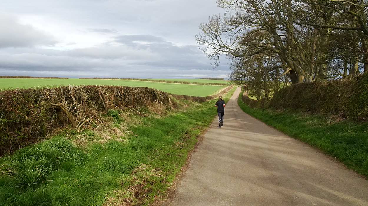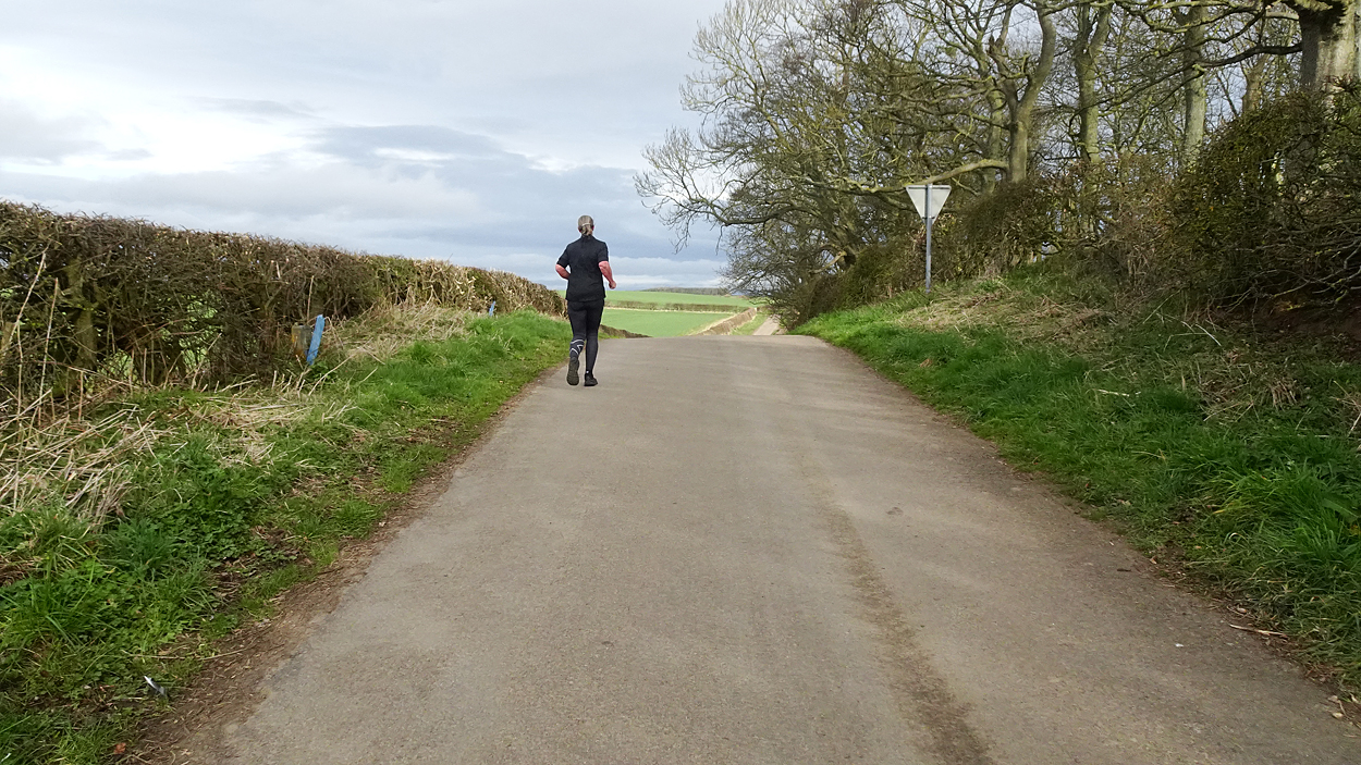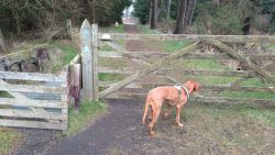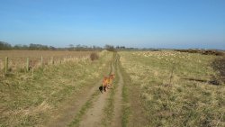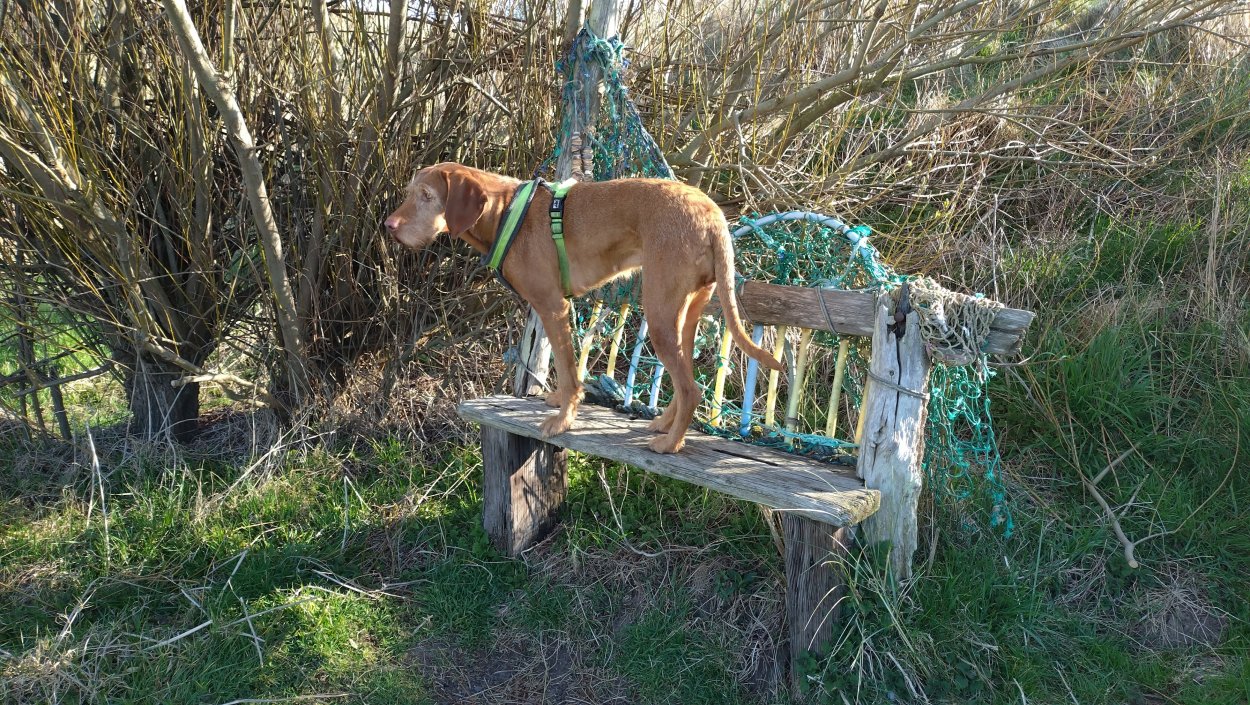 Ik hobbel verder. Tuur naar rechts het weiland in, want zie ik daar nou 2 jagers staan met een geweer? Fleur heeft wel een geel tuigje aan maar niet een geel dekje. Dat deed ik wel vaak met Ziva als we ergens liepen waar geschoten kon worden. Als ik beter kijk, blijkt het een paard te zijn. Fleur weer lekker los dus. De weg gaat aardig op en neer en dat is best zwaar voor dit oudje. Het bos ziet er anders uit dan vorige keer. Echt veel bomen weg helaas. Ik hobbel door, loop ineens langs een watertje met kuifeendjes. Dat herinner ik me eigenlijk niet goed. Verder langs een weiland en aan het einde linksaf. Ik zie later in een verslag van 2016 dat ik voor de lol op dit punt wel eens rechtsaf sloeg voor een extra lusje van 6 km richting Detchant Woods. Gelukkig herinner ik me dat niet meer, pas als ik het oude verslag lees kan ik het me weer voor de geest halen.
