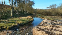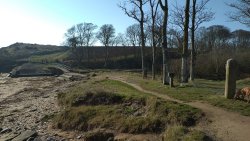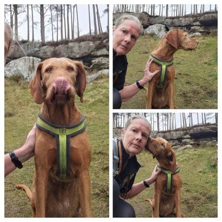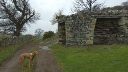 Ik heb het nu al warm dus trek mijn giletje maar vast uit en prop het in de rugzak. Geen regen meer dus petje is ook al af want ik ben echt in no time een hottie. De begin weg valt me niet eens mee zo langzaam omhoog lopend. Fleur vindt alles best. Verderop langs een huis waar al die jaren blaffende honden achter het raam staan. Ook nu weer. Daarna door een hekje langs een bouwwerk waarvan ik nog steeds niet weet wat het is en verder richting een veld. Dat is wel eens heel erg drassig geweest maar nu is het prima te doen. Gelukkig geen enge koeien hier. Via het weiland naar het bos. Daar is het pad lastiger te belopen. Veel keien en uitgesleten paadjes. Ook heel veel bomen gekapt. Echt ongelooflijk. Ik hobbel rustig door. Het begin gaat niet eens zo slecht eigenlijk. Maar het valt me op dat er best veel verharde stukken in het begin zijn. Als ik het bos uit kom ook weer een verhard stuk naar Swinhoe Riding center. Daar kom ik straks ook weer uit maar via een andere weg. Ik loop eigenlijk een soort achtje.