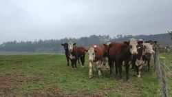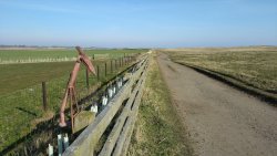 Daarna weer een shit paadje langs het weiland. Grote kuilen en hobbels. Was dit nou echt zo? Verderop een hekje met een bordje dat je moet oppassen voor de stier in het veld. Ook dat nog. Ik denk verderop al een groep koeien te zien. Jakkes. Dat blijkt ook te kloppen want ineens zie ik de koeien dichterbij dan ik wil en ze zijn ook nog eens zo nieuwsgierig dat ze aan komen hobbelen. Gelukkig zie ik het hekje en ren ik er heen. Fleur had net bedacht om een hapje poep te nemen en blijft achter. Ik gil dat ze snel moet komen en dat doet ze. Op tijd gaan we door het hekje. Poeh, ik vind dit dus echt niet leuk. Daarna verder over het weiland.