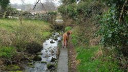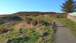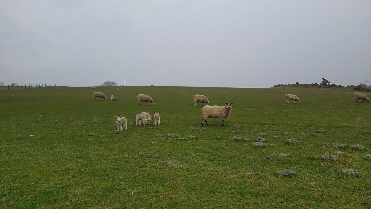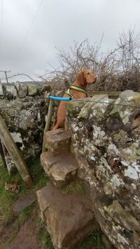 Geen koeien meer, alleen verderop schapen met lammetjes. Daar is ook het muurtje met de step stones eroverheen. Dat wordt nog even puzzelen voor Fleur maar ze snapt wat de bedoeling is en ze klimt eroverheen en wacht op mij. Braaf ding.
