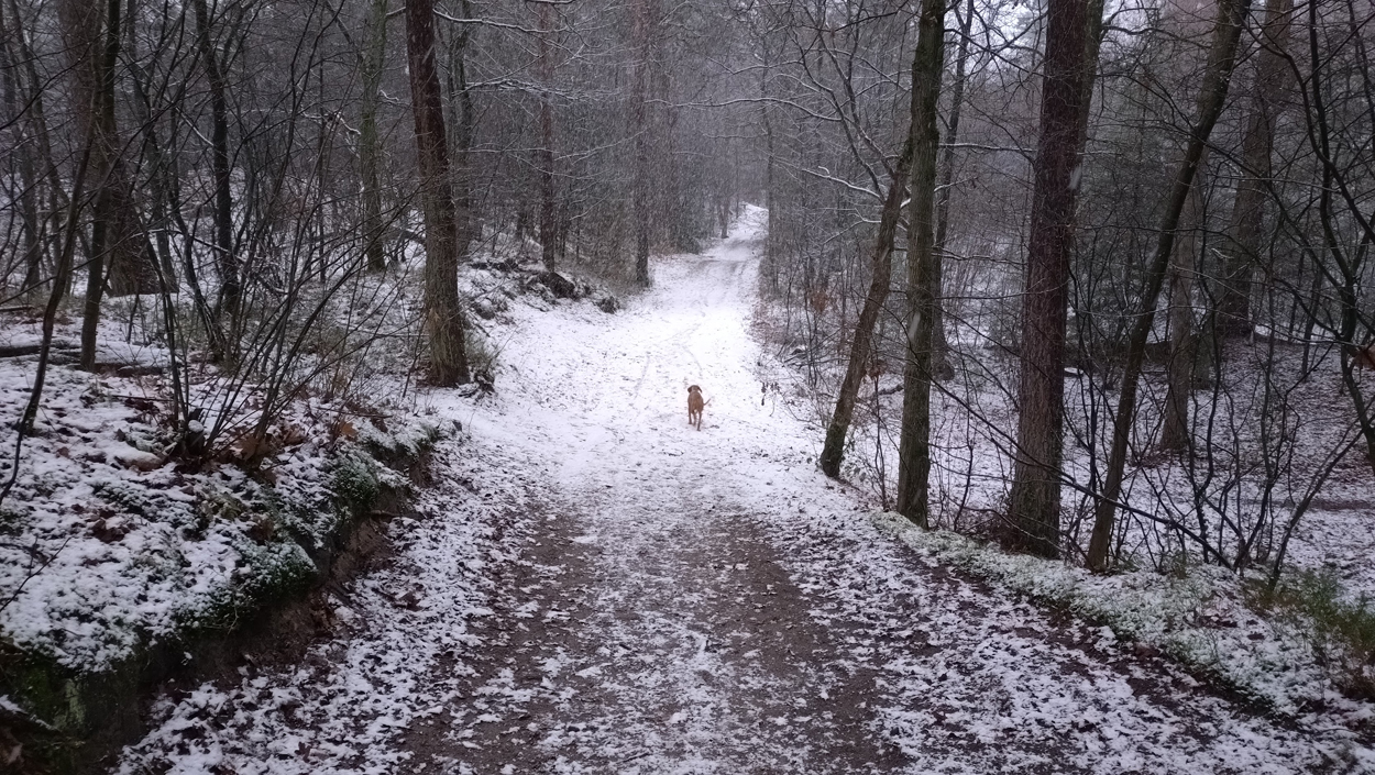 Vandaag weer op pad voor een rondje. Er ligt ineens sneeuw en dat is wel mooi maar ook erg lastig. Maar goed, ik ga met mijn Mafate Speedjes maar gewoon op pad. Rugzakje om en weg. Als ik 600 meter heb ingewandeld aan de overkant, besluit ik maar gewoon te gaan hardlopen hier zodat Fleur los kan blijven lopen. Ik zat net te vertellen over Hitland maar kijk eens waar ik nu loop. Gewoon lekker bos waar Fleur ook los kan lopen. Huppakee dus. En ja, het is druk en ja, het loopt klote. Maar ik doe gewoon mijn best en doe 2 rondjes die ongeveer hetzelfde zijn en loop daarmee een 1.200 meter langer looprondje dan dat ik aan de overkant gedaan zou hebben.