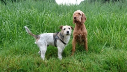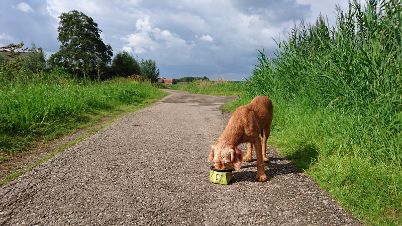 Het zonnetje blijft aanwezig en ik besluit woefje dan maar te laten zwemmen om wat af te koelen want ze doet vreselijk zielig alsof ze het erg warm heeft. Ze kijkt wel heel blij en loopt lekker mee. Maar als ik dan eindelijk bij het watertje aankom, is het toch ineens weer grijs en bewolkt. Bovendien kan ik ook geen stokje vinden om weg te gooien voor woef, dus ik besluit nog eenmaal de lange arm te lopen en dan terug te gaan. Zo warm is het niet meer met de bewolking. We lopen dus nog een paar kilometer en gaan dan terug.