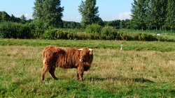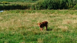 Na een tijdje neem ik afscheid en ga weer verder. Na de warming up ga ik starten en het is nog steeds best frisjes, ook tijdens het lopen. Maar natuurlijk warmt het toch wel op en als je eenmaal loopt, word je vanzelf warm. Mijn giletje gaat dus uit en we hobbelen rustig voort. Even de lange arm richting de dijk en dan richting de kalfjes. Er staat een kalfje redelijk dichtbij maar als ik eens goed kijk, verbaas ik me over het formaat(je) en pas dan zie ik de andere twee grotere kalfjes. Nummer 3 staat in de wei! Helaas weer een stiertje dus die gaat ook weer weg net zoals de twee andere kalfjes. Jammer! Inmiddels komt ook ineens de zon krachtig tevoorschijn. Dat is nou net niet de bedoeling en ook niet leuk voor woef die meteen begint te hijgen. We lopen even offroad via het ooievaarspad. Dat loopt voor haar wel lekker zo door het natte gras.