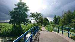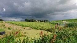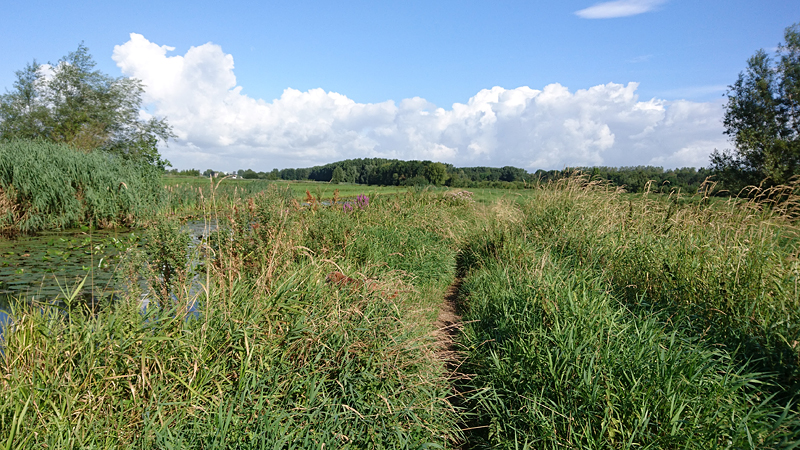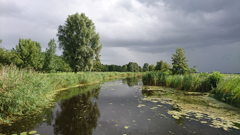 Ik slinger weer wat door het natuurgebied en eigenlijk gaat het lopen wel heel goed. Woef doet het ook goed en krijgt tweemaal wat water van me. De lucht is prachtig. De ene keer diep grijs maar dan weer blauw en zonnig. Het is nog steeds droog maar ik ben benieuwd of het nog gaat regenen.