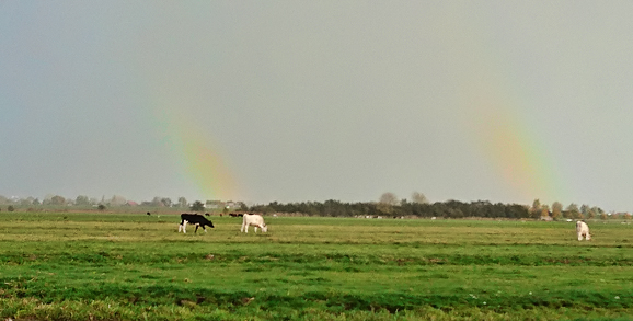 De luchten zijn vandaag prachtig en ik word getrakteerd op verschillende regenbogen. Ik probeer met mijn telefoon een kiekje te maken maar tegen de tijd dat ik het ding uit de belt heb gepeuterd is het mooie licht alweer weg.