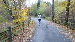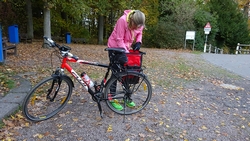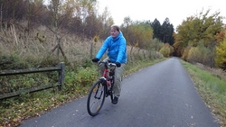 We lopen verder en zijn verrast dat er zo weinig mensen lopen. Een verdwaalde fietser en dat is het eigenlijk. S. doet het ook goed op de fiets en het is niet moeilijk qua ondergrond of stijgingspercentage. Heerlijk fietsen zo! Ik heb inmiddels al lang mijn jasje uit en loop dus alleen in mijn shirtje.