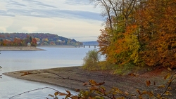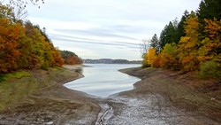 Het water staat ontzettend laag, veel lager dan de vorige keer toen het bekken helemaal gevuld was. De weg loopt en fietst makkelijk omdat het een gewoon pad is en geen off road gebeuren zoals ik in 2011 koos. We zijn blij dat we deze route nu doen want het is weer eens iets anders dan alleen maar bos. We wijken even af richting een offroad pad waar we beter uitzicht hebben op de Sperrmauer maar dat blijkt een heel raar hobbelig pad te zijn dus na de foto’s keren we om en nemen de gewone weg weer verder. Dat is prachtig en we genieten van de kleurtjes van de bomen. Veel meer kleur dan vorig jaar! Even verderop hebben we weer een mooi uitzicht op het meer. Natuurlijk weer een kiekje.