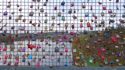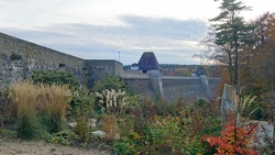 Vol goede zin gaan we op pad. We lopen nu eerst over de Sperrmauer omdat het op de terugweg donker zal zijn. Het uitzicht is mooi ondanks dat het geen zonnige dag is en er zijn nog volop herfstkleuren te zien. Het is droog en er staat geen wind dus dat is fijn lopen. Aan het begin van de Sperrmauer zitten slotjes op een hek. Grappig om te zien.