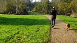 Aan het einde slaan we linksaf en daar kan wafje ook uit de doggyride. Met de fiets sla ik normaal rechtsaf en dat is eigenlijk ook beter om te lopen. Parkeren bij het pontje en dan dat gebied gebruiken voor de run. Het Loetbos waar we nu staan is eigenlijk te klein voor een beetje afstand.