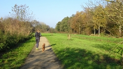 Aan het einde van het fietspad slaan we linksaf om daarna het stukje door het Loetbos te gaan lopen. Het is een beetje onrustig rondje en we schieten ook niet zo op. Uiteindelijk lopen we door het Loetbos en dat gaat wel redelijk goed. Tot onze verrassing hobbelt er ineens een dier over de weg. Het is vrij groot en donker. De gang van een otter zo hobbelend wat het natuurlijk niet is. Veel te groot voor een wezeltje, een hermelijntje is anders gekleurd. Wat is het nou? We hebben het dier heel goed kunnen zien omdat het eigenlijk vrij traag overstak. Volop beeld maar we hebben geen idee. Thuis maar eens opzoeken. Ik gok op een bunzing maar ik weet het echt niet.